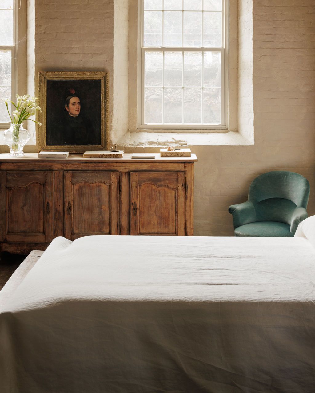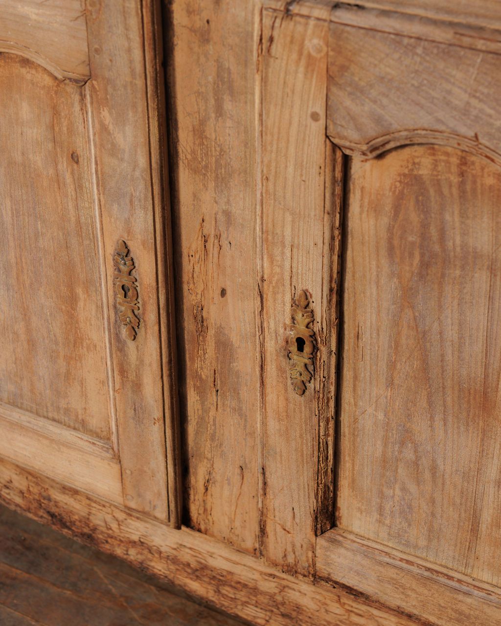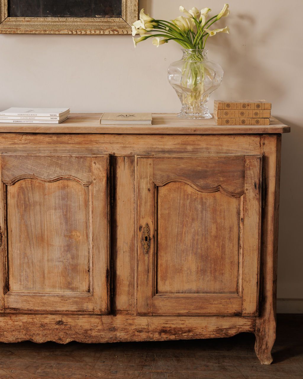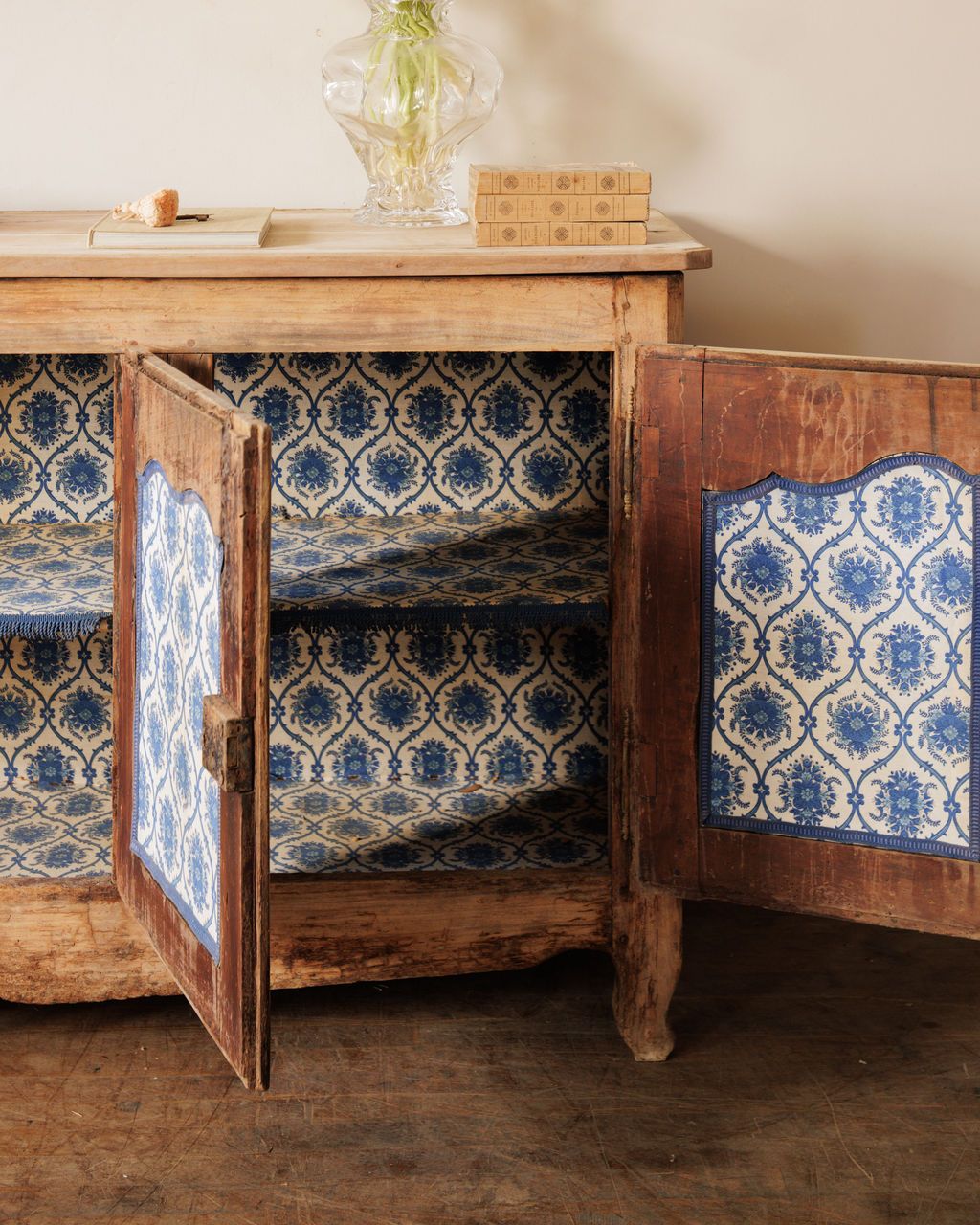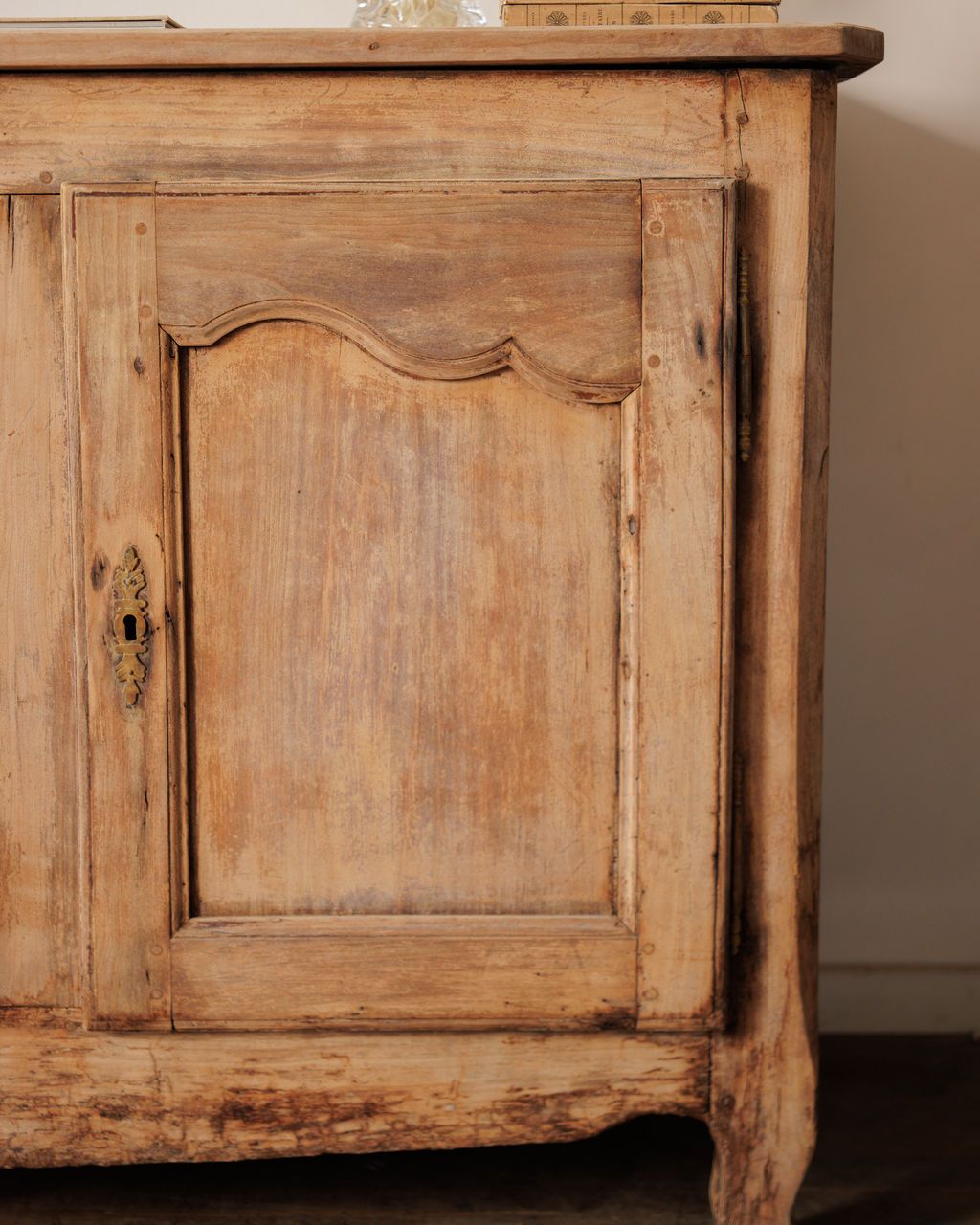 Made when furniture was expected to serve generations, not seasons. Found in Avignon and originally from a bastide near Mouriès, this early 20th-century French buffet shows the refined simplicity of Provençal craftsmanship. The three paneled doors are gently arched, the wood worn to a soft matte tone that still carries traces of old wax and handwork. Inside, blue floral fabric lines the shelves in a charming contrast to the pale exterior, a detail that feels distinctly French. It still has its original key, which still functions. Sylvie keeps hers filled with linens and a mix of antique and hand made ceramics.