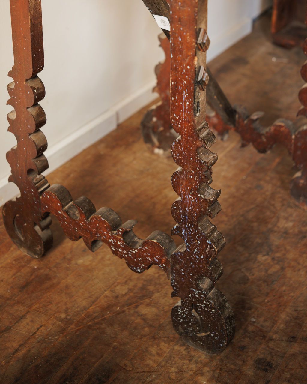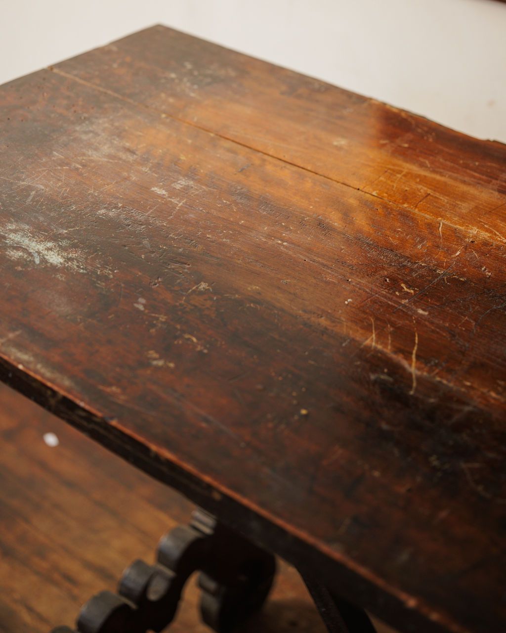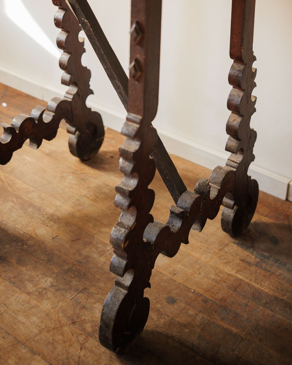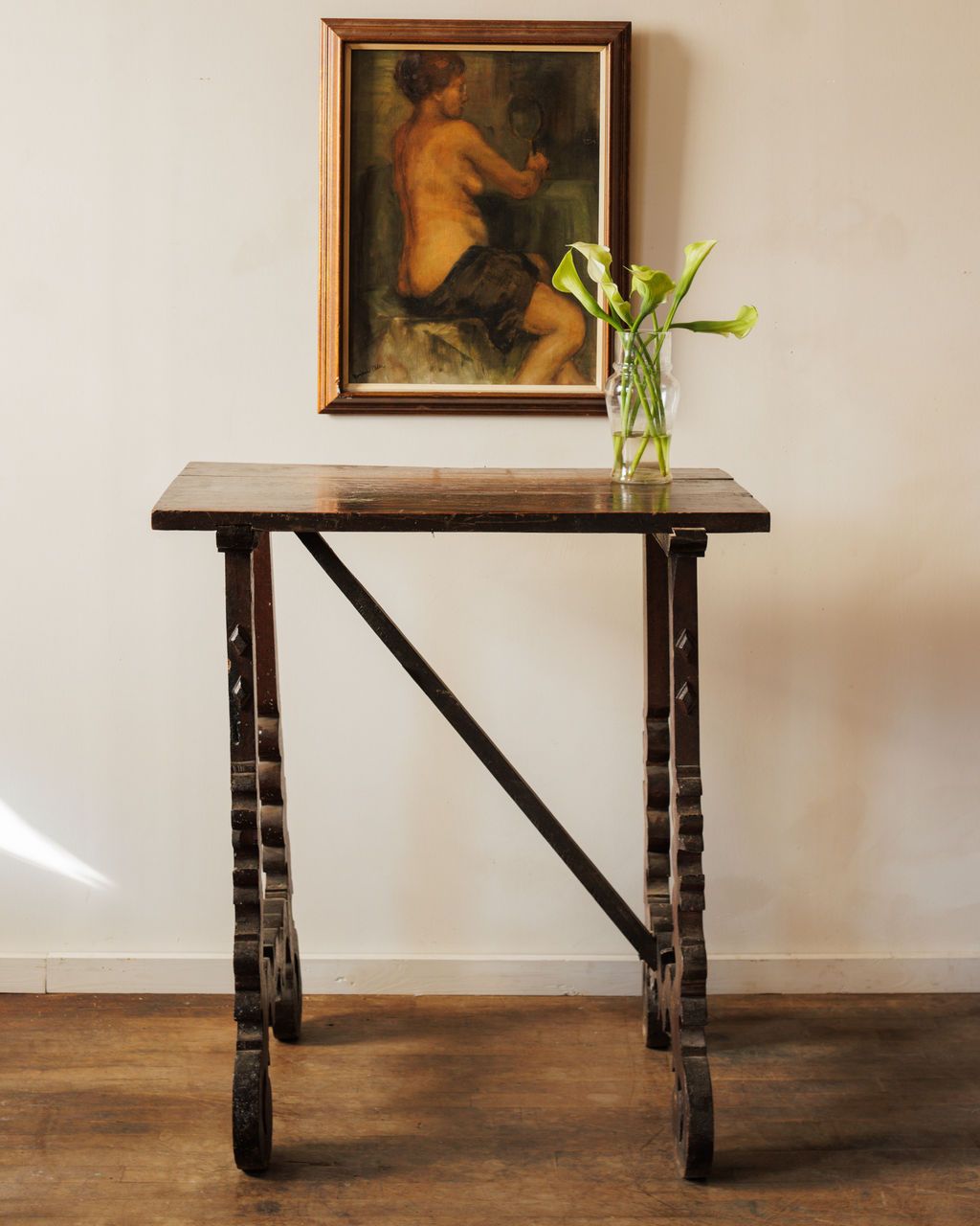 Built for standing conversations and late-night refills, this tall Spanish table knows how to hold its own. This 19th-century Spanish table, found near Girona, is all sculptural curves and deep patina, carved from solid wood that’s aged beautifully over time. Once used as a serving or standing table, it now fits perfectly in a modern kitchen nook or entryway, where its height and narrow form feel effortlessly right. Sylvie actually loves this as a standing desk! The legs have a slight wiggle, which can be corrected when you scoot the legs out at an angle.