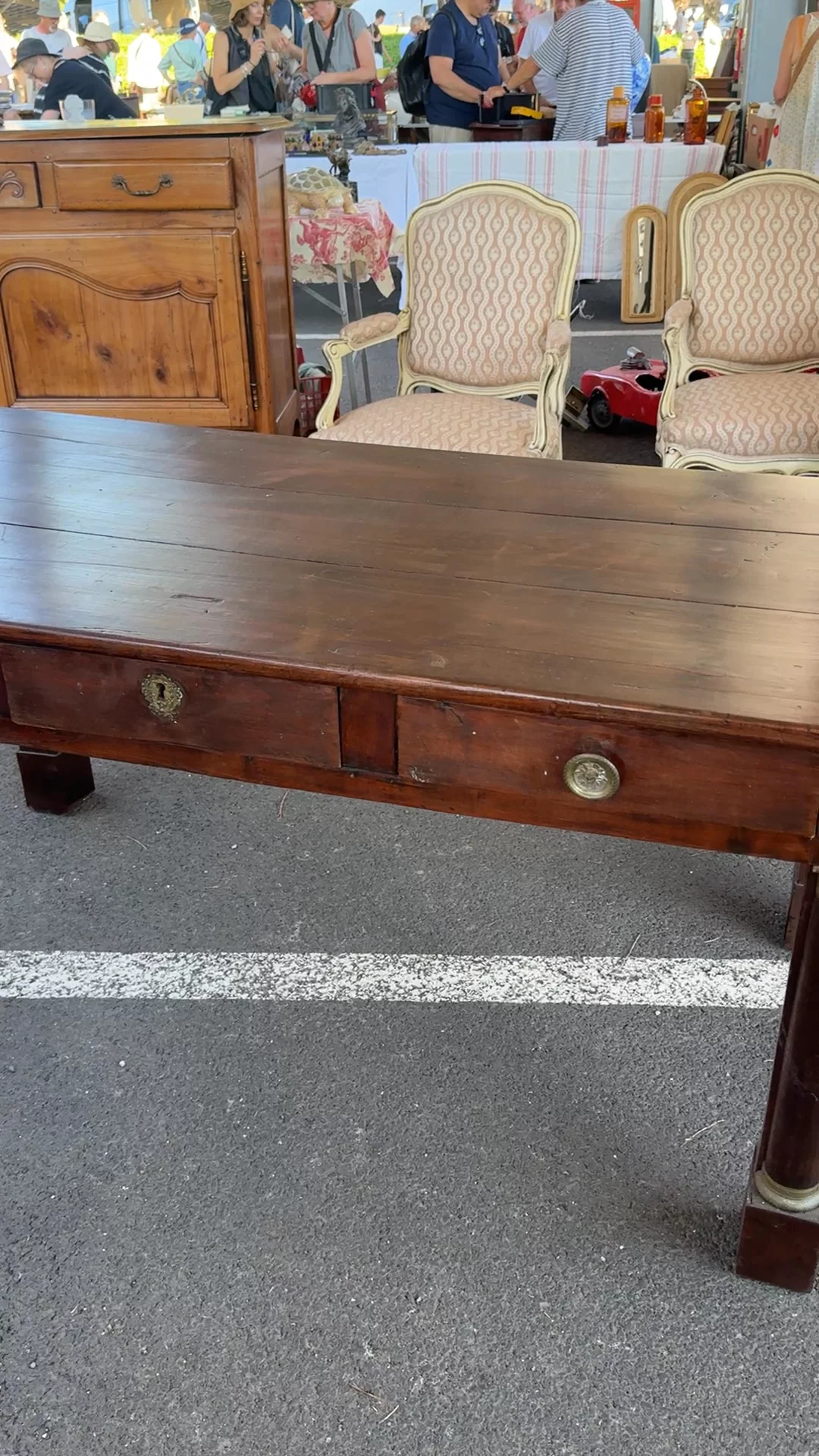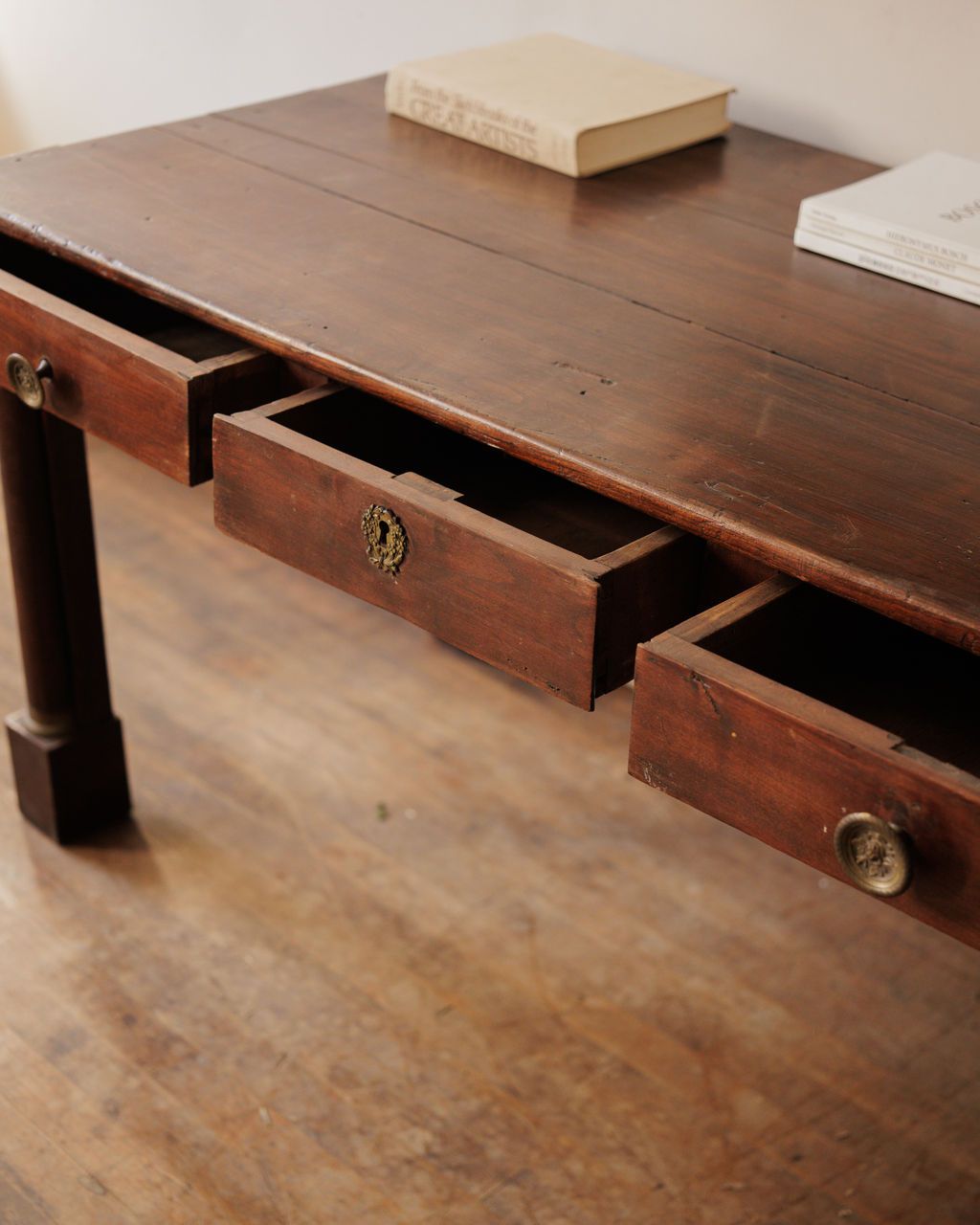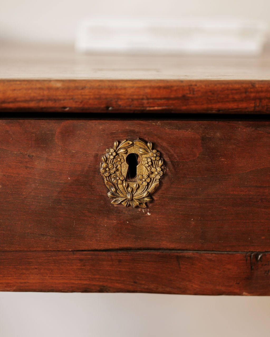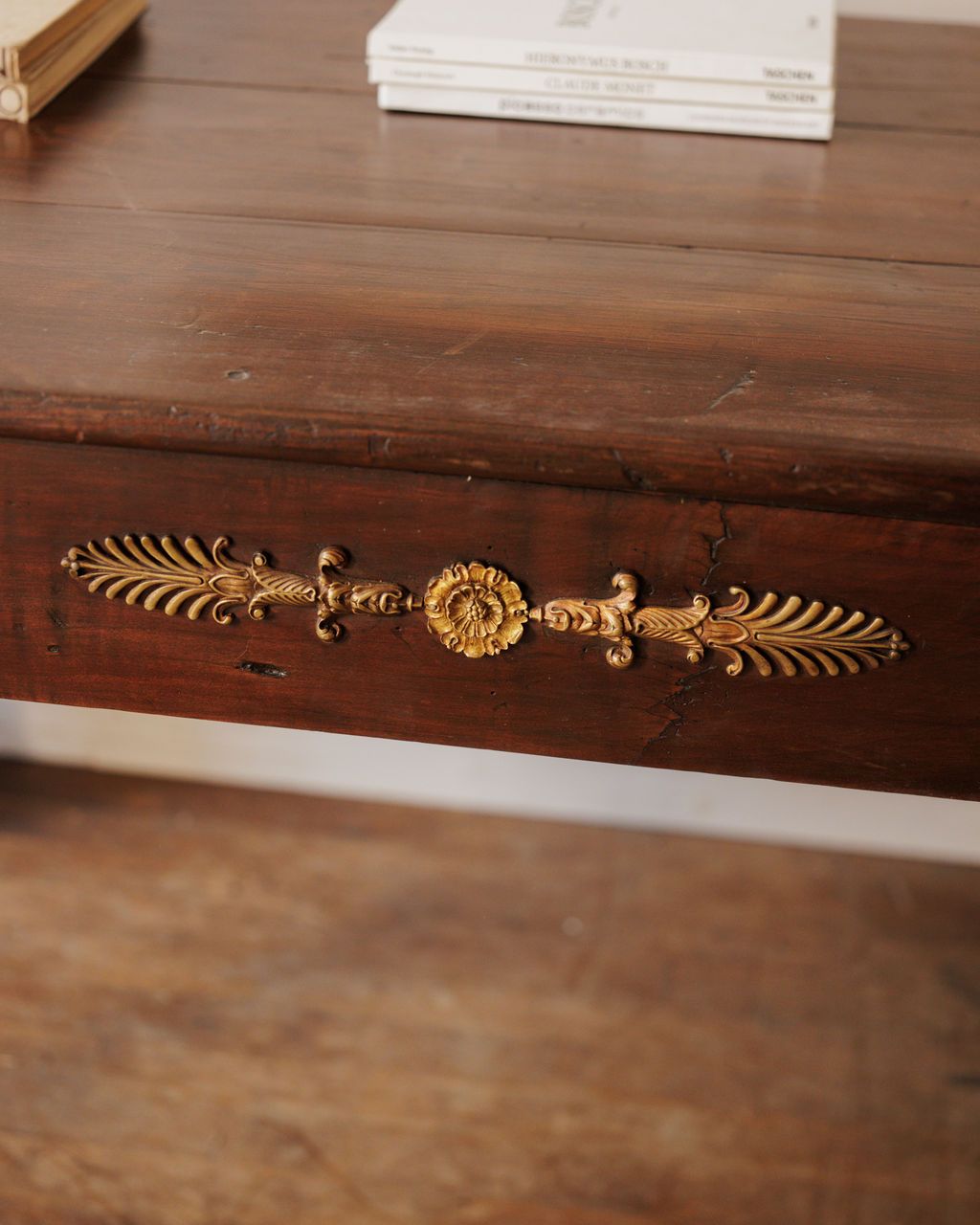 Fit for a modern emperor. This Napoleon III writing table, found in Avignon, dates to the mid-19th century and carries the refined symmetry and bronze ornamentation emblematic of the Second Empire. The style, championed under Emperor Napoleon III, merged classical austerity with decorative flourish, a favorite among French bureaucrats, poets, and salon intellectuals alike. Crafted from dark-stained walnut with brass mounts and two petite drawers, it was built for both elegance and endurance. Sylvie imagines it once held stacks of correspondence and ink-stained love letters; now, it’s ready for laptops and late-night ideas, with just the right air of old-world authority.