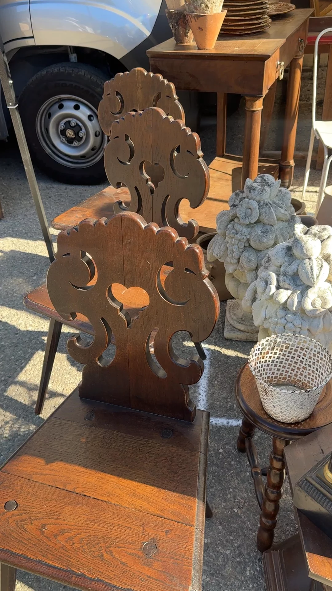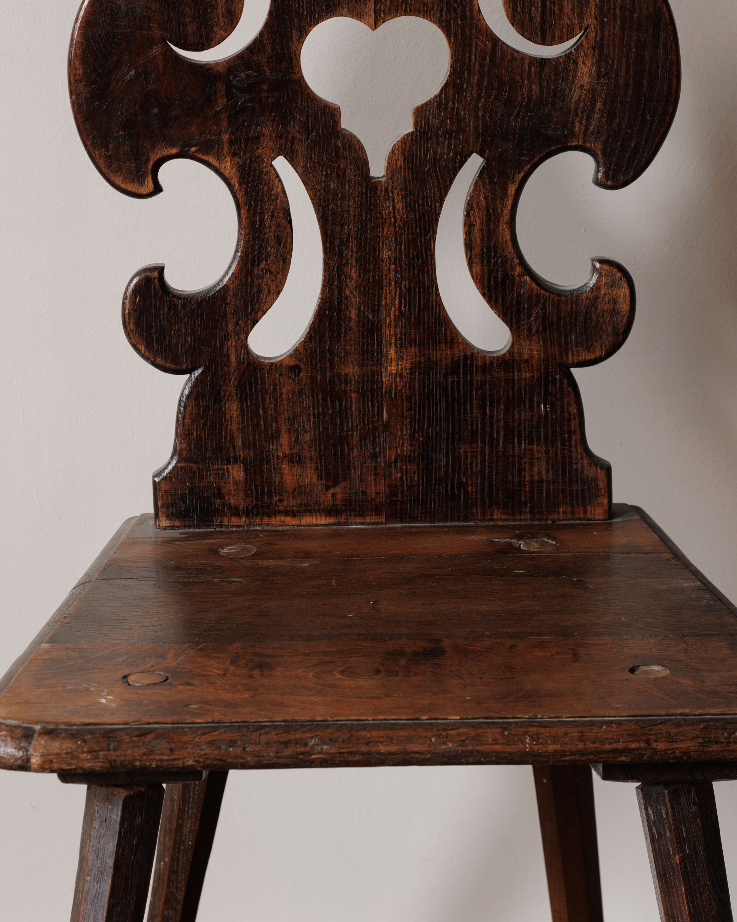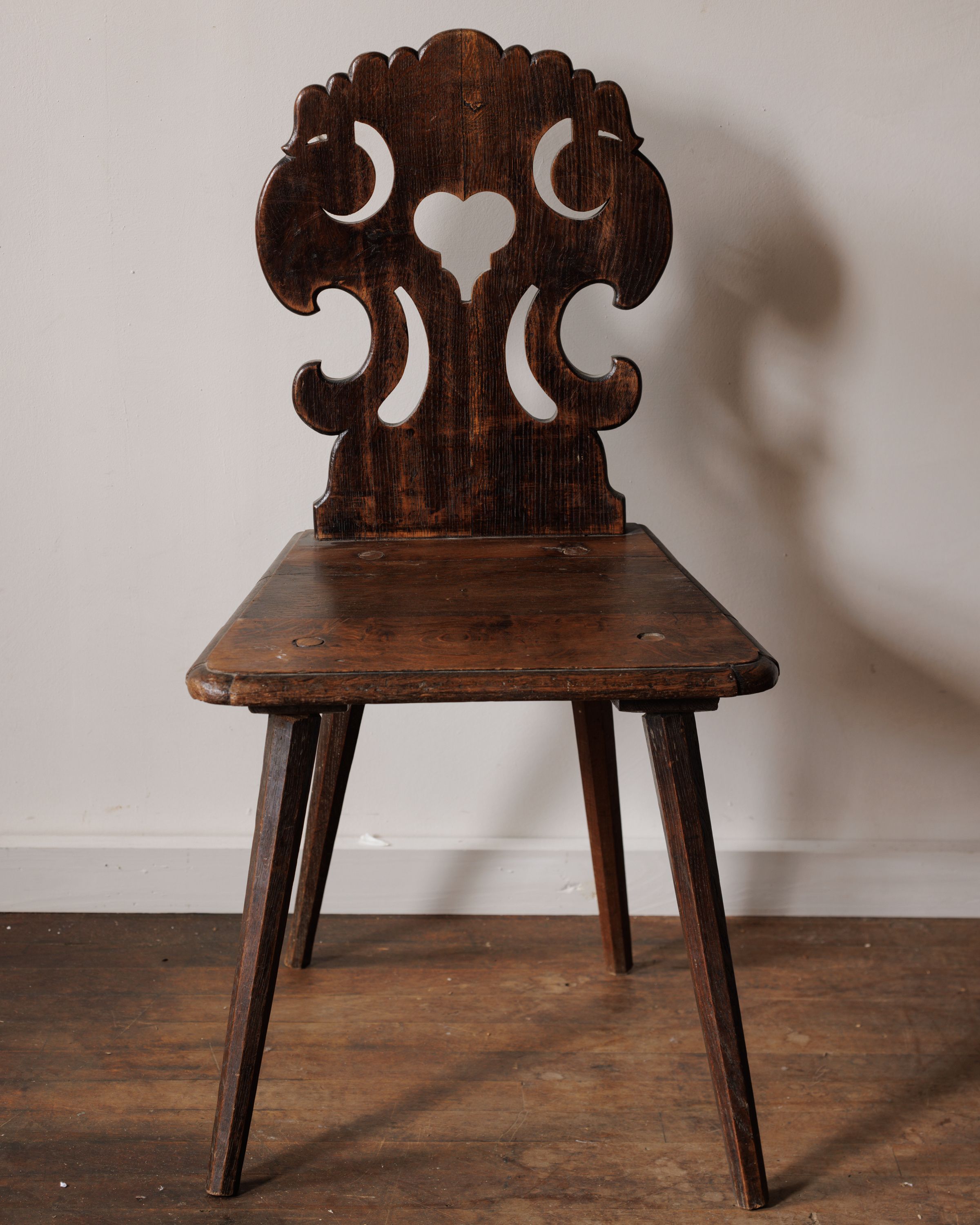 A true Sylvie favorite! This early 1900s Alsace chair, found in Béziers, shows off its sculpted back with bold cutouts, a hallmark of Alsatian folk carving that often blended whimsy with practicality. Chairs from this region were more than just seating: they carried the artistic language of rural France, with stylized motifs and silhouettes that reflected local identity and craftsmanship passed down through generations. The dark oak seat and tapered legs bear the marks of daily life while still holding strong over a century later. We have three available, sold separately, and Sylvie imagines them gathered around a farmhouse table, set in a hallway as sculptural accents, or pulled into a study where their folk-art silhouettes add character far beyond their size.