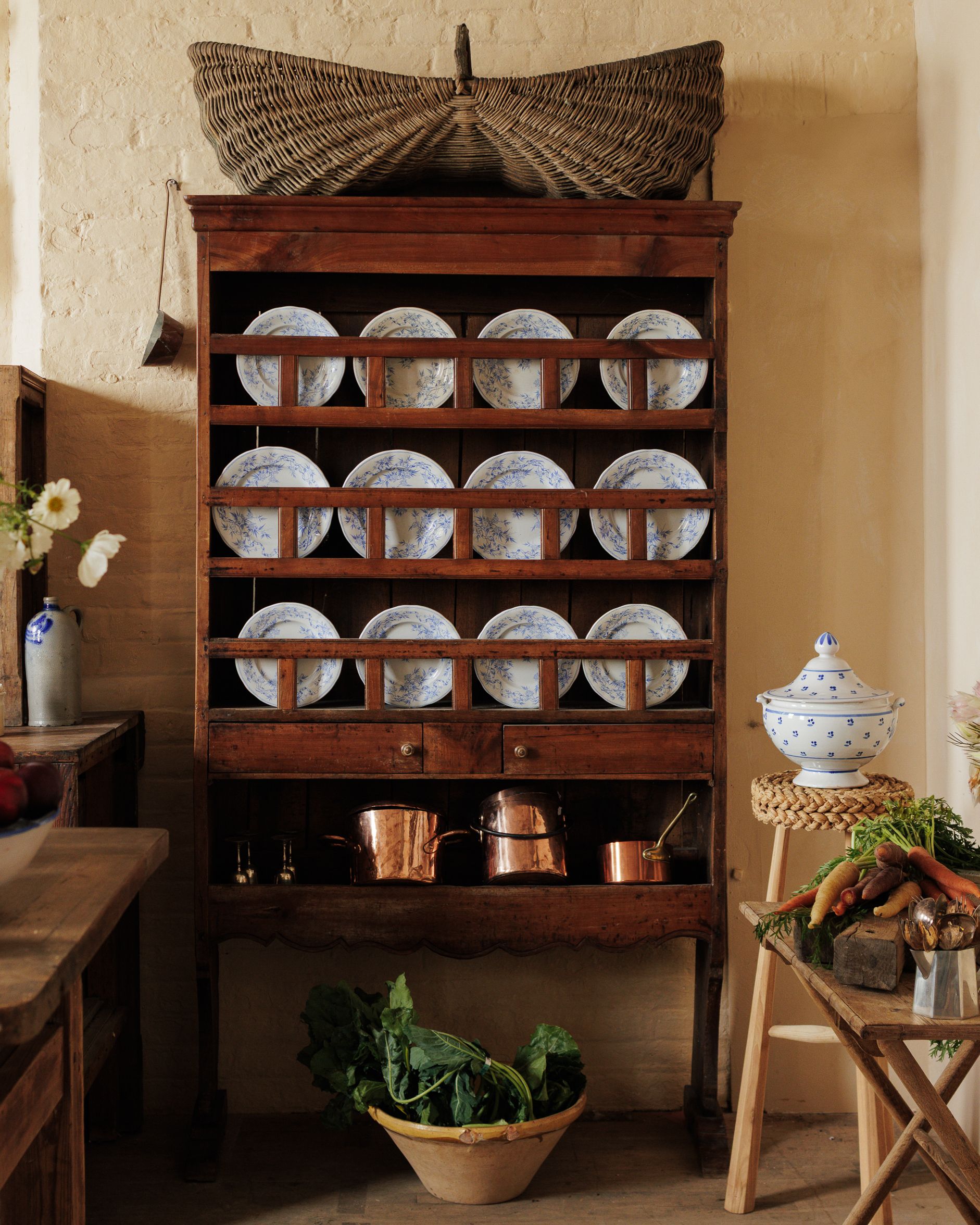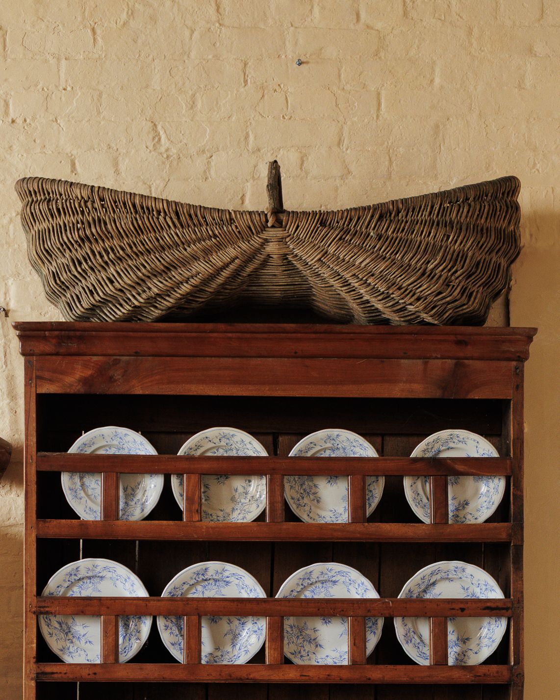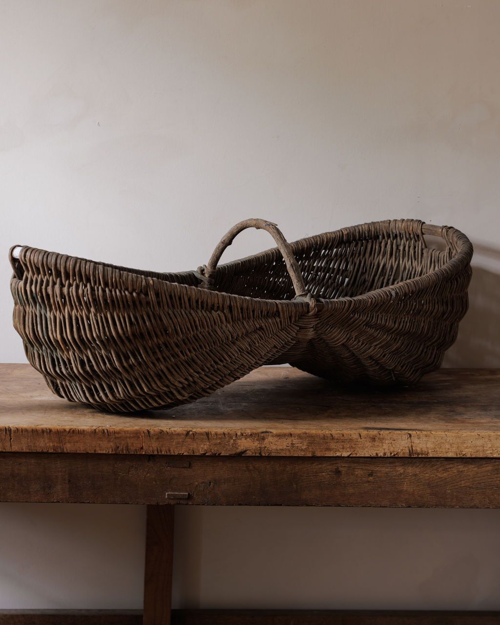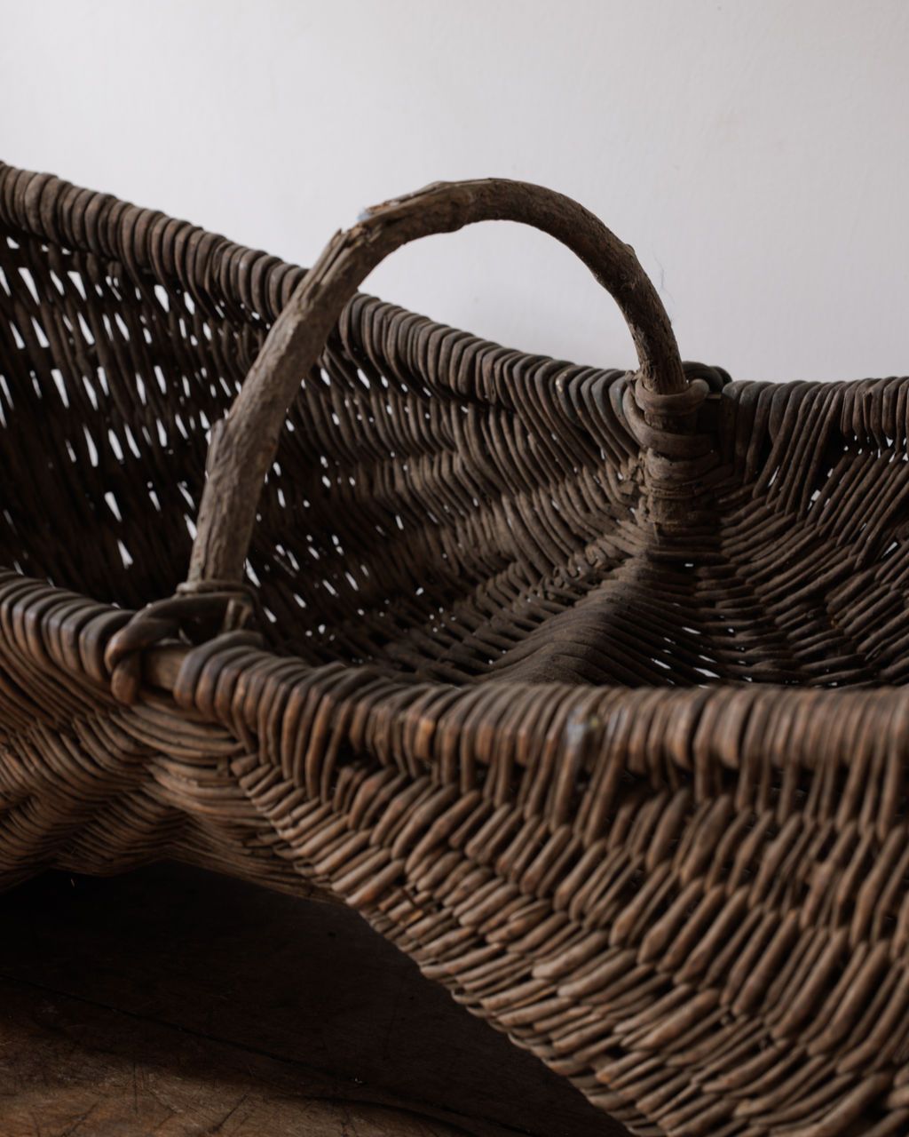 This grape harvesting basket was handwoven in Normandy in the 1920s from wicker over a wooden frame, finished with a curved bamboo handle. It once carried grapes and apples through the orchards and vineyards of northern France. The wicker has softened into a greyed, weathered surface after decades of use, giving it a beautifully aged finish. Sylvie likes it overflowing with blankets on top of a cabinet or leaned casually in a corner.