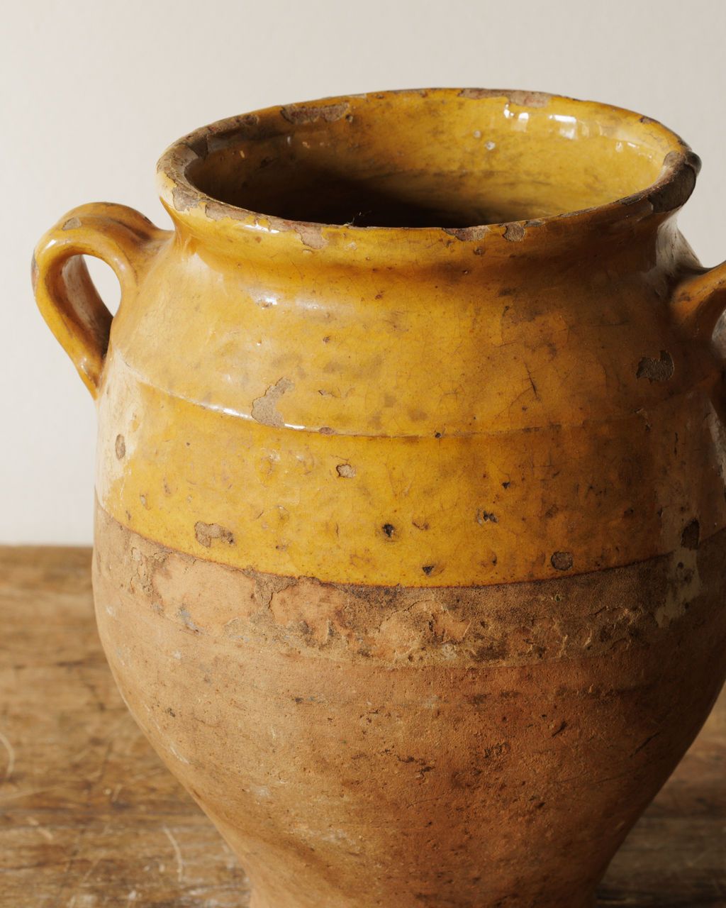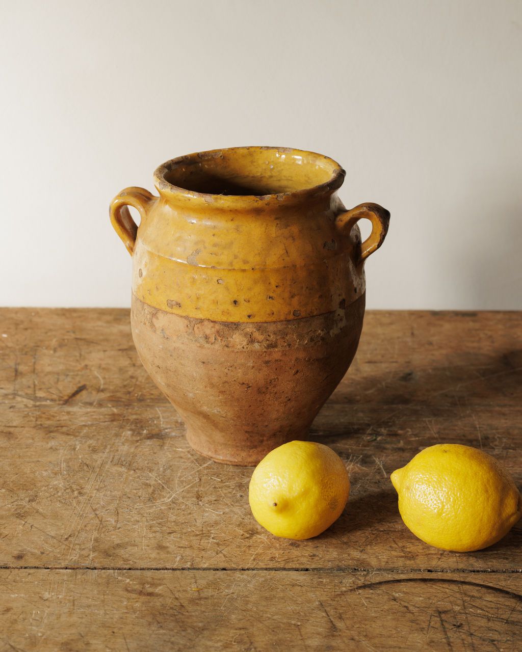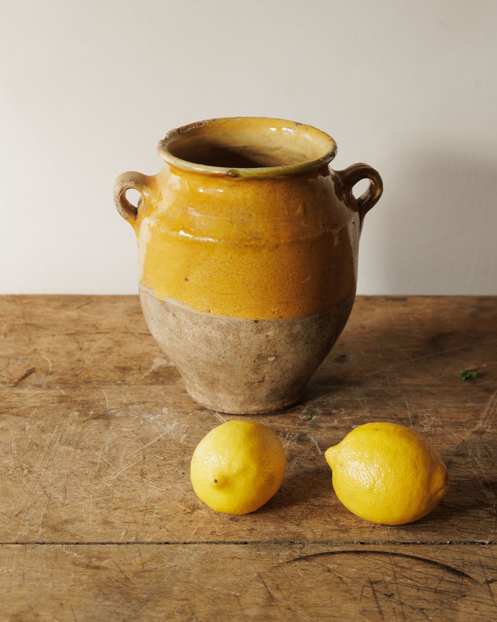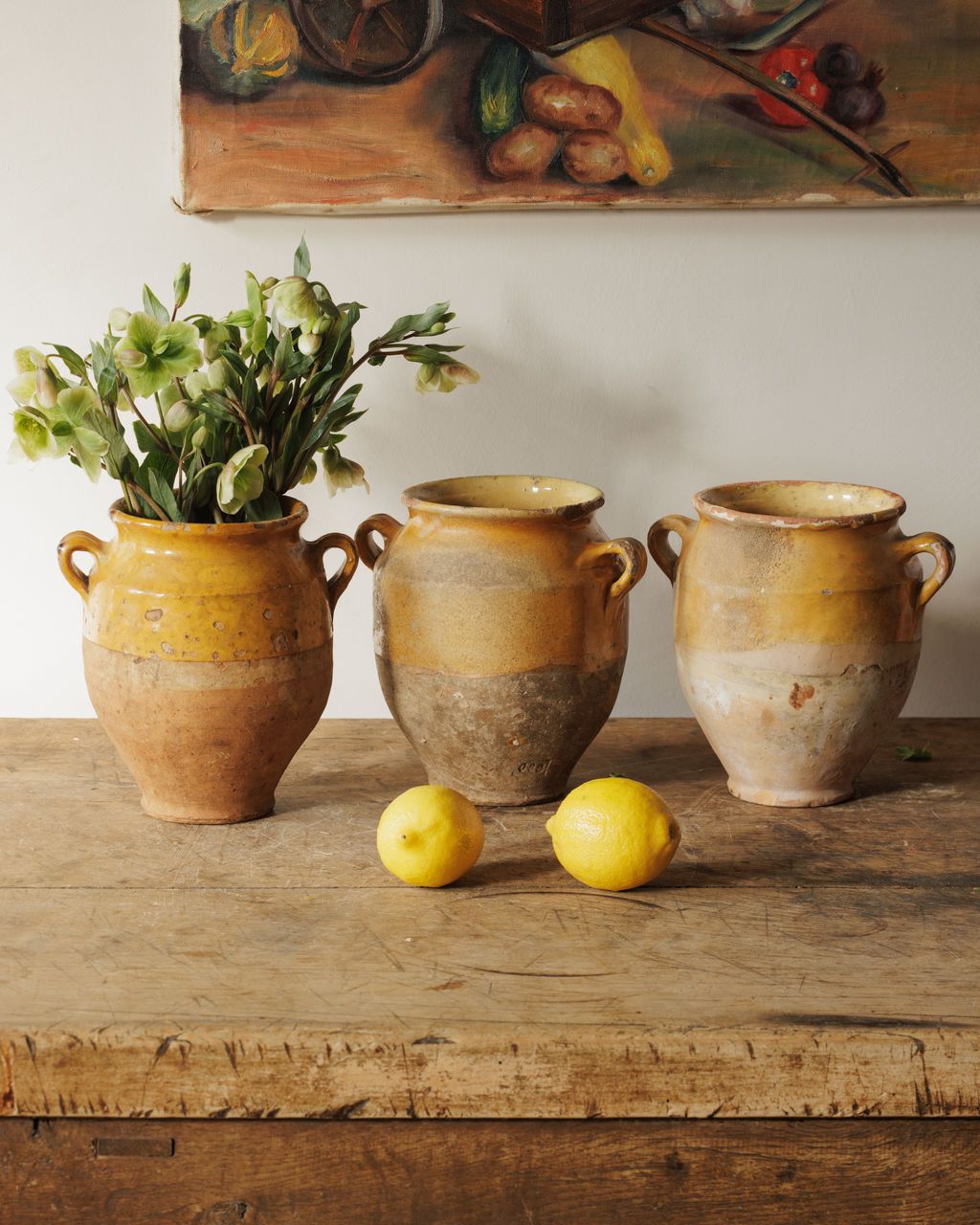 These petite yellow confit pots are the kind you almost never see in this smaller size, which is exactly why we grabbed them. Traditionally used in French kitchens to store preserved meats under fat, they have that perfect everyday shape: rounded belly, sturdy little handles, and a warm yellow glaze that’s worn in all the right places from real use. The name comes from the French verb confire, meaning “to preserve,” which is basically their whole job. Sold individually (left, middle, or right), they’re an easy way to bring a bit of old French pantry life onto your shelves, whether you use one as a utensil crock or just let it sit pretty on the counter. Exactly as pictured.