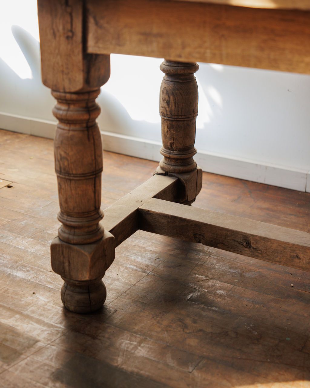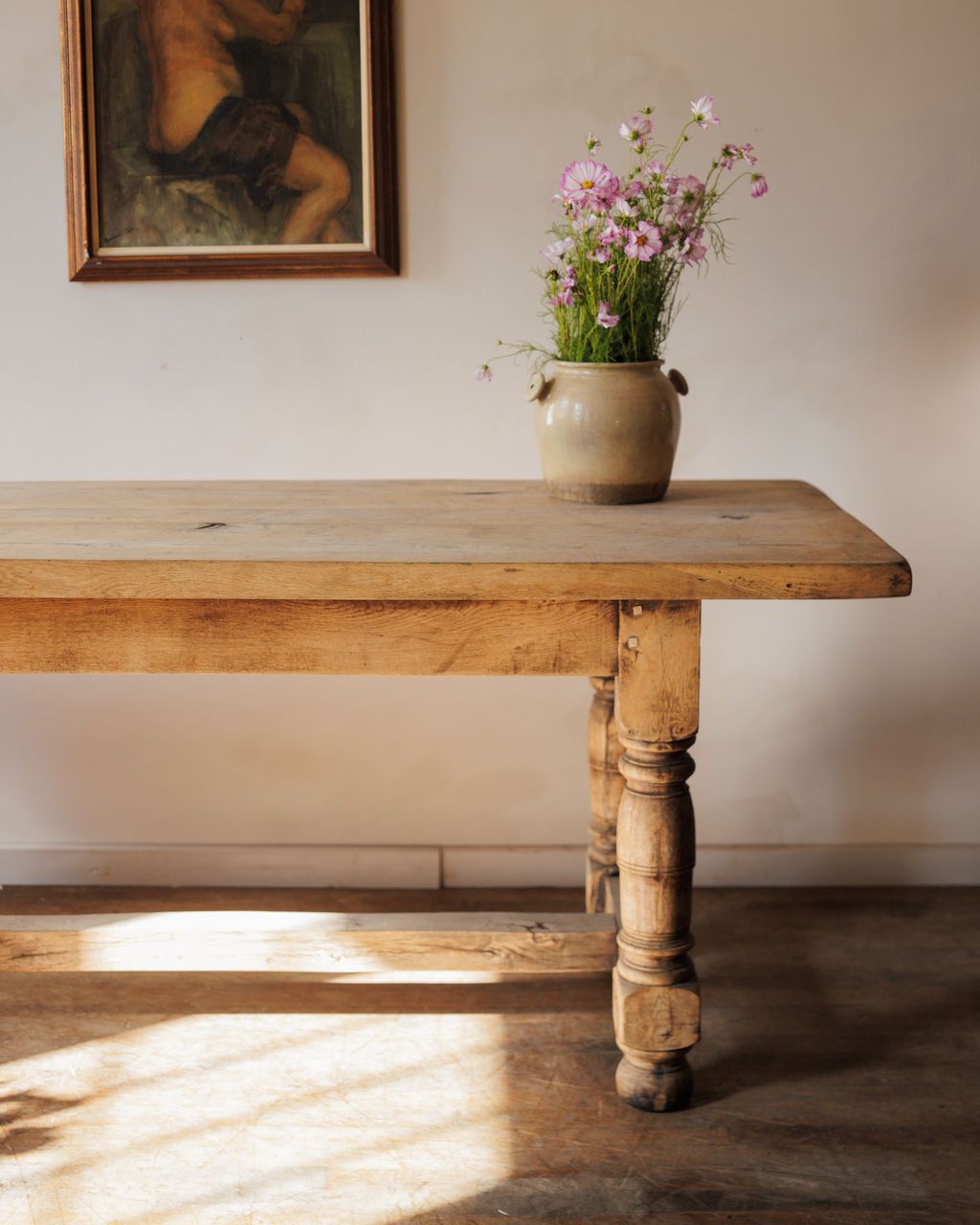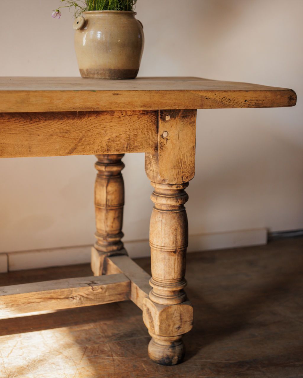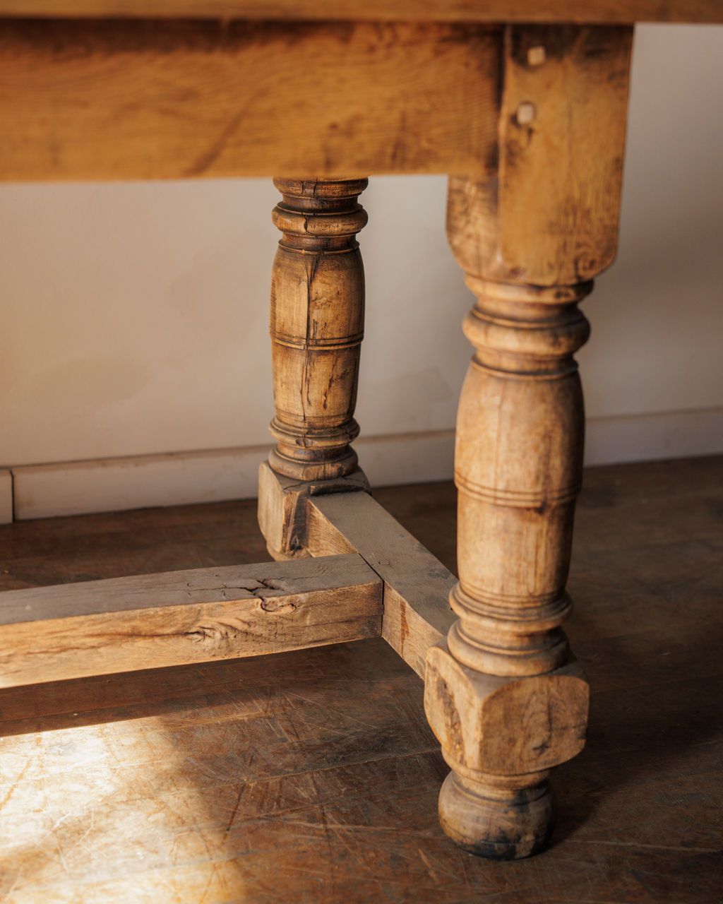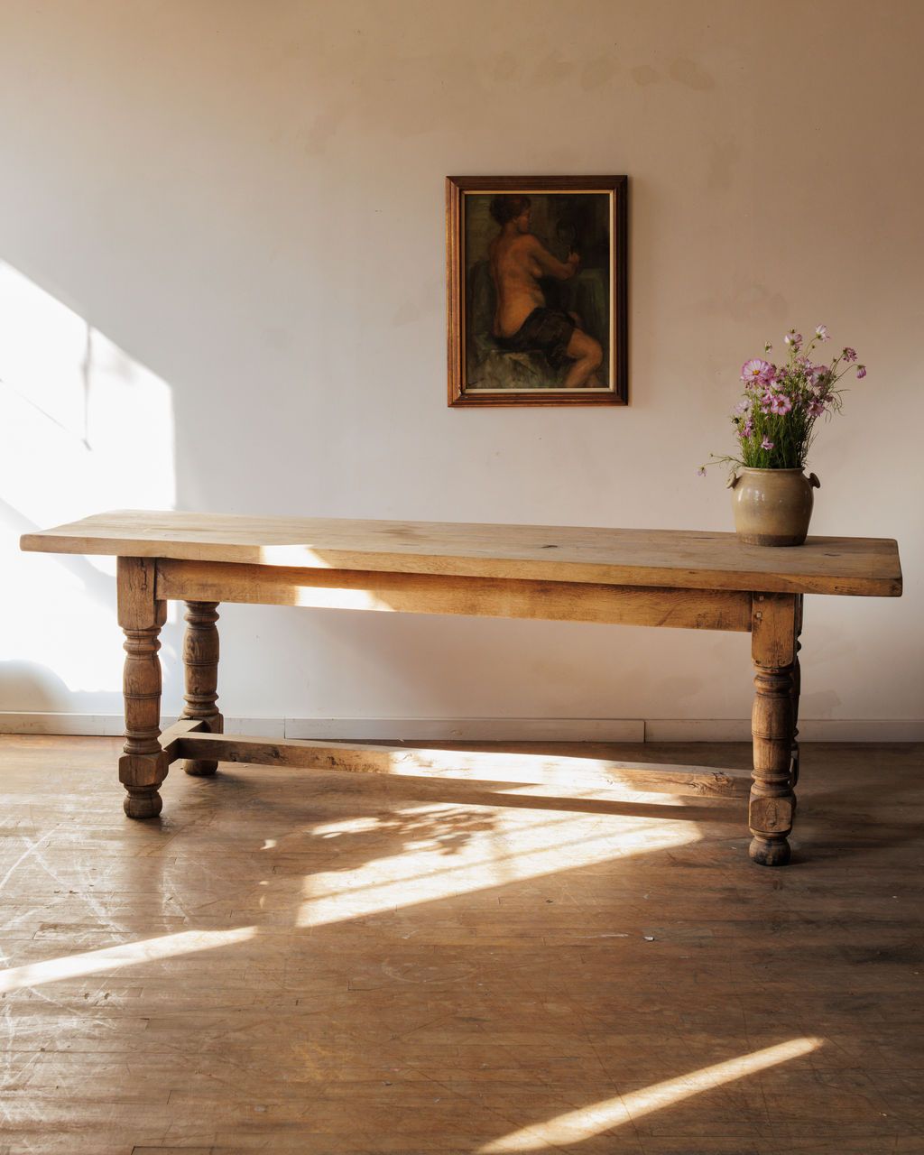 Built from solid oak in the 19th century and discovered near Avignon, this monastery table once served in a bastide in the Luberon, where it likely hosted bread, wine, and long afternoon discussions that blurred into evening. Its scale and craftsmanship are nothing short of architectural- turned legs with a stretcher base.S ylvie swears this is