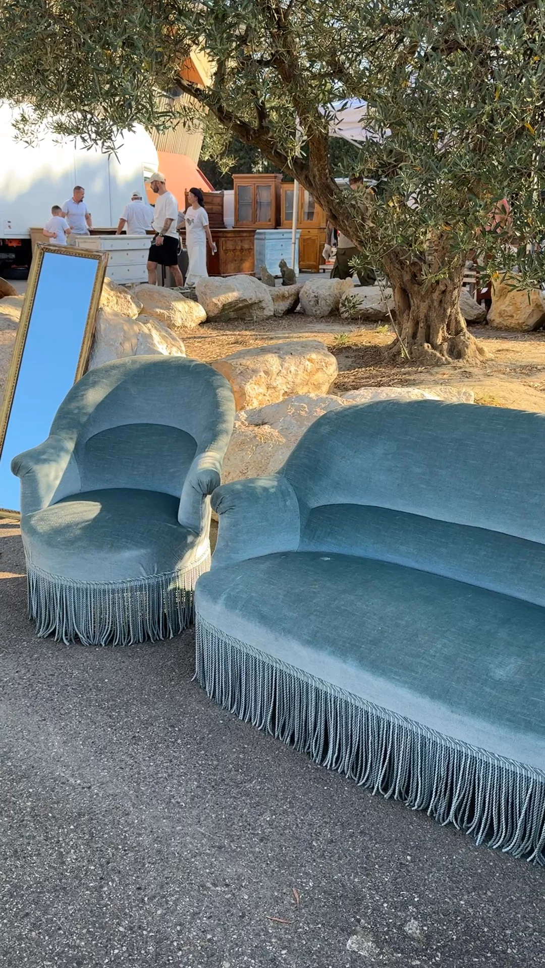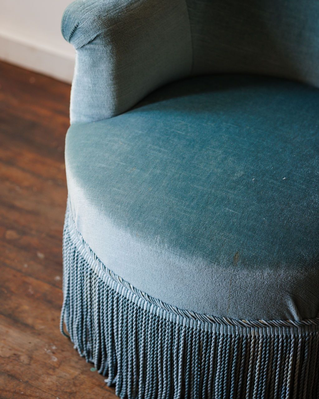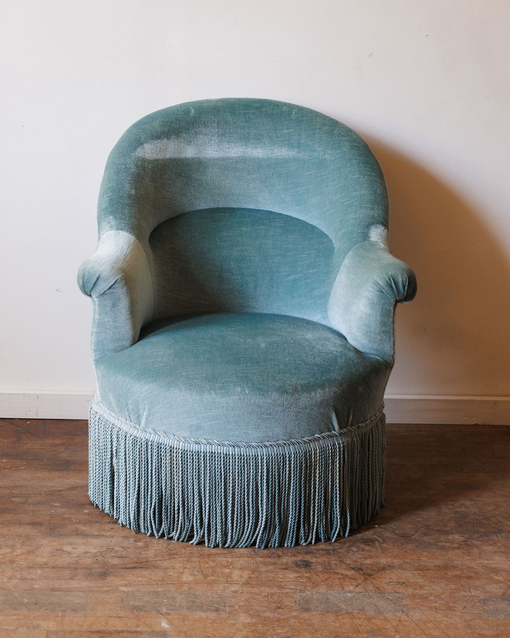 Ooh la la! This Napoleon III armchair, found in Avignon, dates to the late 1800s and captures the era’s signature silhouette with its rounded back, deep seat, and playful low stance. Upholstered in robin’s egg blue velvet with all the charm of its French origins, it’s the kind of piece that feels equal parts heirloom and statement. Two available, sold separately. Have you seen the matching sofa?