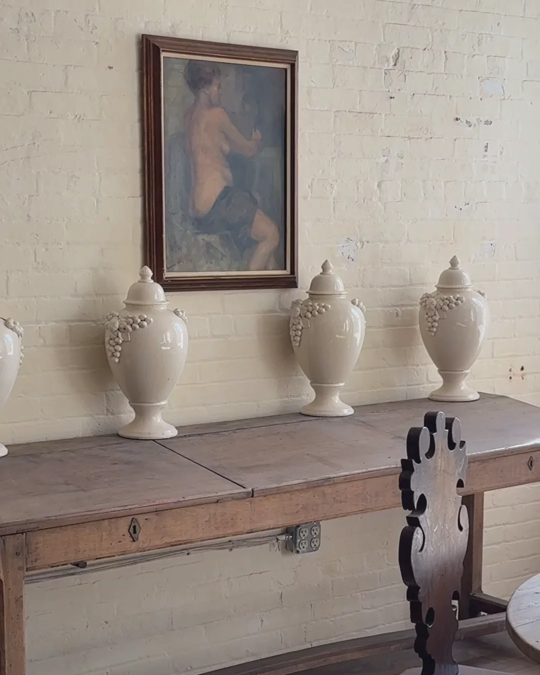 Found in northern Italy and dating to the 19th century, this faïence pharmacy urn was once part of an apothecary’s working shelves. Made from creamy ironstone with hand-painted cascading grape garlands, it has that wonderfully sculptural silhouette these jars are known for - and still retains its original fitted lid and maker’s mark underneath. Sylvie likes it on the kitchen counter, either holding a few clipped olive branches or left completely alone where the shape can do the talking.