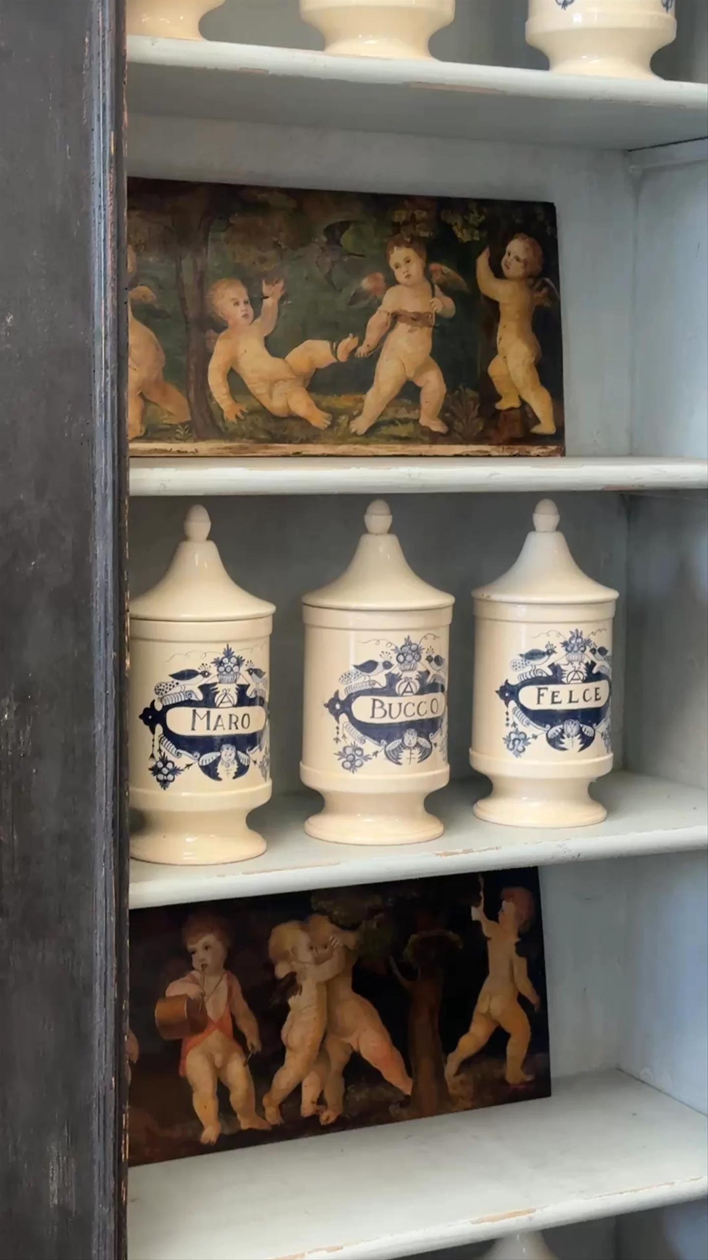These tall maiolica jars, painted in cobalt blue on cream, once lined the shelves of a pharmacist’s shop, each boldly labeled with its cure: Aloe for stomach and skin, Bucco (or buchu) leaves imported from South Africa for kidney and bladder ailments, and Agave, prized in Europe for its healing sap long before anyone thought to make tequila. Their decorations - birds, florals, even a cheeky little cherub - remind us that medicine was as much theater as science. Surviving intact with their lidded tops, these jars are rare survivors of 18th–19th century Italian craft, equal parts remedy and ornament. Sold separately, exactly as pictured.