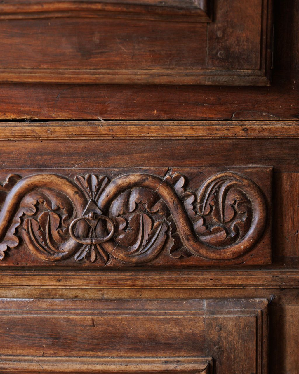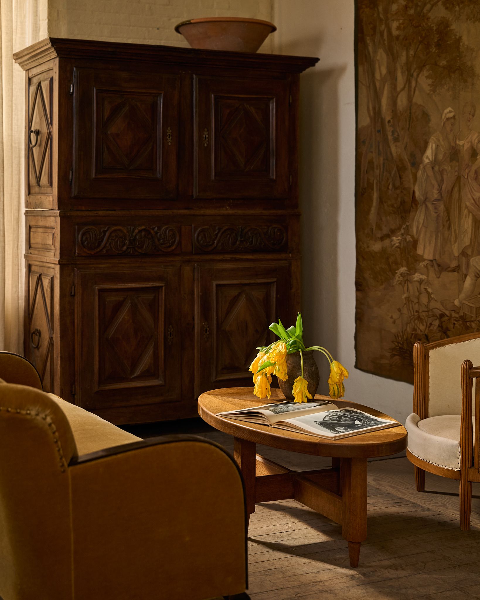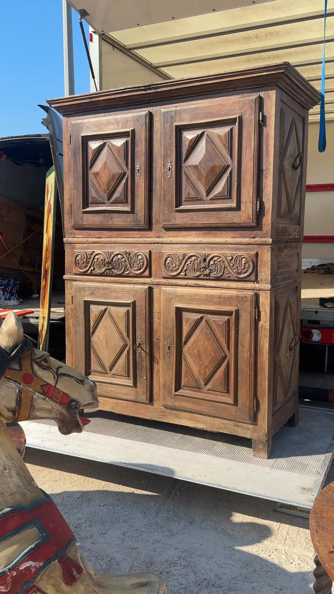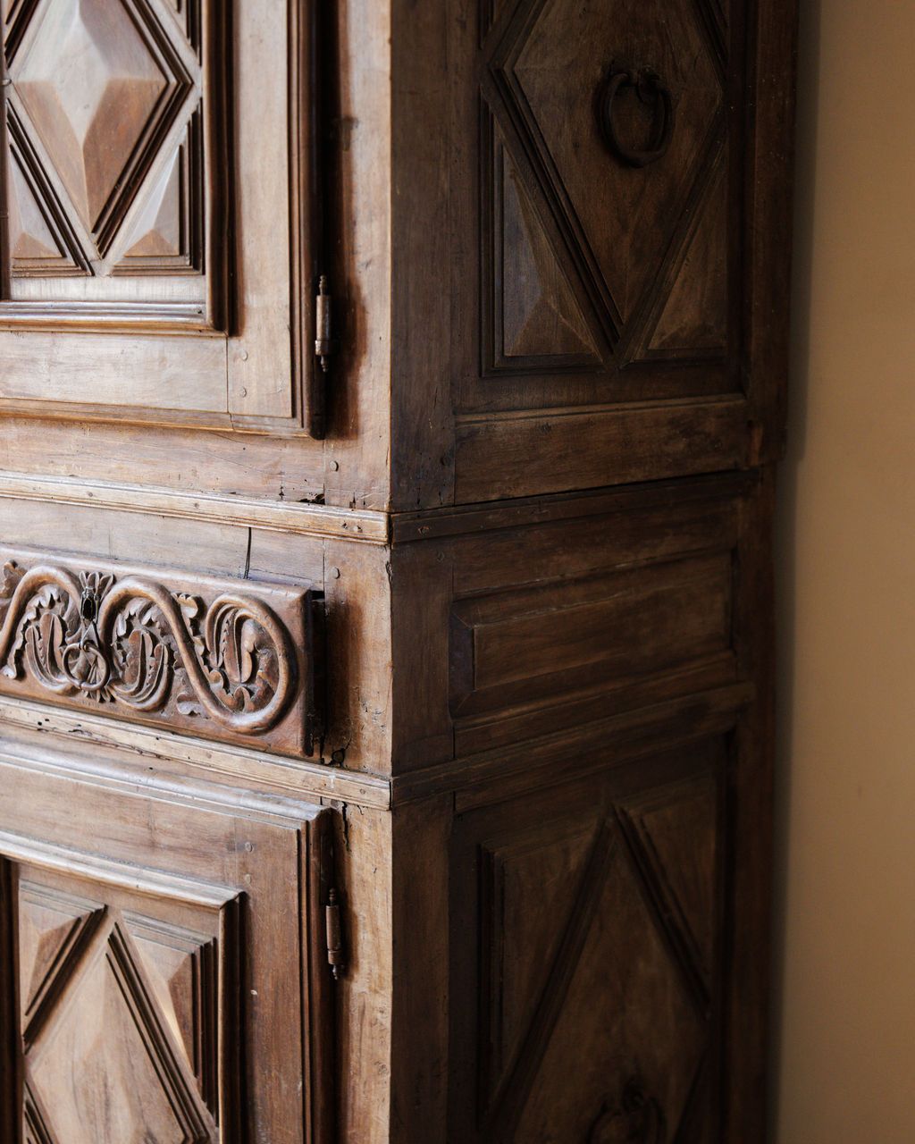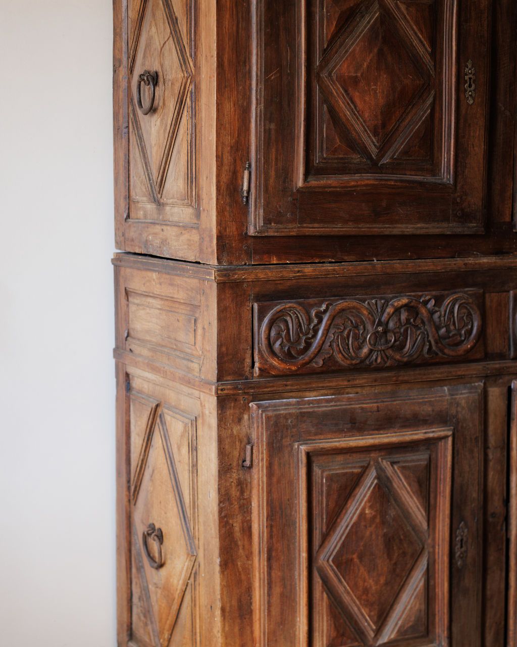 A relic from the era of French châteaux and grand kitchens. This 17th-century cupboard was found in Avignon but hails from the Gers region, the culinary heartland of France known for its foie gras and fortified farm estates. Built entirely by hand, it’s composed of two separate pieces - a design feature that made these monumental cupboards easier to move within stone manor walls. The carved diamond panels and intricate frieze work along the center reveal the craftsman’s skill and the influence of early Baroque ornamentation. Cupboards of this scale once stored cured meats, linens, or family silver; today, it commands a room with its quiet gravitas and enduring beauty.