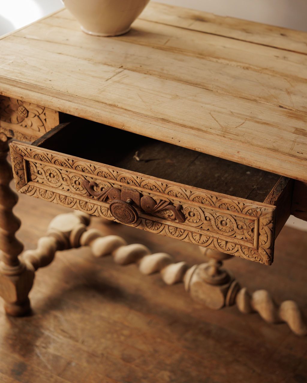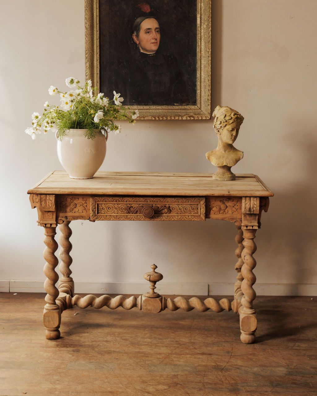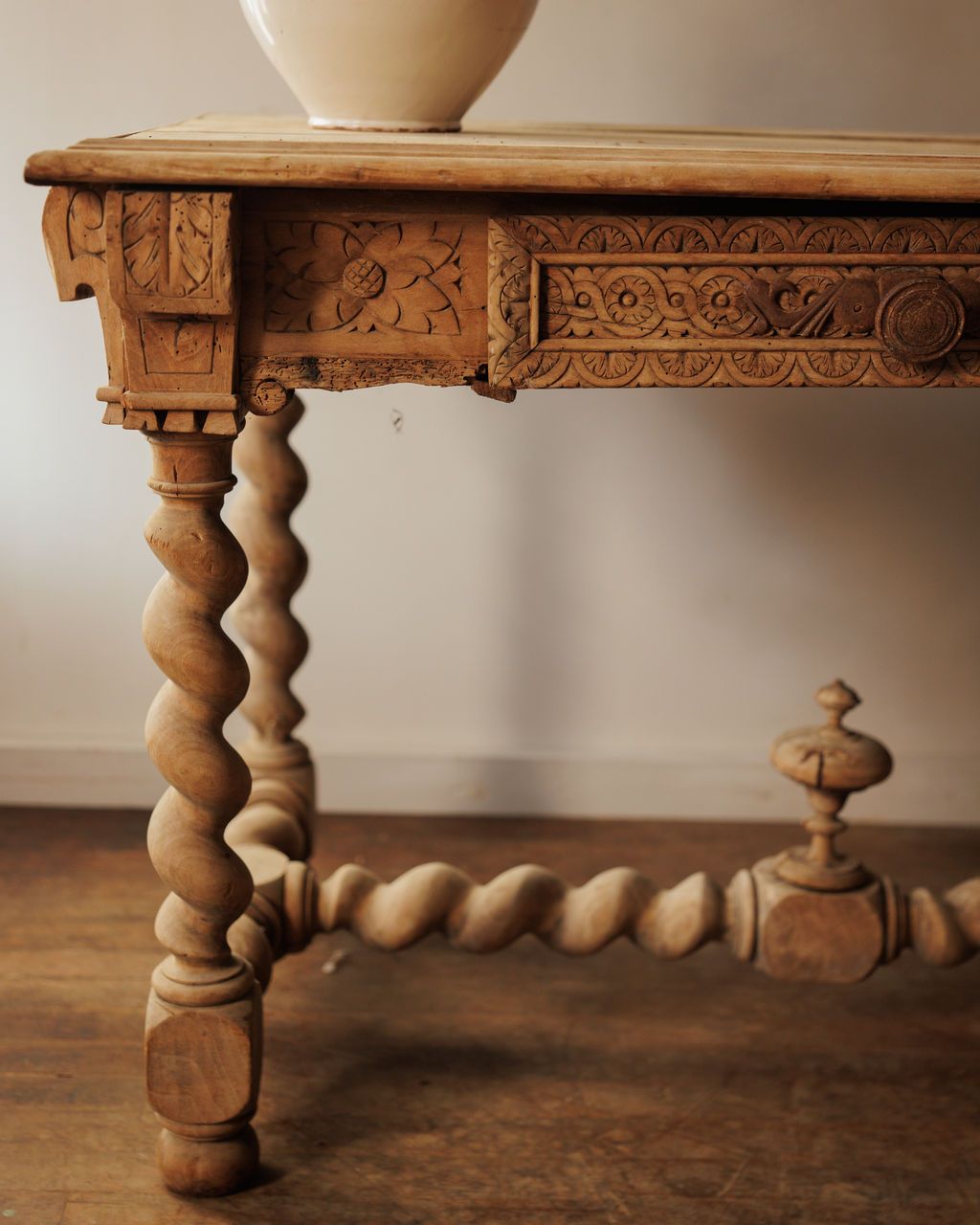 This is the kind of piece that screams one of a kind. Found in Avignon and carved from pale oak, this 18th-century piece features richly detailed floral motifs and turned barley twist legs joined by an ornate stretcher. The craftsmanship hints at the Louis XIII style, where sculptural form met everyday function. Once used as a writing table in a provincial study, its single front drawer kept letters, ledgers, and ink neatly tucked away. The light tone of the wood shows every trace of its handwork, a testament to centuries of care. Sylvie loves it as a statement desk or console, paired with a simple chair and a stack of well-thumbed books.