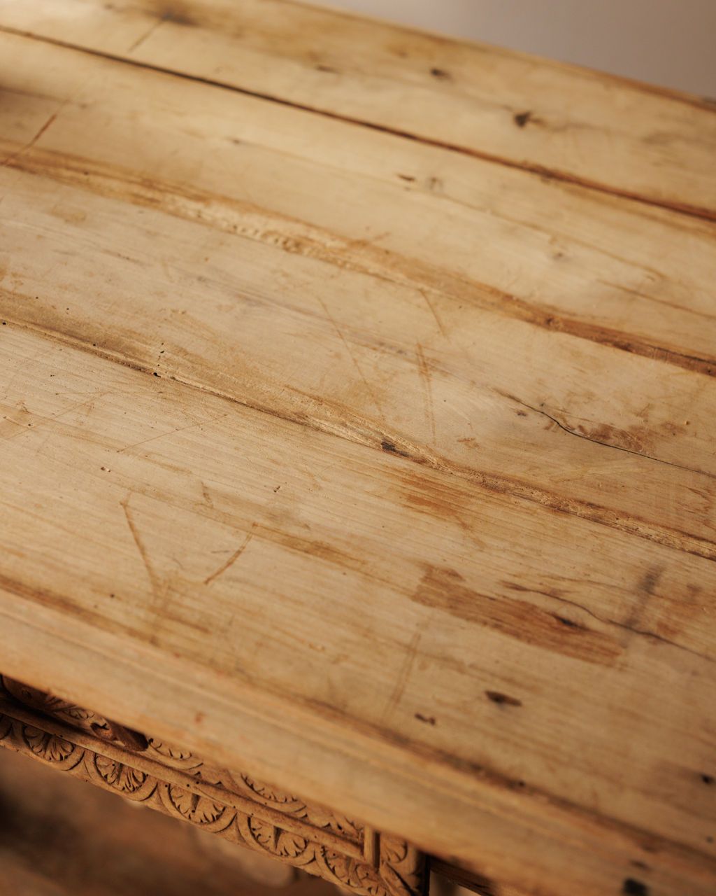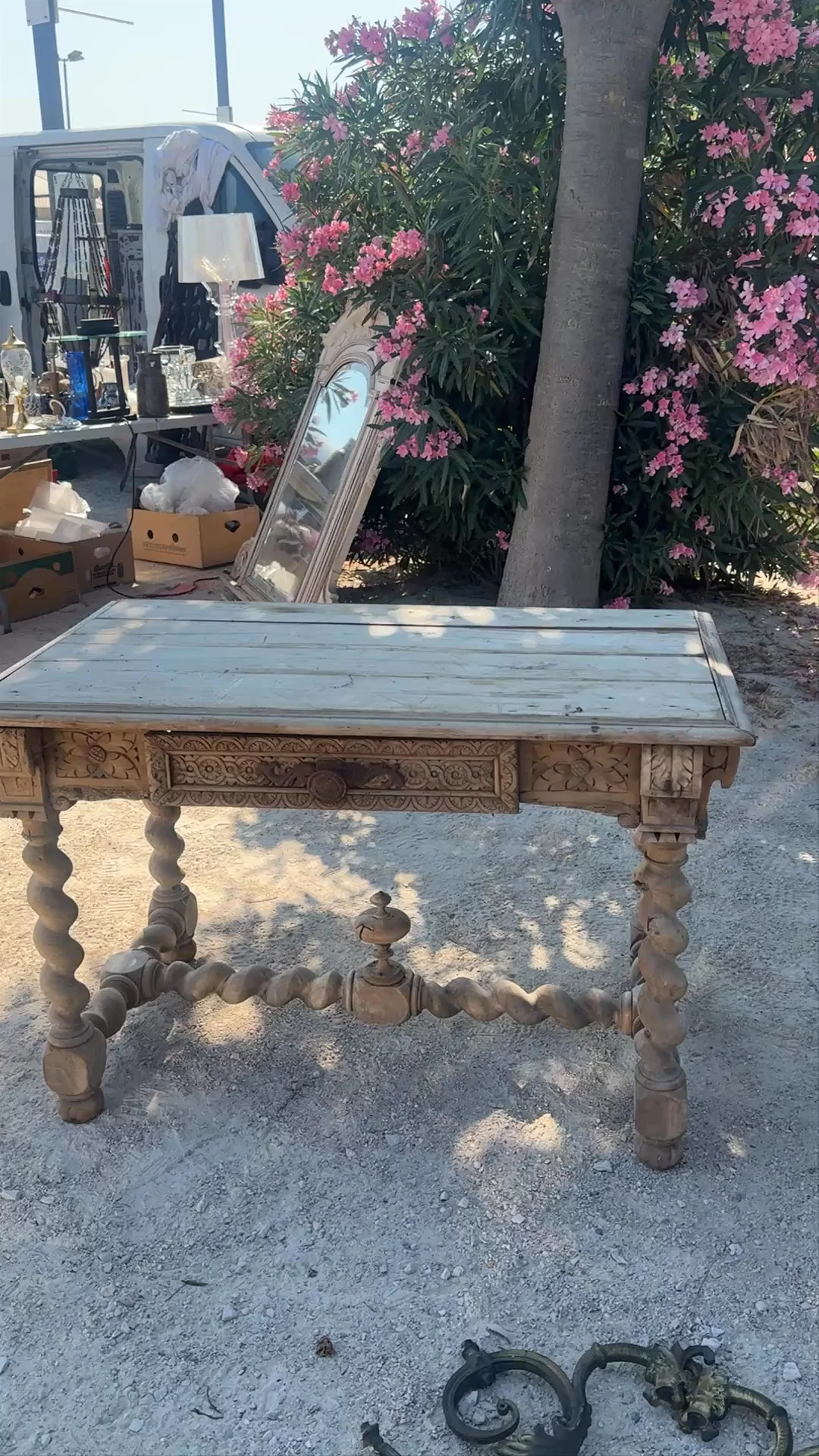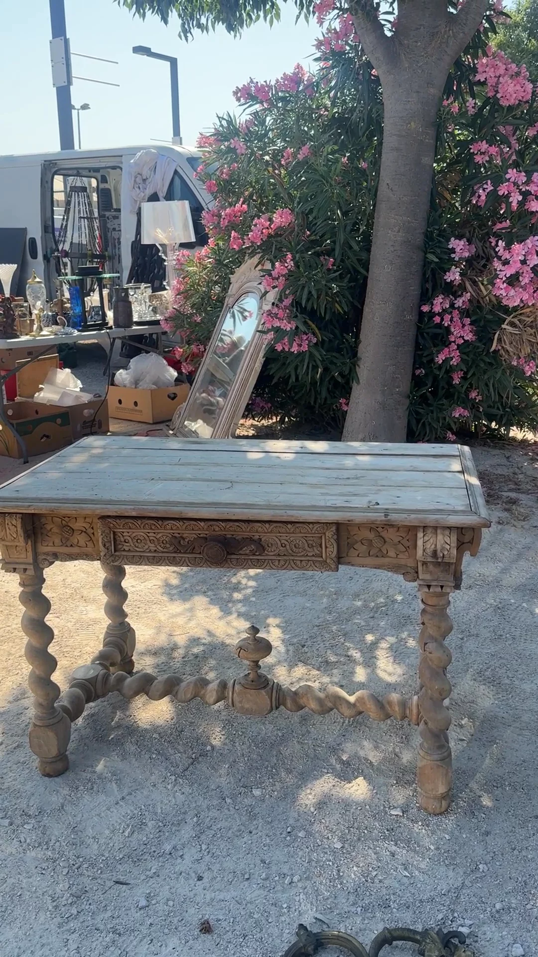 This is the kind of piece that screams one of a kind. Found in Avignon and carved from pale oak, this 18th-century piece features richly detailed floral motifs and turned barley twist legs joined by an ornate stretcher. The craftsmanship hints at the Louis XIII style, where sculptural form met everyday function. Once used as a writing table in a provincial study, its single front drawer kept letters, ledgers, and ink neatly tucked away. The light tone of the wood shows every trace of its handwork, a testament to centuries of care. Sylvie loves it as a statement desk or console, paired with a simple chair and a stack of well-thumbed books.