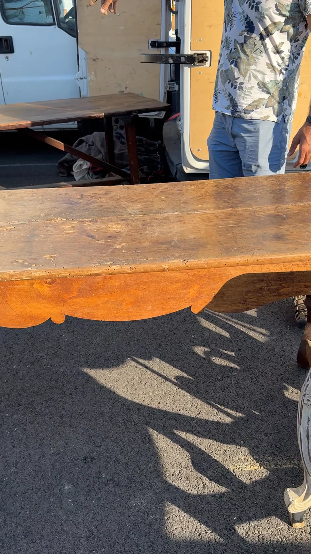 She's got curves in all the right places. This 19th century French dining table comes alive with its serpentine apron and boldly carved legs that ripple like ribbons of oak. The backside shows an old repair where a panel was carefully replaced and shaped to follow the silhouette, proof of its long and hardworking life in a provincial dining room. Tables like this were often the centerpiece of family gatherings, built sturdy enough to outlast generations of bread loaves, wine bottles, and arguments over politics. Today, Sylvie imagines it hosting candlelit dinners, with friends packed close and laughter spilling late into the night.