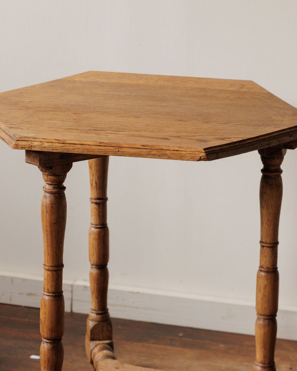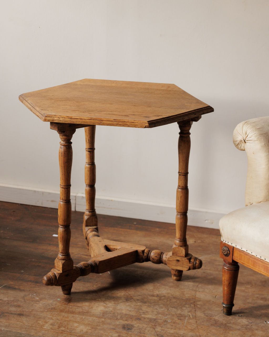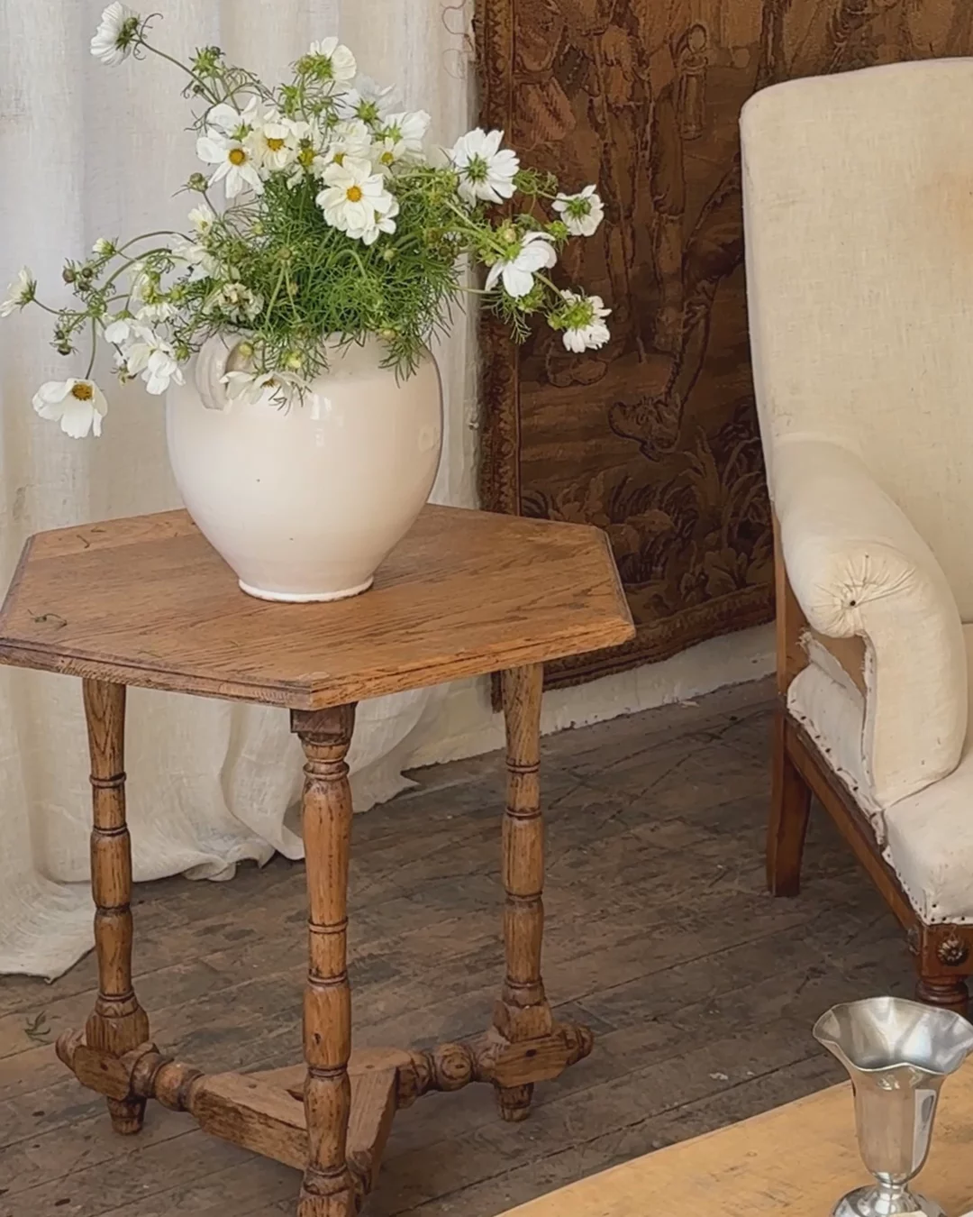We never met a hexagon we didn’t like. Found in Uzès and originally from the Savoie region, this 1940s oak side table features a six-sided top with turned legs joined by a triangular stretcher. Once used beside an alpine bed for a candle and glass of water, now the perfect companion for your armchair, holding an espresso and whatever book you’re pretending to finish.