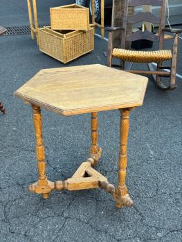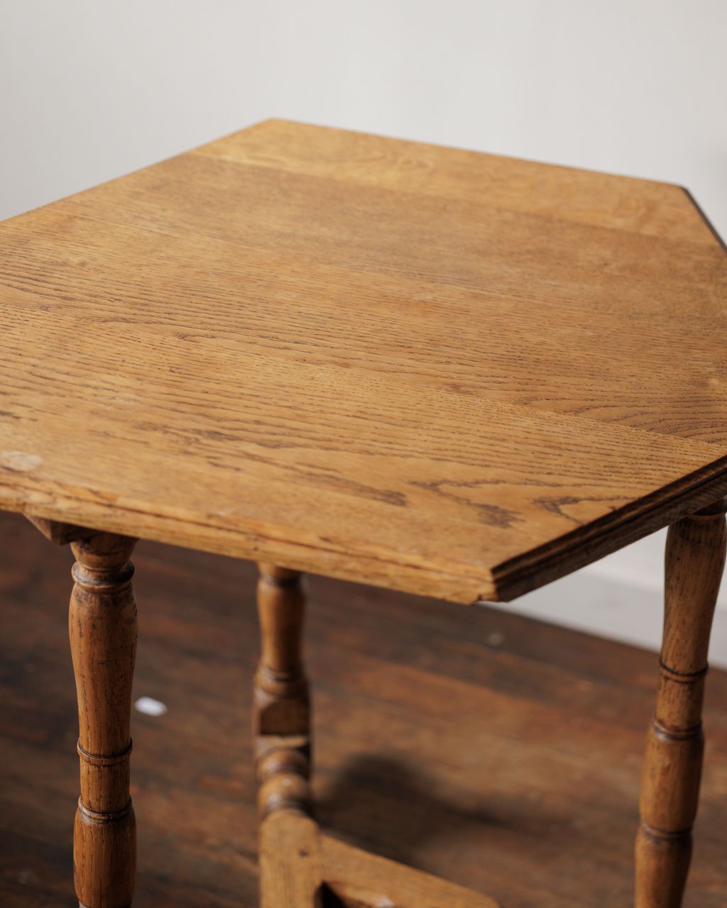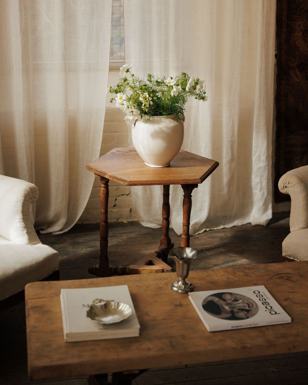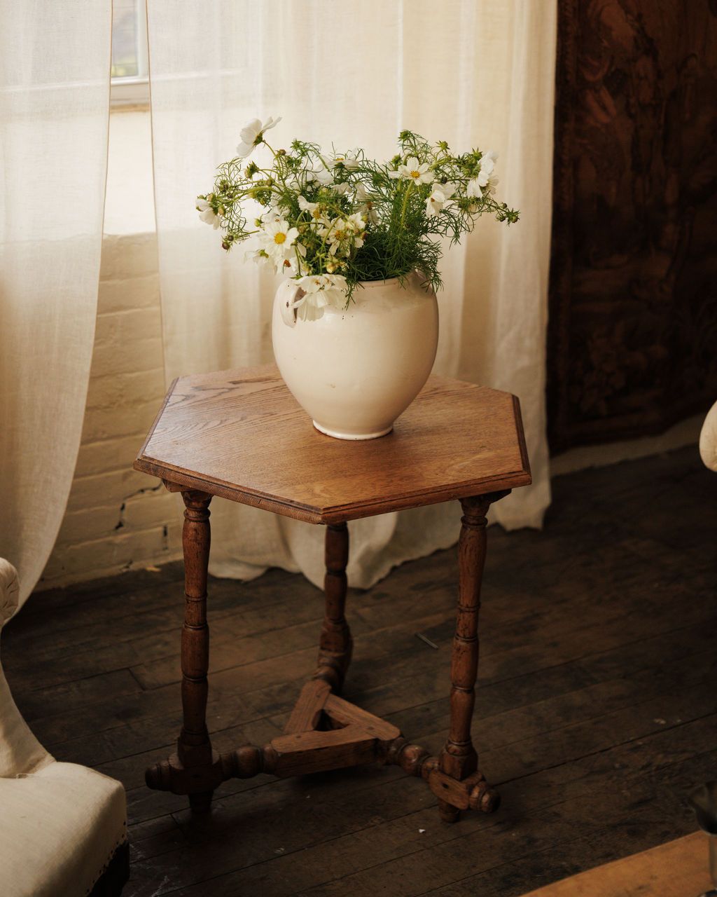 We never met a hexagon we didn’t like. Found in Uzès and originally from the Savoie region, this 1940s oak side table features a six-sided top with turned legs joined by a triangular stretcher. Once used beside an alpine bed for a candle and glass of water, now the perfect companion for your armchair, holding an espresso and whatever book you’re pretending to finish.