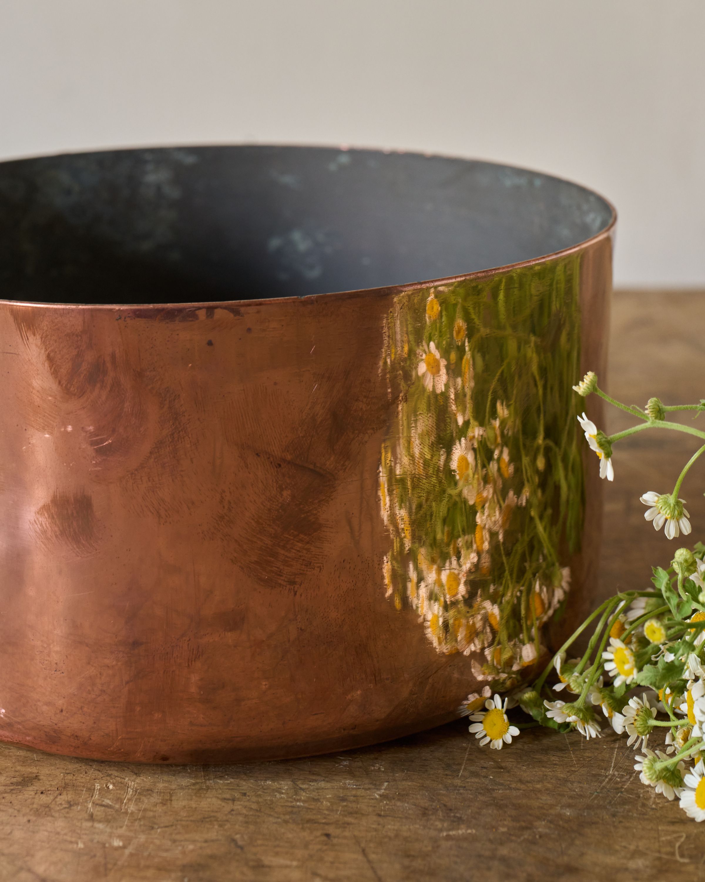 From Villeneuve-lès-Avignon and dating to the 19th century, these copper saucepans would have sat over open flames in French kitchens, built for slow reductions, preserves, and everyday cooking that required patience and control. The forms are classic - deep, straight-sided vessels with long iron handles, made to be moved easily between fire and work surface. The copper has aged to a rich, warm tone, with darkened interiors from years of use exactly as intended. Sylvie loves them left out on the stove or hung within reach, ready to be used again. Available in medium and large, exactly as pictured.