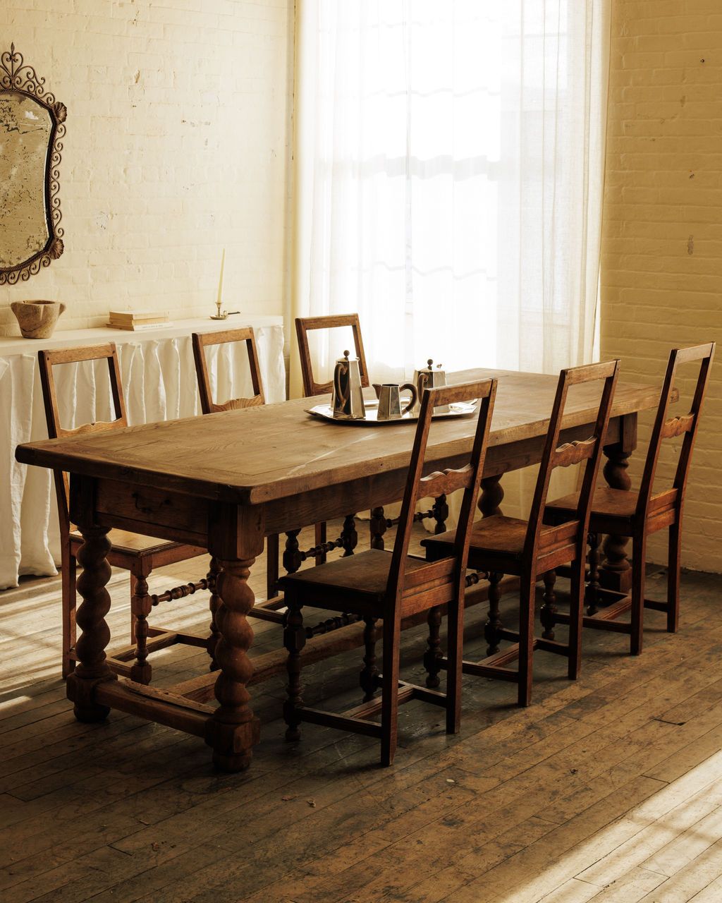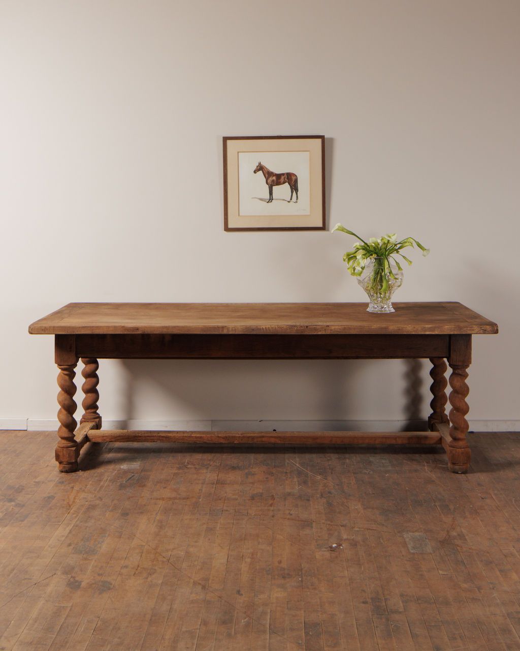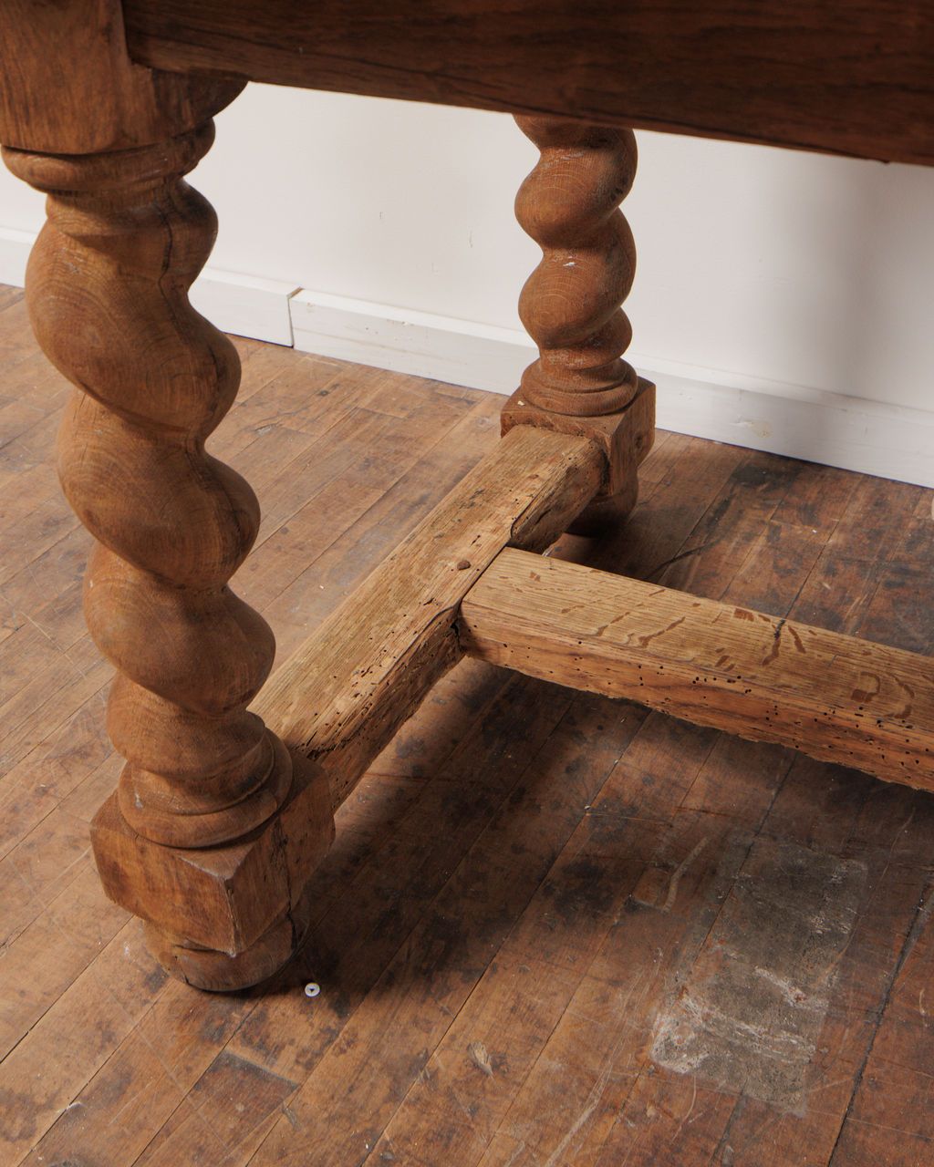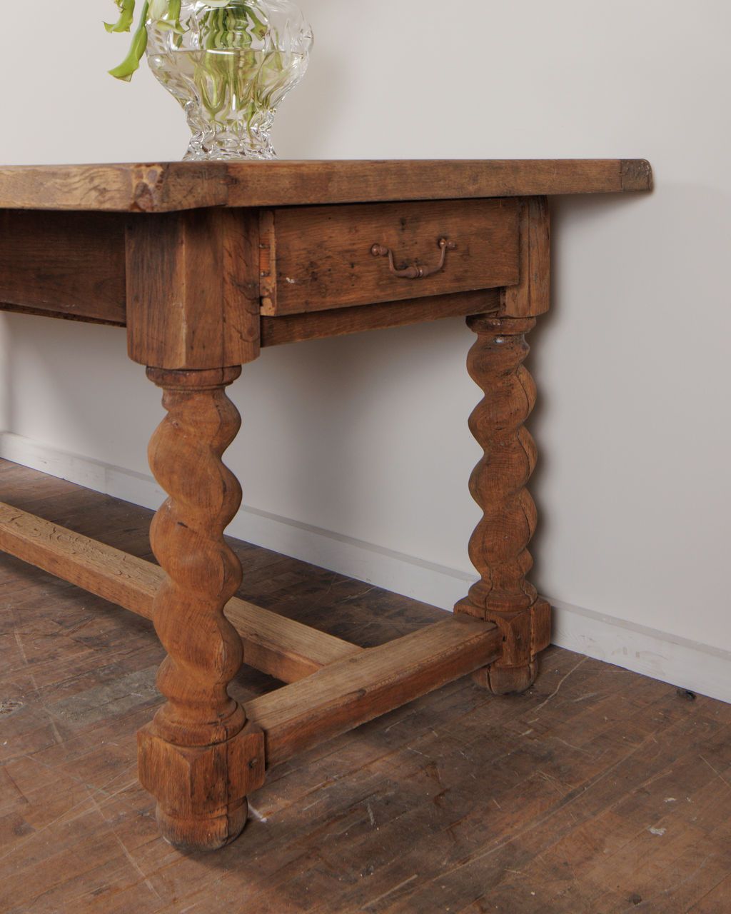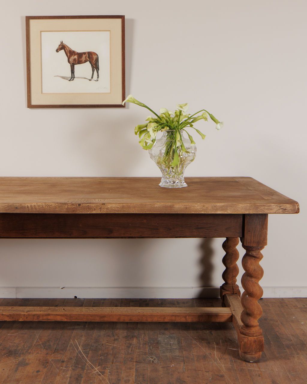 This oak table is all honesty, heft, and history, straight from the farms around Lyon. Its hand carved barley twist legs and long oak stretcher speak to the craftsmanship of the region, and the small repair along the lower stretcher tells you it has seen real family life rather than museum quiet. Originally from Lyon and found by Sylvie in Avignon, it was built for daily meals, flour-dusted afternoons, and the kind of gatherings that stretch late into the night.