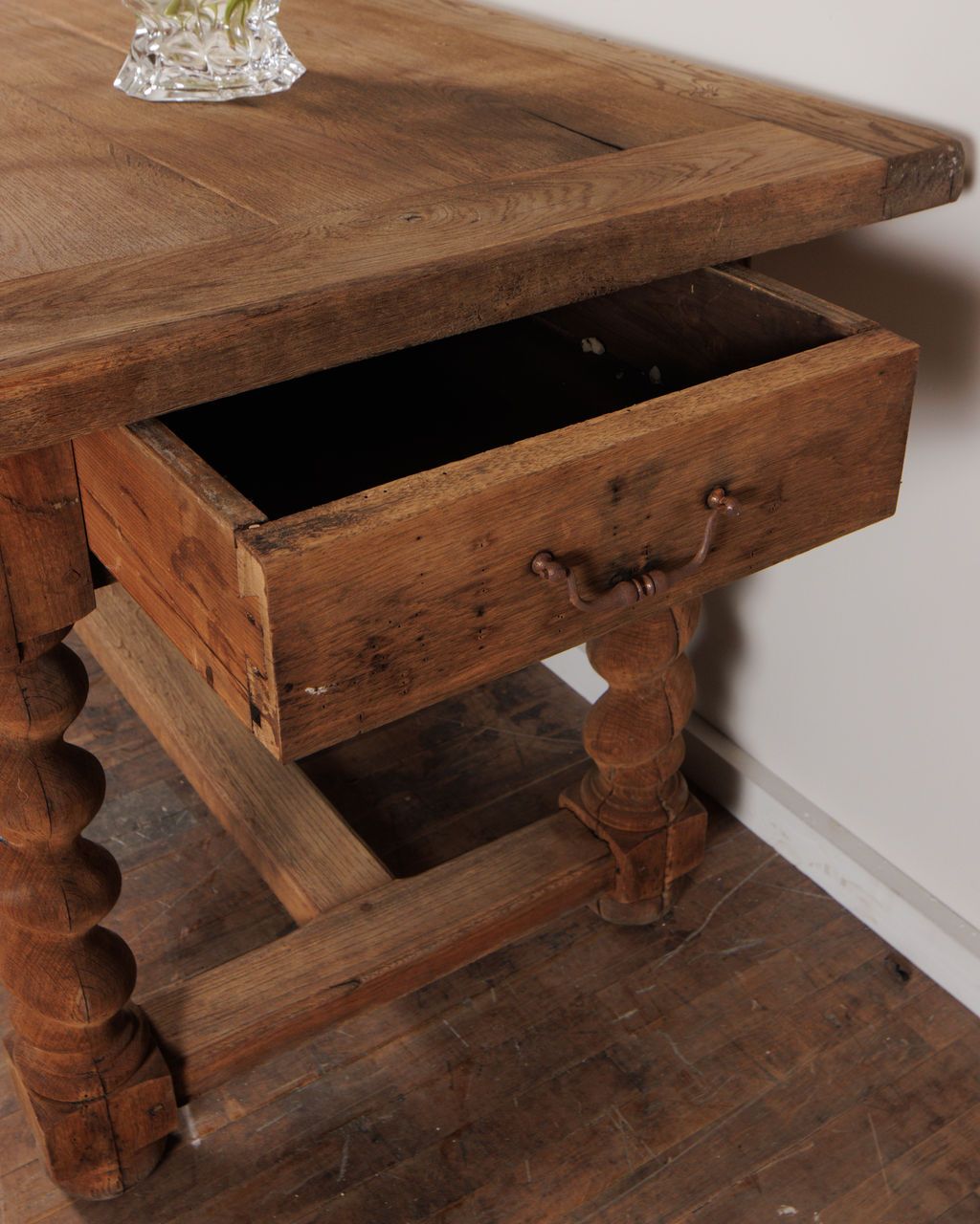 This is a stunning solid table with a drawer on either end. It looks like it has an natural oiled finish. It has minor scuffs on the surface and it has been repaired in the past, but its in exceptional shape. As with many antiques, this piece may show gentle repairs, cracks, scratches, holes, years worth of patina, and stains - just the way we like it.