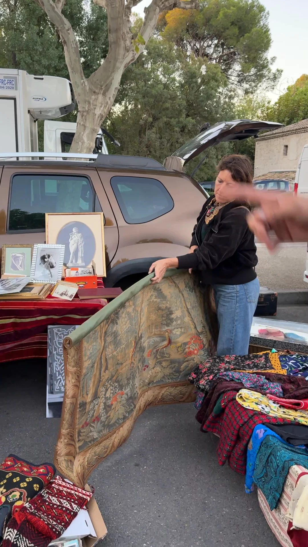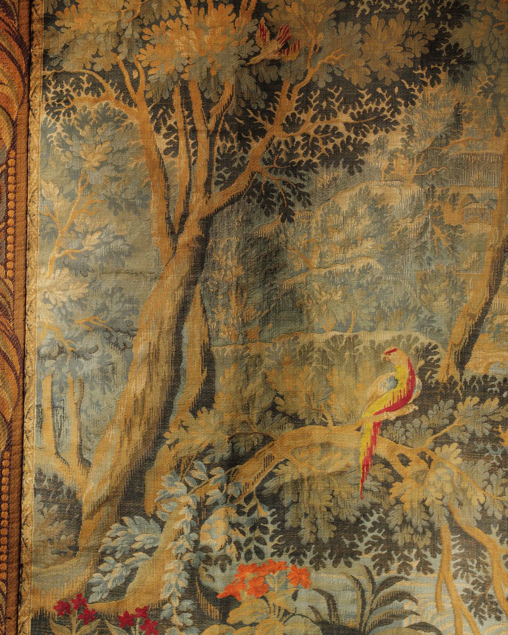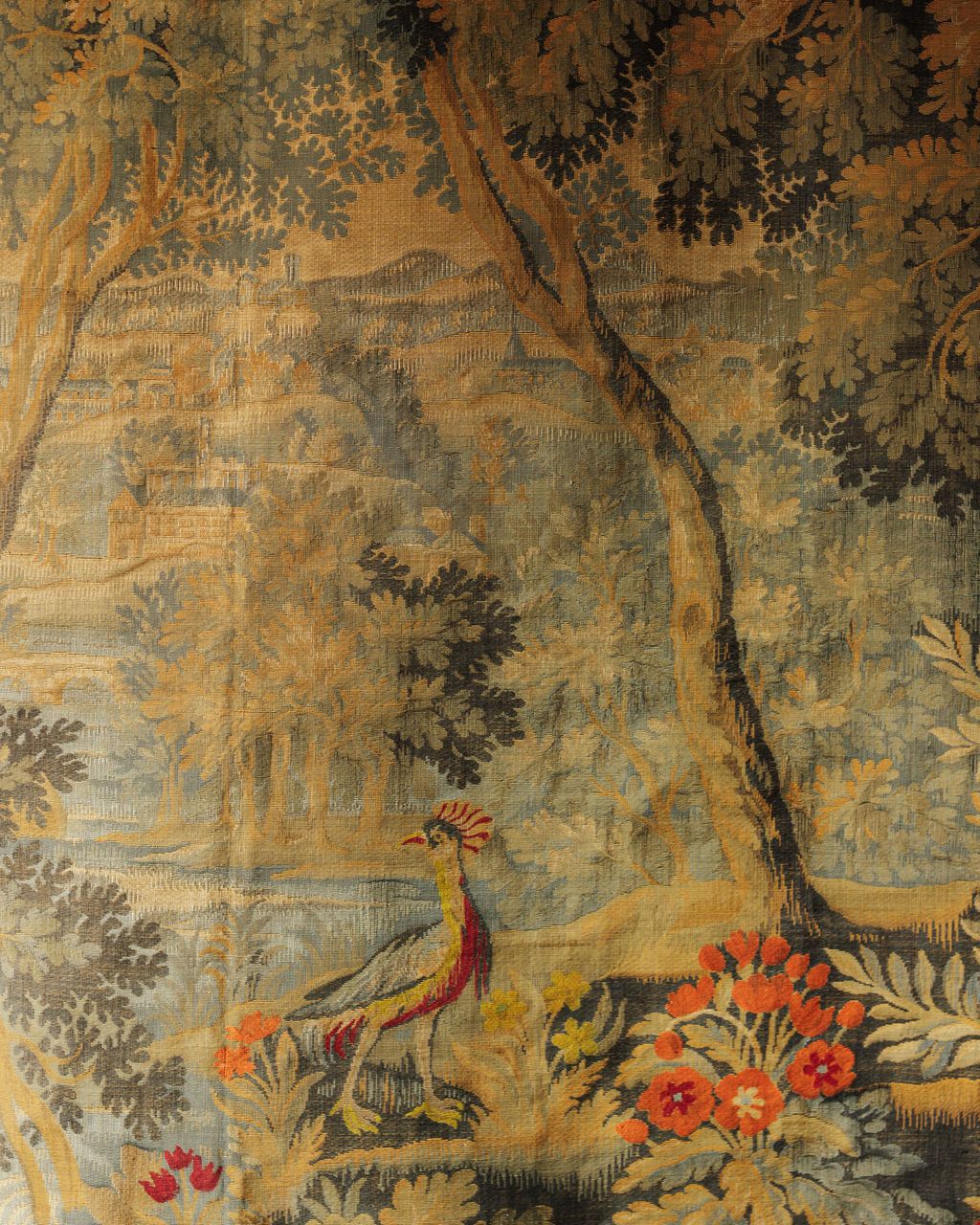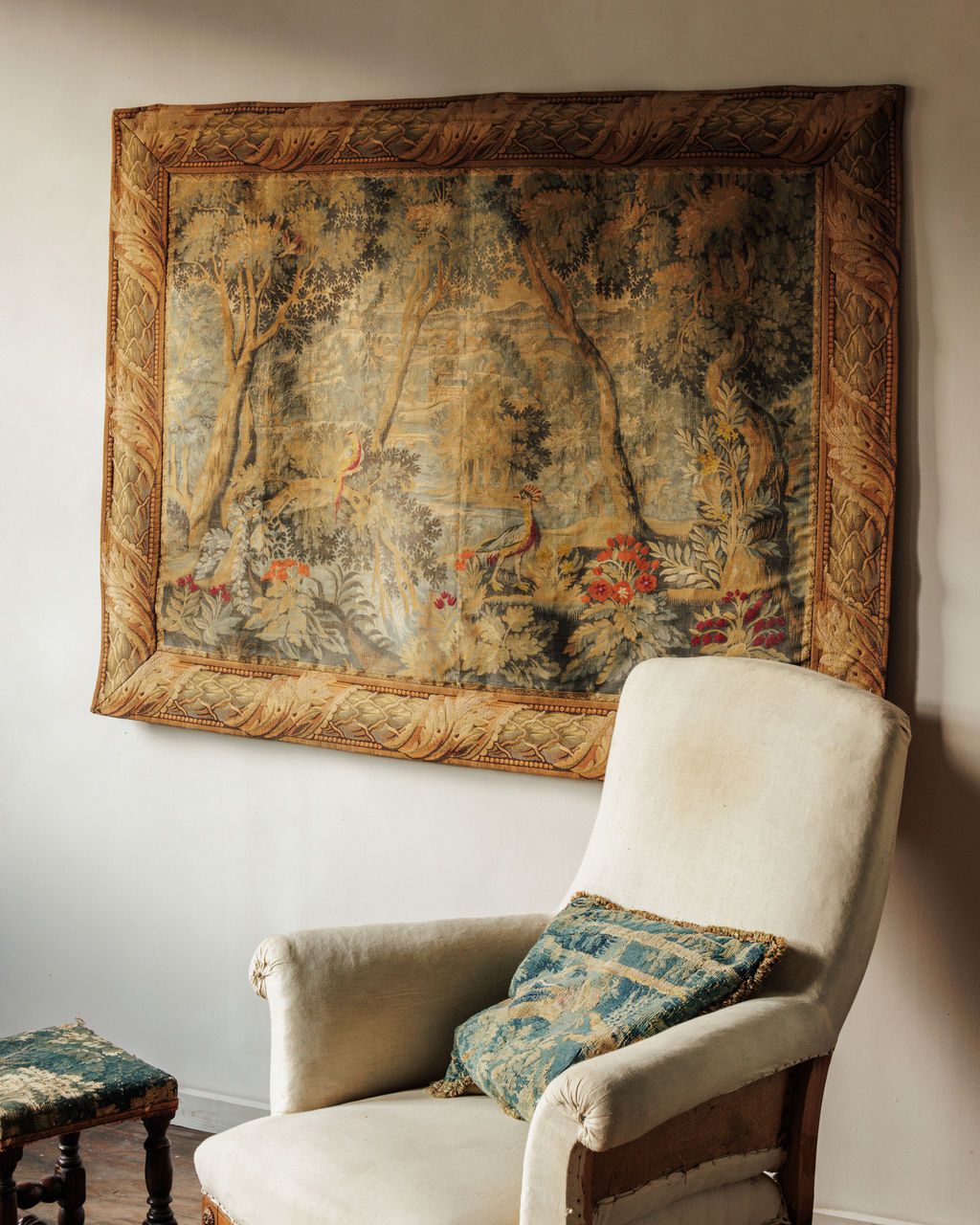 This Normandy tapestry brings the atmosphere of a forest right into the room. The scene is woven in a traditional verdure style, a technique popular across northern France where workshops specialized in dense landscapes filled with trees, foliage, and small narrative moments. Hung from a wooden support along the top edge with two metal hoops, it’s ready to display just as it would have been in a historic home. Sylvie loves it above a sofa or along a hallway where the greens and woven details can draw you in each time you pass.