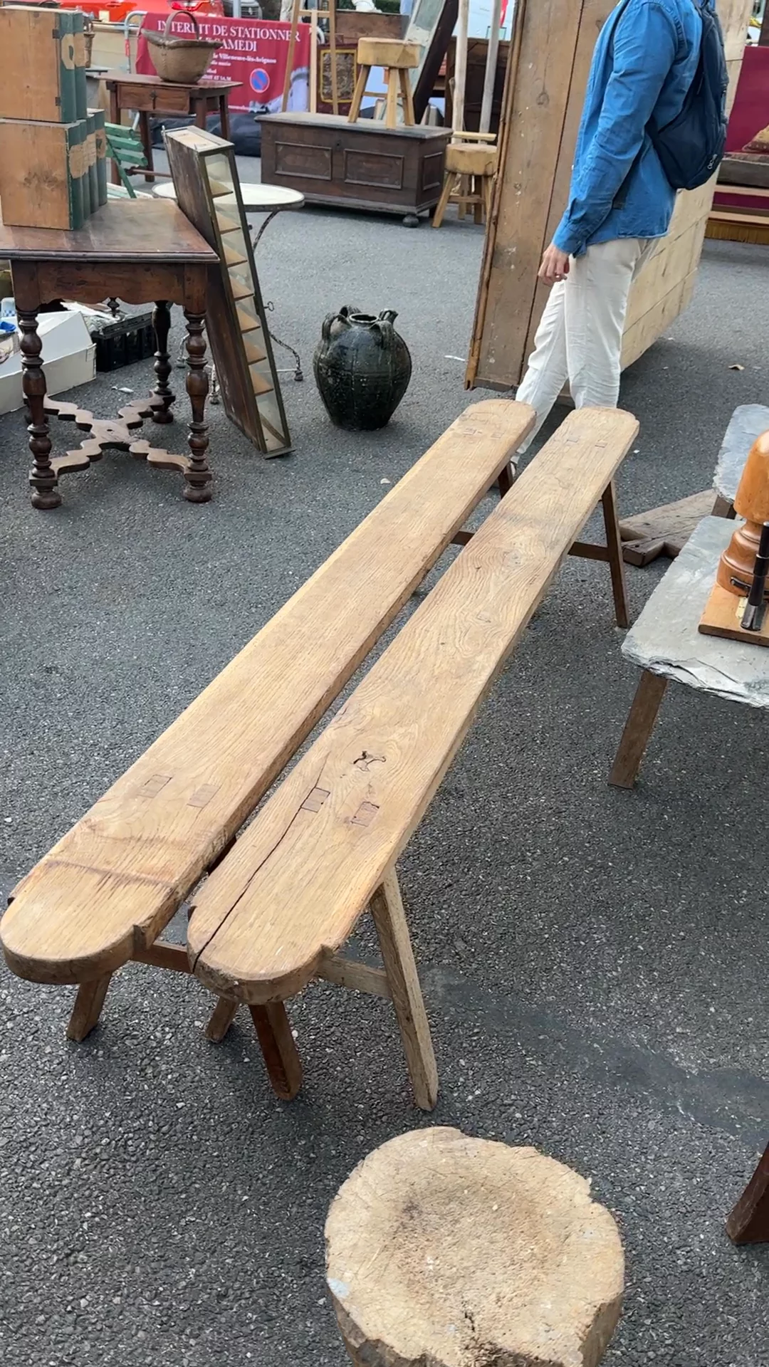 Long, narrow, and straight to the point. This farm bench, found in Villeneuve-lès-Avignon, was originally a simple working piece, likely used by farm hands for quick meals or moments of rest, its slim profile designed to tuck easily against a wall or table. The worn wood and visible joinery speak to that daily use, with nothing added that didn’t need to be there. It works just as well now at the foot of a bed or pulled up along a long dining table where extra seating is always welcome.