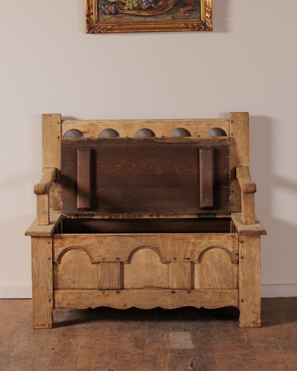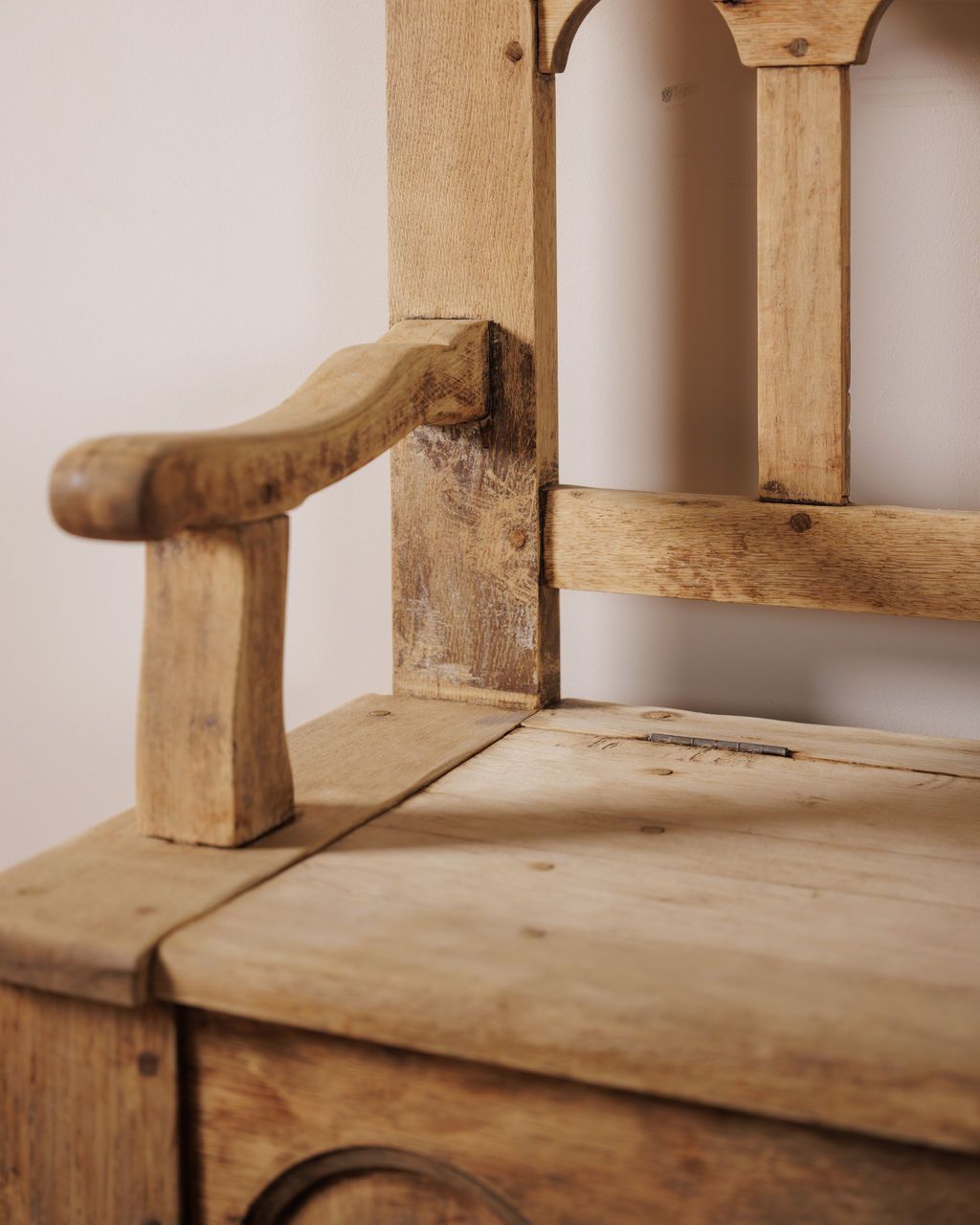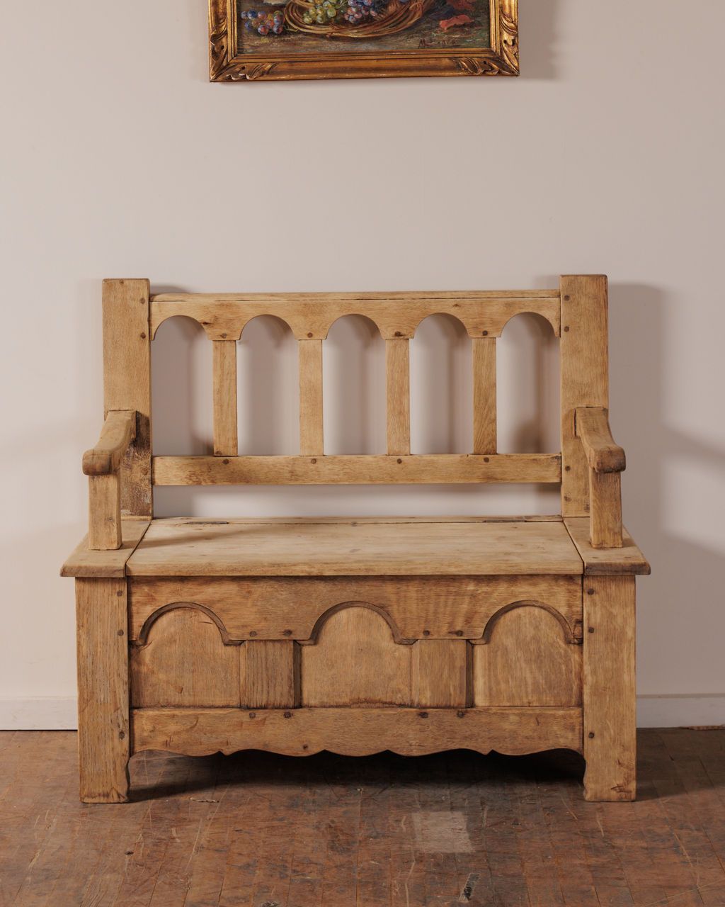 An old-world bench with quiet devout revery. This 18th century piece once sat inside a small church near Espirit in Villeneuve-lès-Avignon. Its arched backrest, thick arms, and scalloped apron mark it as a working monastery form built to withstand daily use while offering a place to rest or reflect, and the lift seat reveals its original purpose as storage for linens and ceremonial objects. Sylvie likes this in a hallway where the hidden compartment keeps shoes or bags out of sight and the bench itself becomes the spot everyone naturally gravitates toward before heading out the door.