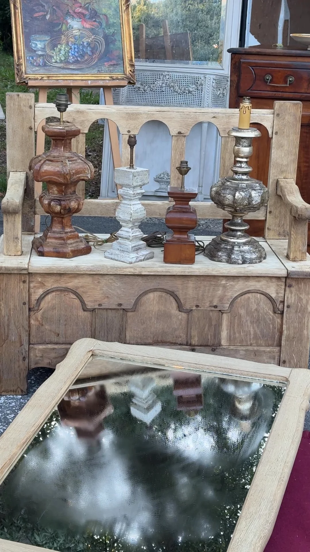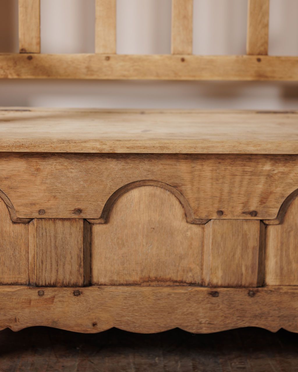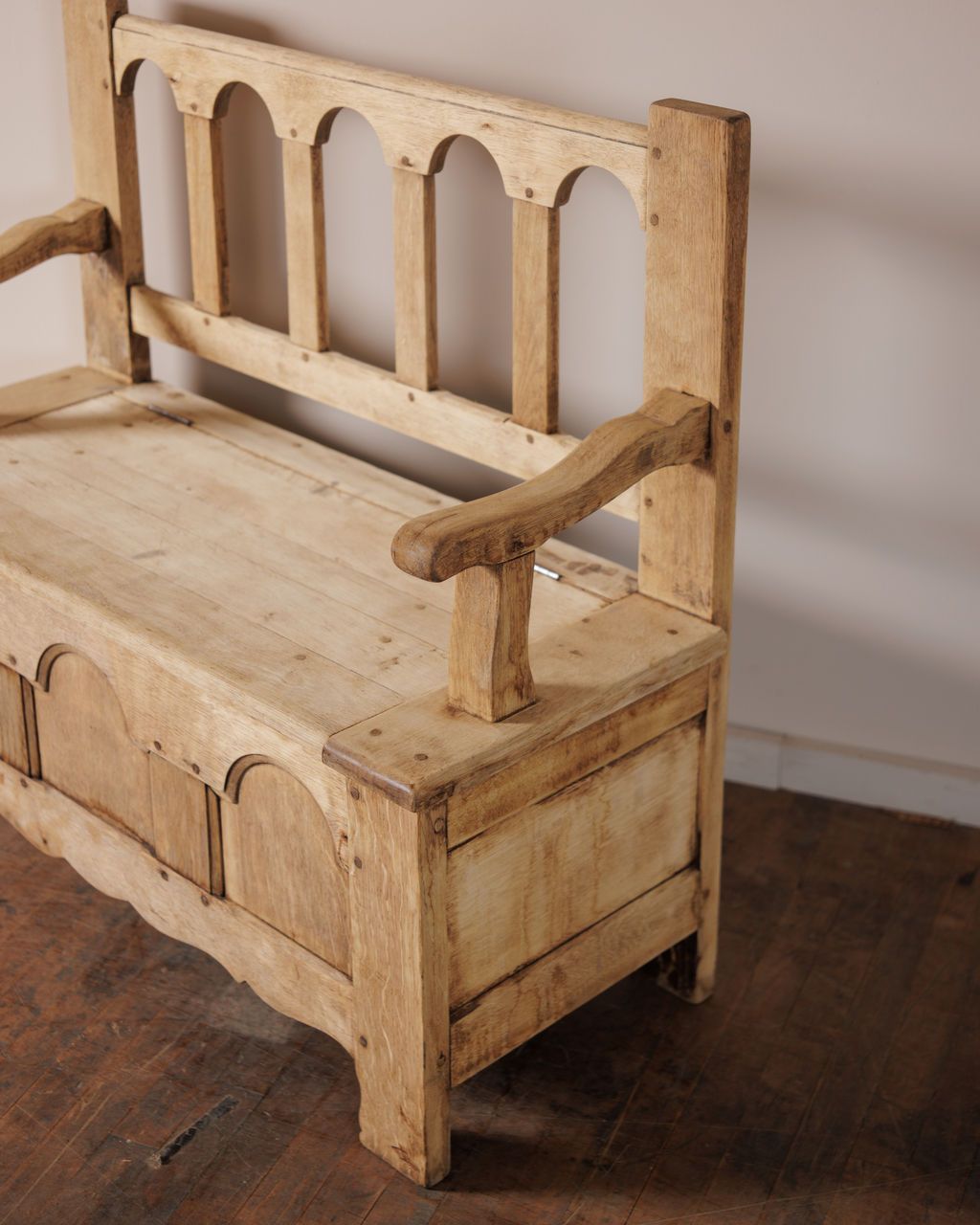 An old-world bench with quiet devout revery. This 18th century piece once sat inside a small church near Espirit in Villeneuve-lès-Avignon. Its arched backrest, thick arms, and scalloped apron mark it as a working monastery form built to withstand daily use while offering a place to rest or reflect, and the lift seat reveals its original purpose as storage for linens and ceremonial objects. Sylvie likes this in a hallway where the hidden compartment keeps shoes or bags out of sight and the bench itself becomes the spot everyone naturally gravitates toward before heading out the door.