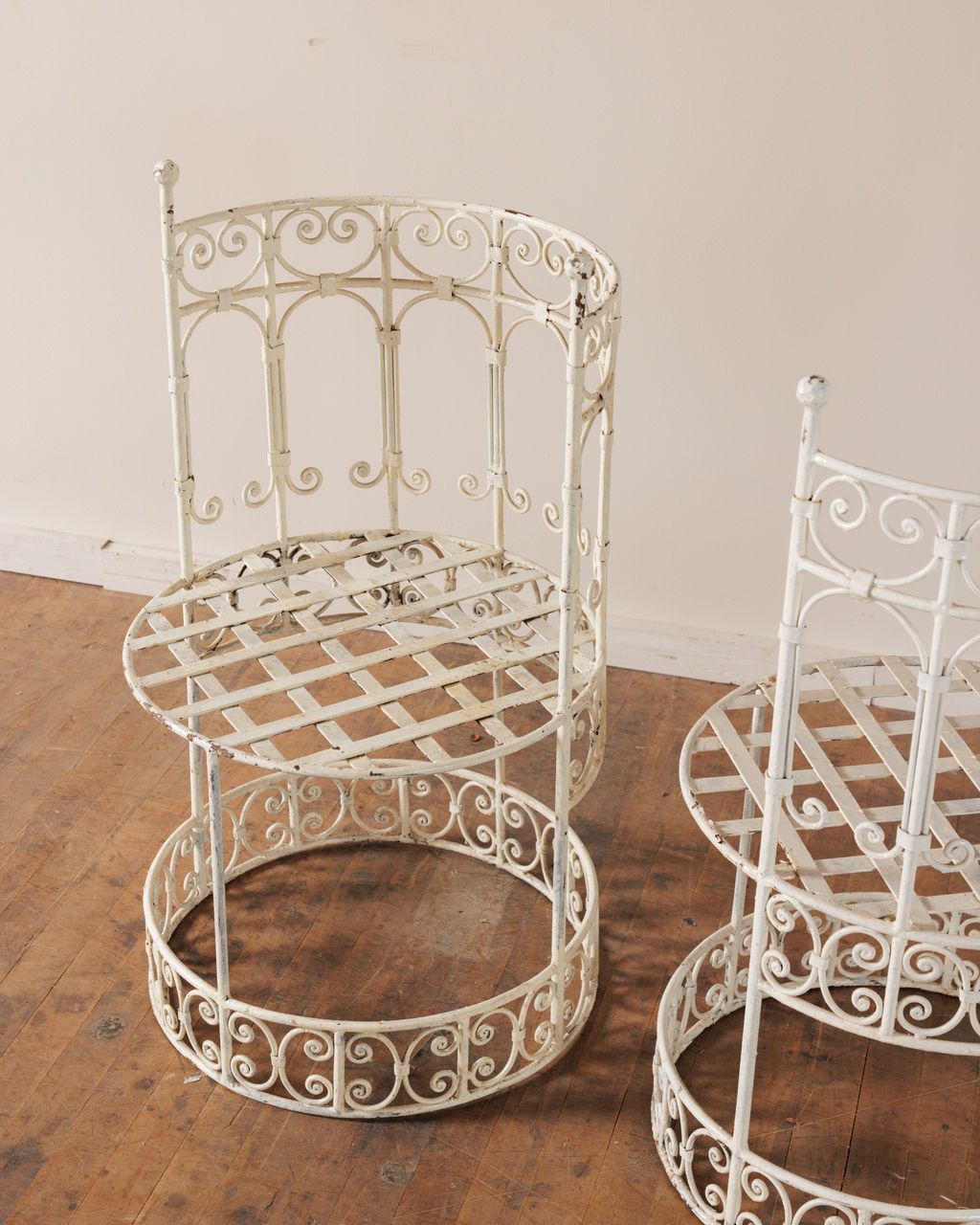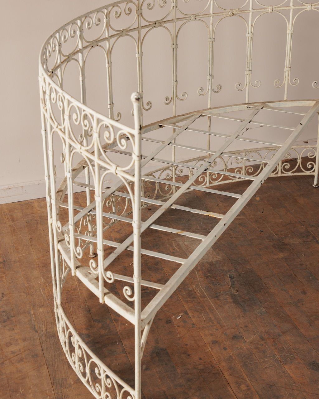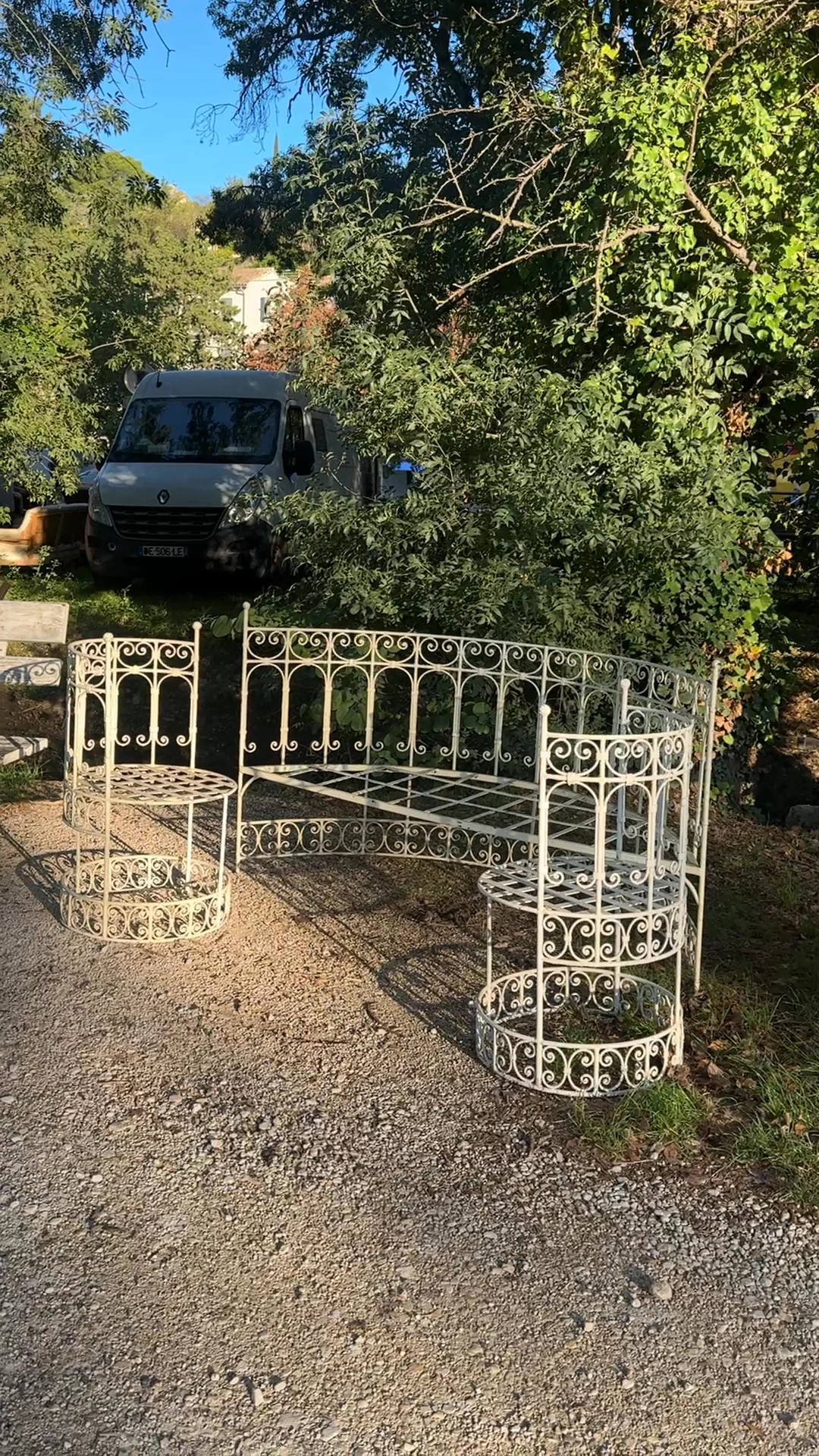 This rare three piece vintage garden set is pure château fantasy. Made from painted metal with an elegant curved bench and two matching circular side tables, each piece is wrapped in delicate scrollwork that feels straight out of a French garden party scene. Sourced from a château in Northern France, it has that perfect mix of romance and structure, ideal for a gravel terrace, a greenhouse moment, or an overgrown corner of the garden that needs a little something extra.