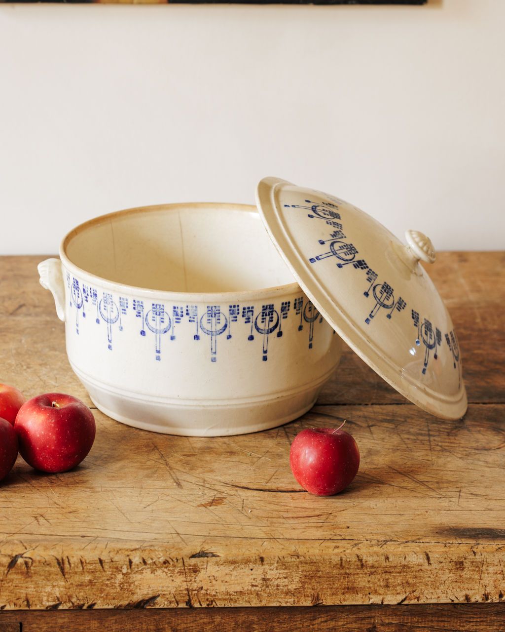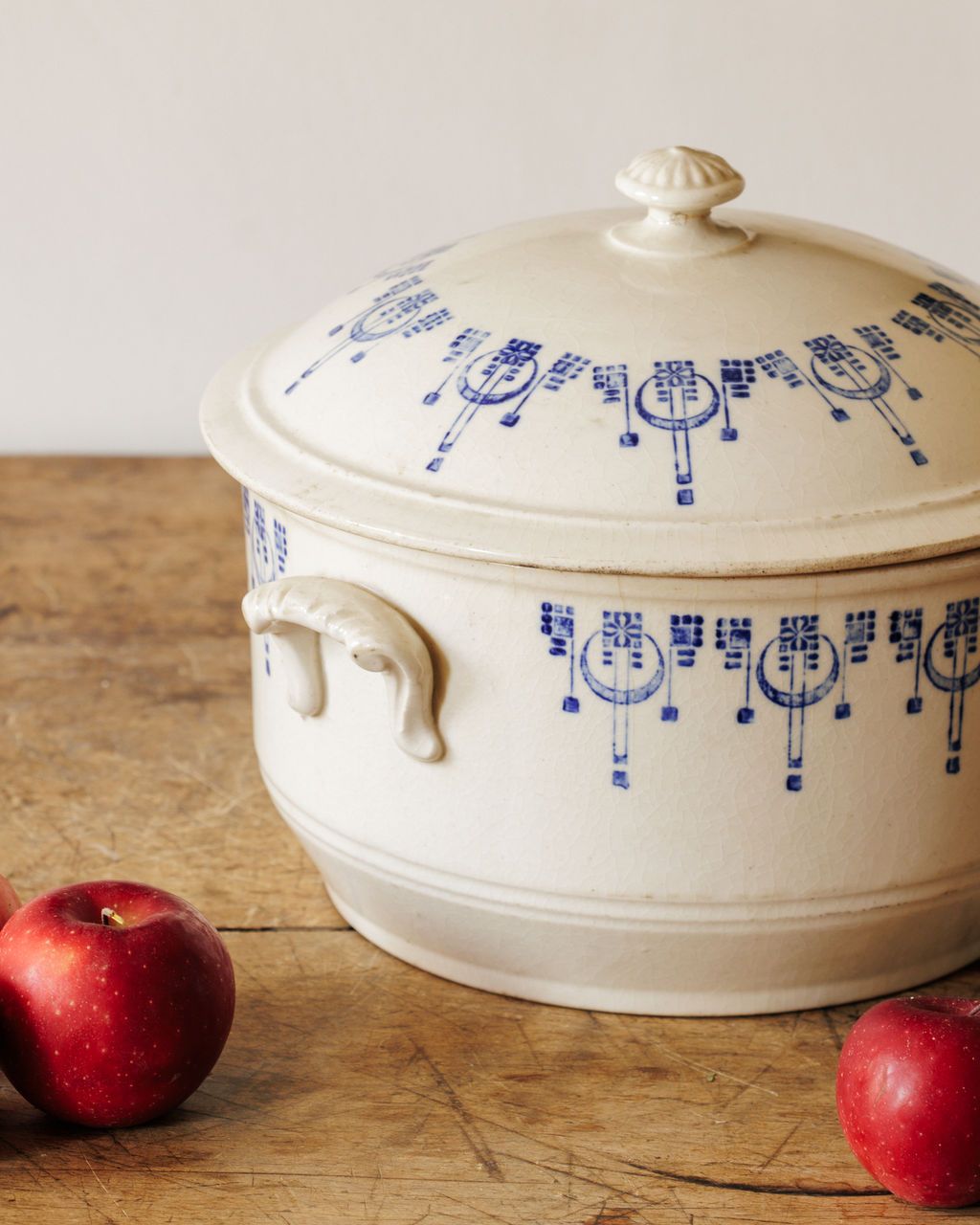 This large lidded tureen carries the unmistakable charm of Saint-Uze pottery, the celebrated ceramic tradition that emerged in the Drôme region of France in the mid-19th century. Workshops around Saint-Uze became known for their creamy white earthenware decorated in vivid cobalt, a style born from newly discovered local clay that fired beautifully and allowed for crisp stenciled motifs like the blue florals circling this piece. Originally made for everyday table service, tureens like this were staples in French households, used for sauces, vegetables, or anything that needed to stay warm on the table. Sylvie loves how this one brings a bright hit of classic blue-and-white to a modern kitchen, whether holding olives or sea salt.