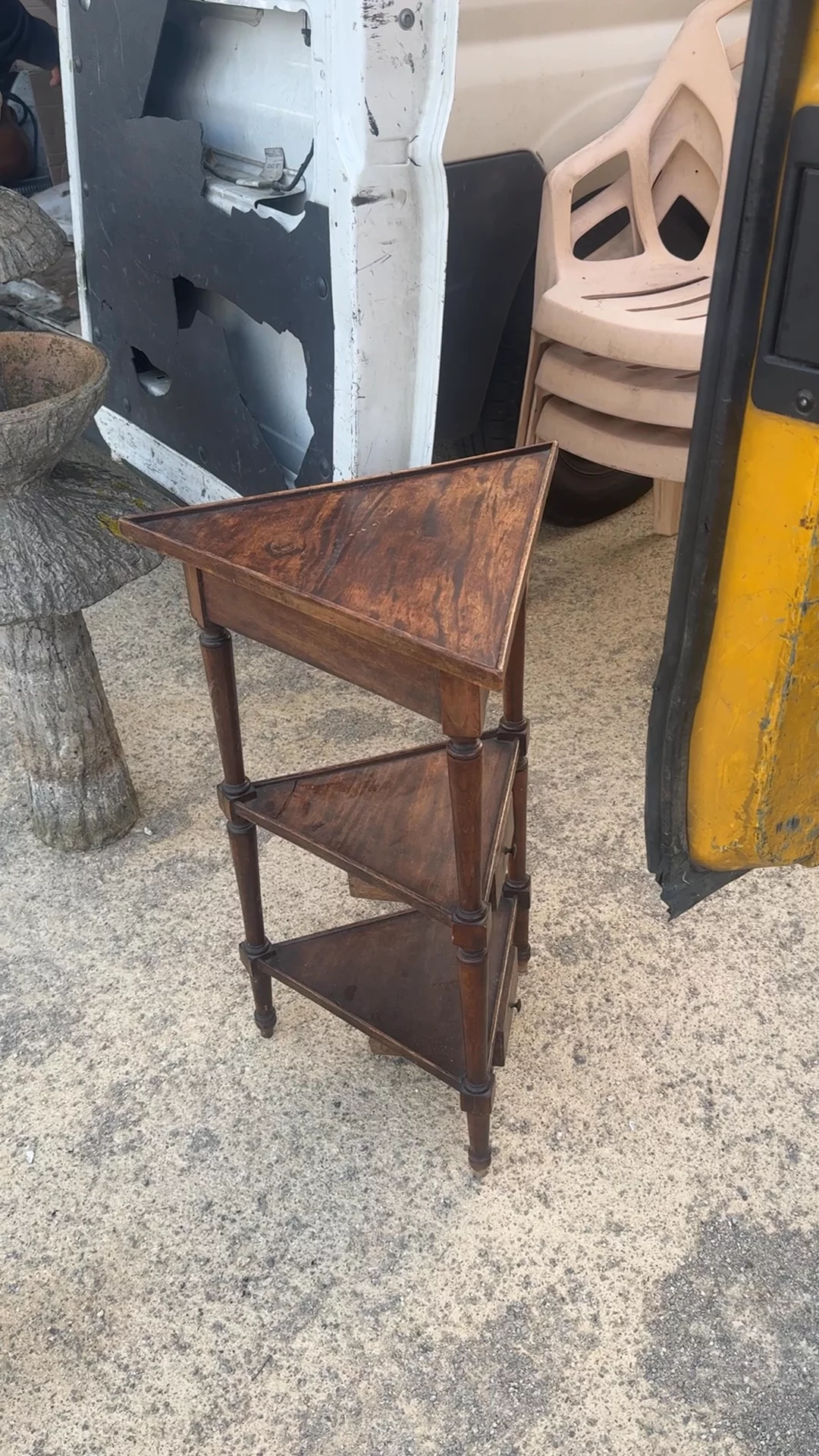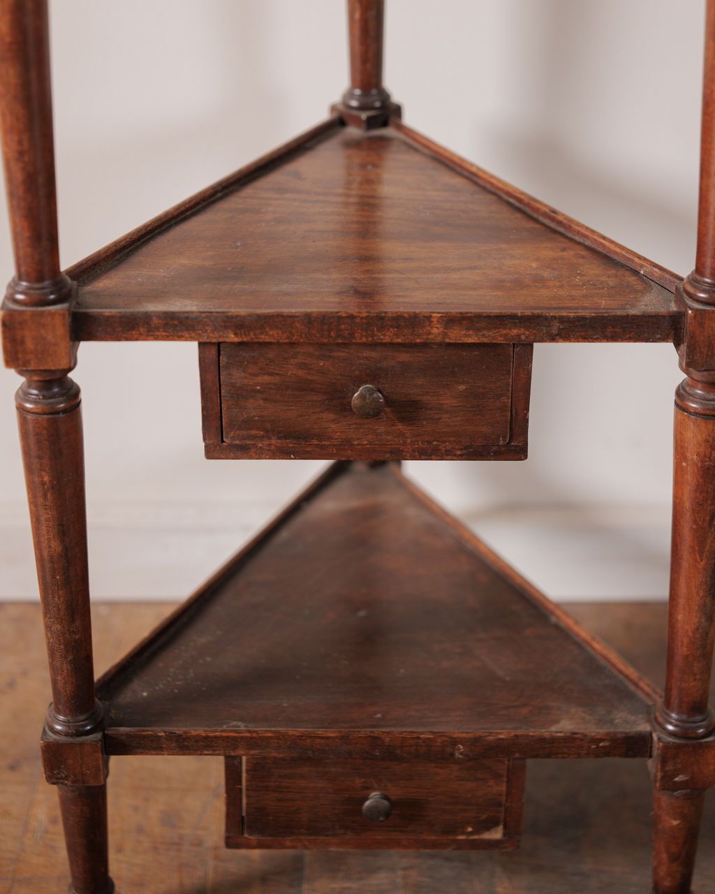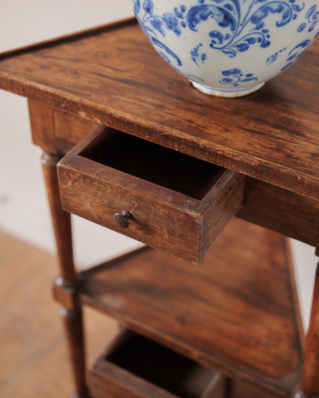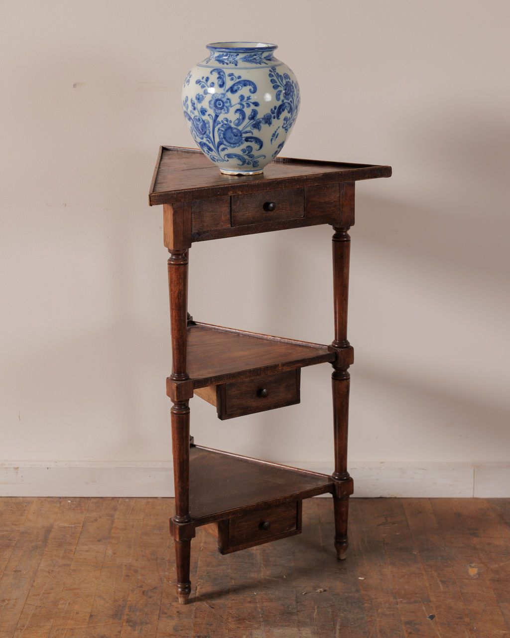 This corner side table makes the most out of the smallest spots. Tall and slim, it tucks into places most furniture can’t reach, with turned delicate legs and triangular shelves that each hide a tiny drawer. There’s just enough room for a morning coffee, a paperback, and yes, a cat who insists on supervising. Sylvie loves it in a bedroom or reading corner where its shape and small details can actually be appreciated.