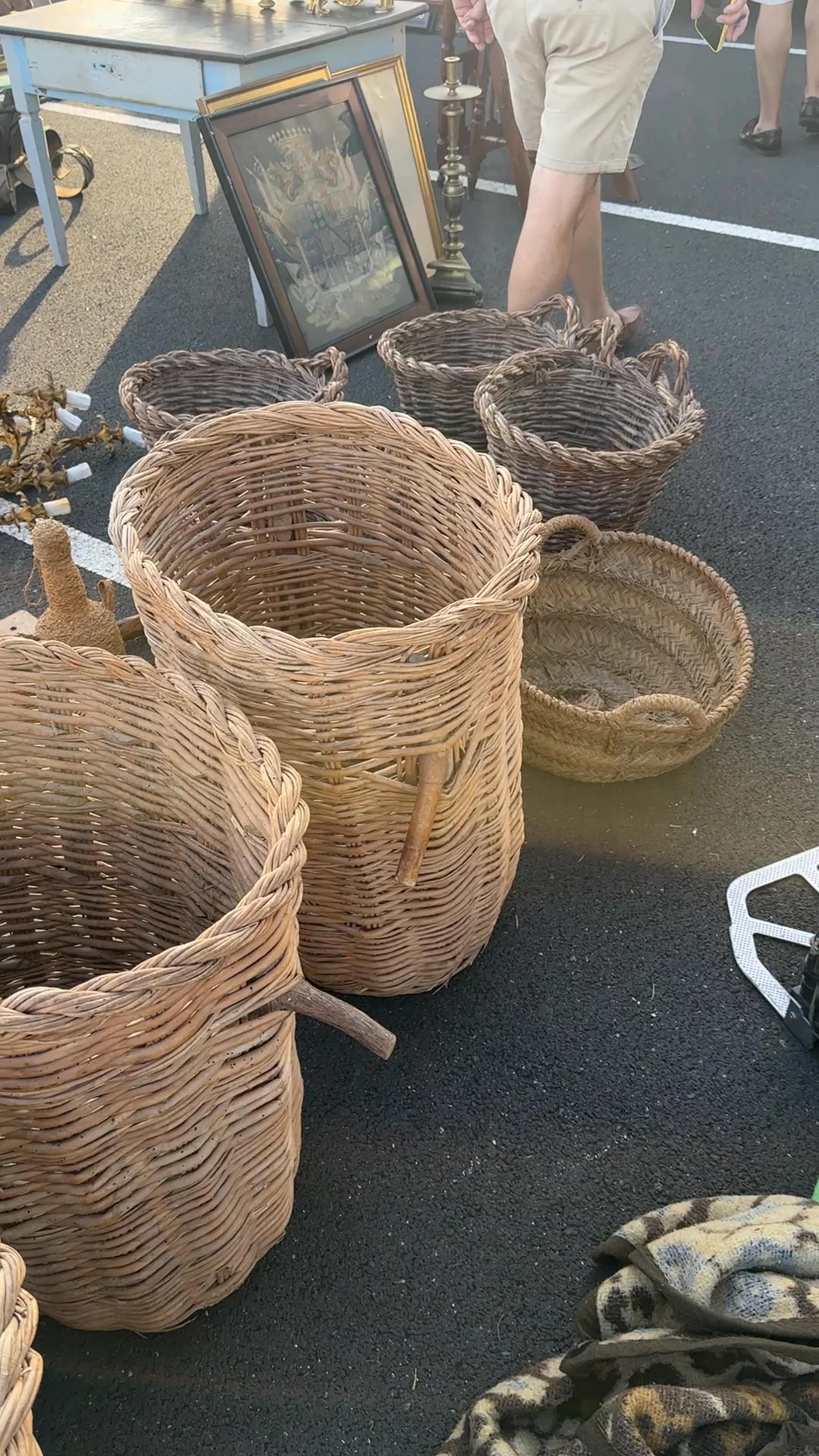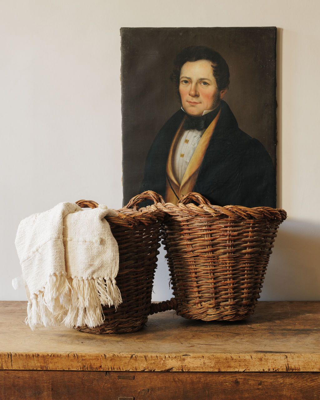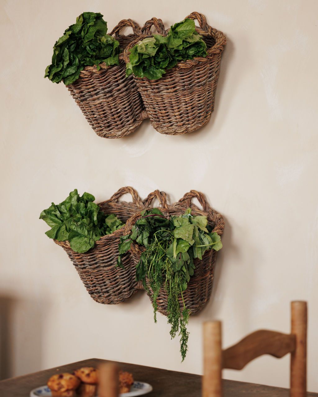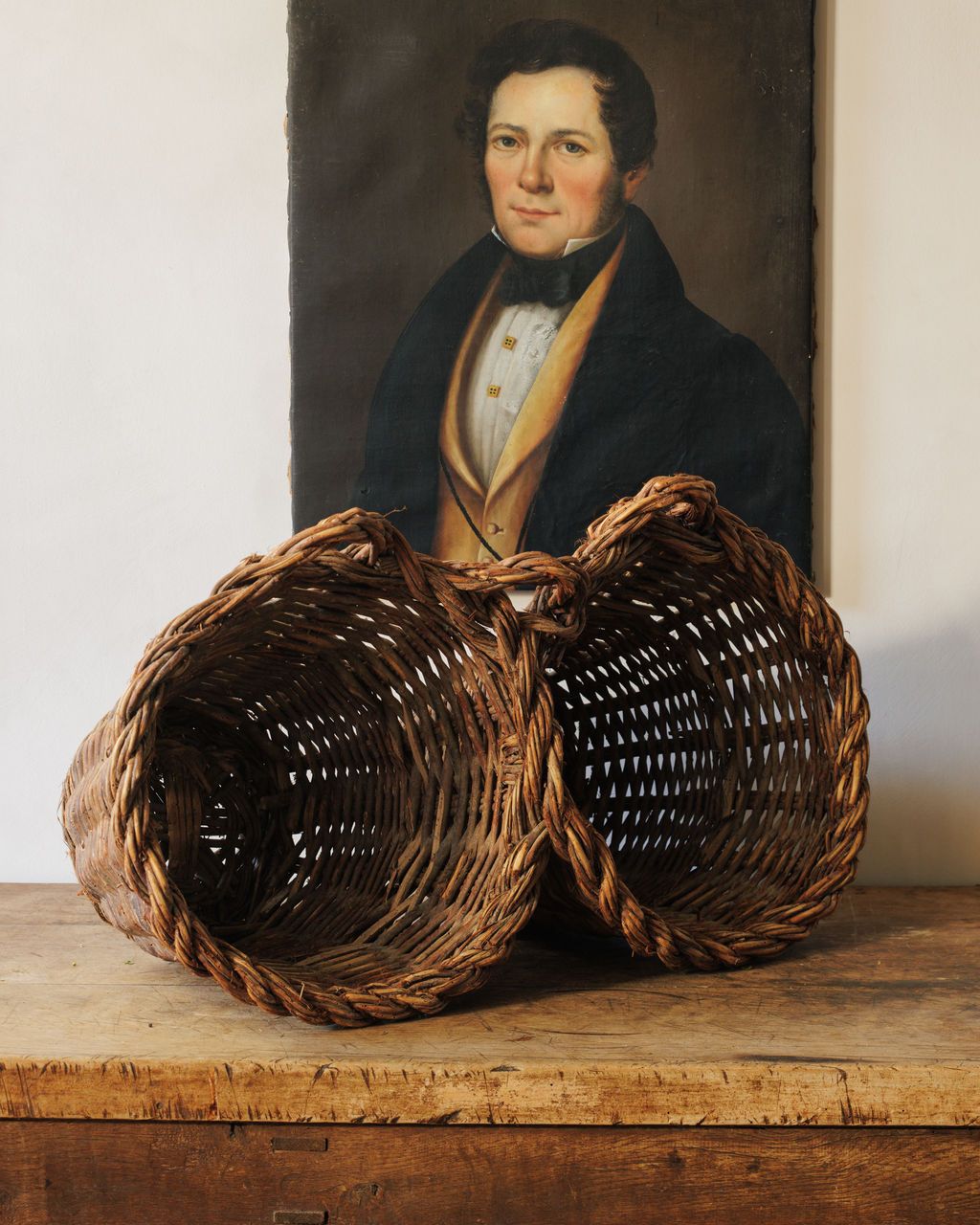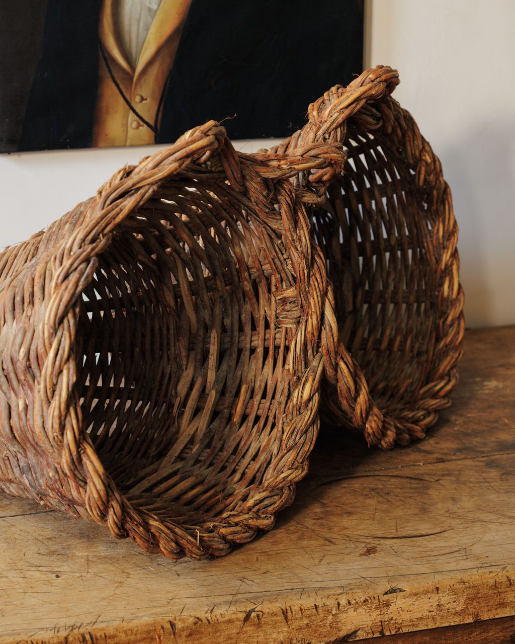 These are classic Spanish harvesting baskets, and their form gives away exactly how they were used. Made in Spain in the 19th century, baskets like these were woven for fieldwork - carried out to the garden or orchard, filled by hand, then hung up by their twin handles to keep produce off the ground and within reach. You see them most often associated with greens, herbs, olives, and smaller crops that were gathered little by little rather than all at once. The double-handle construction wasn’t decorative - it allowed the baskets to be lifted easily when heavy and hooked onto nails, beams, or walls once brought inside. Sylvie loves them hung as they would have been originally - filled with greens in a kitchen, used for storage, or simply left empty to let the form speak for itself.
