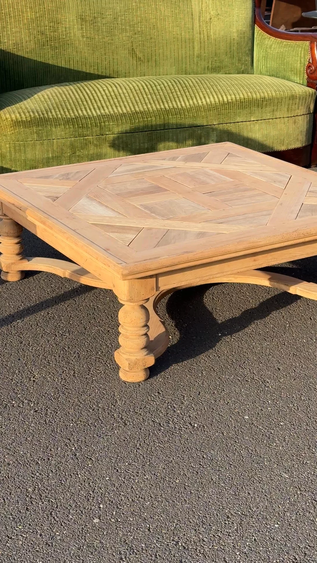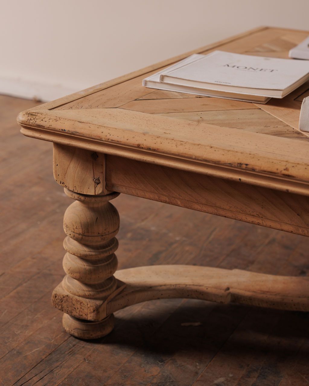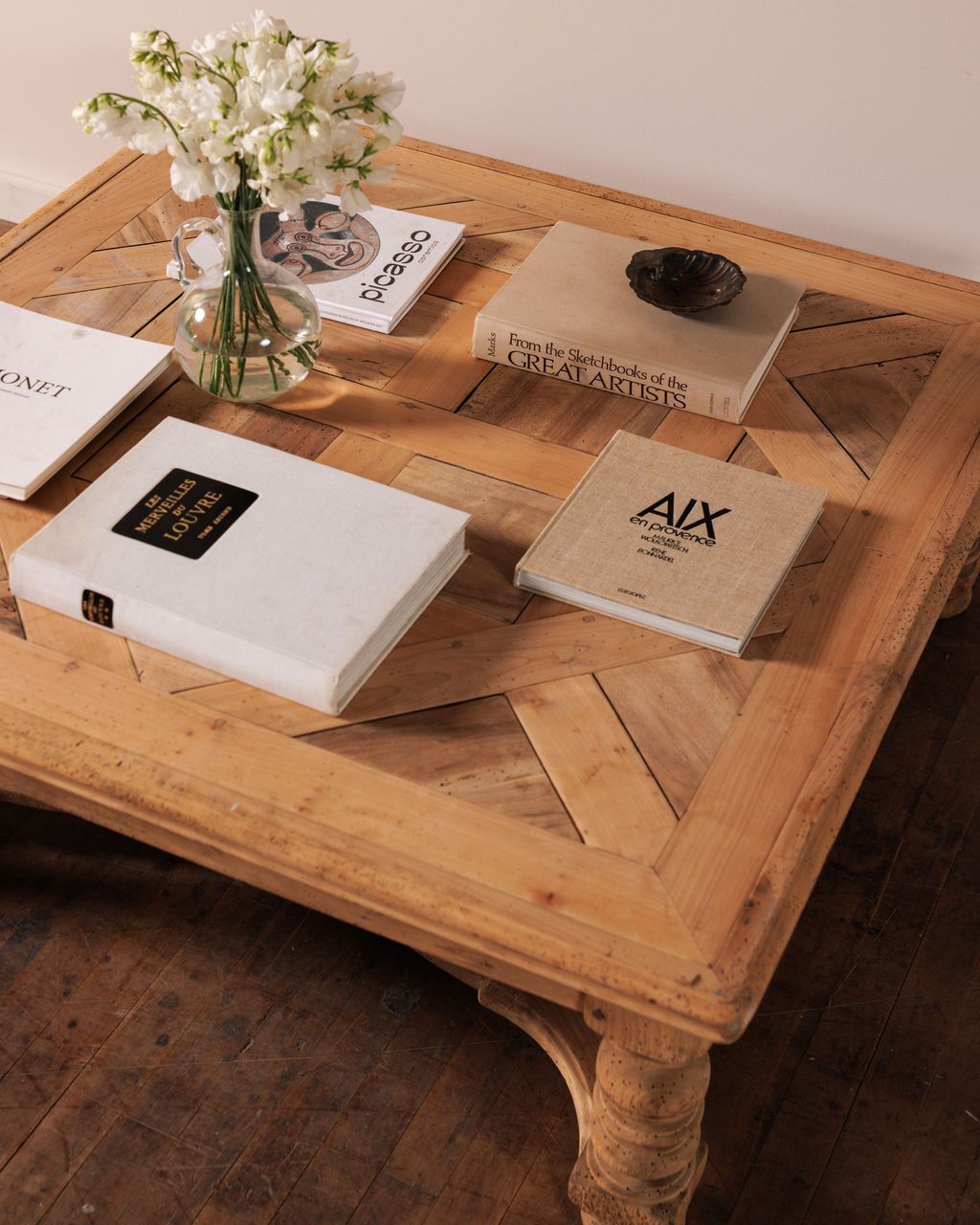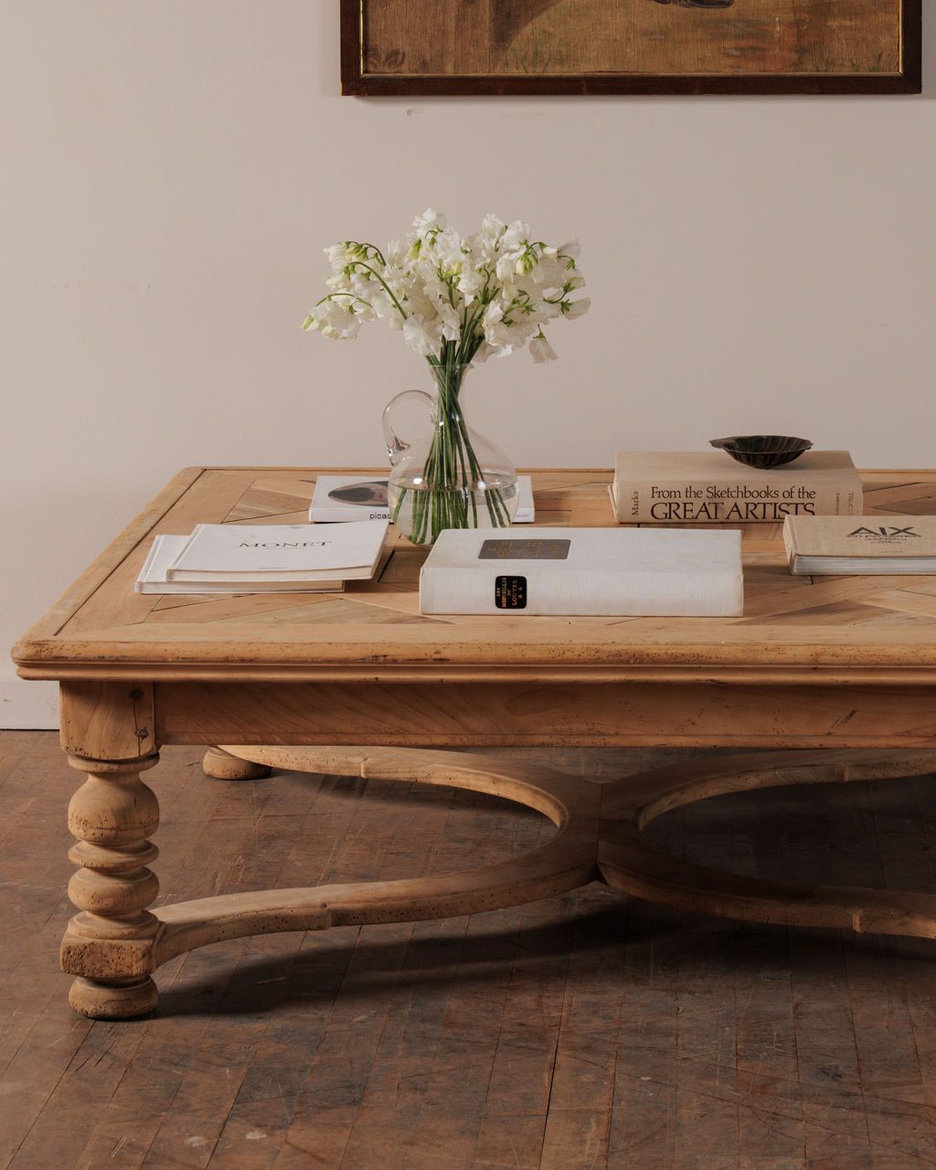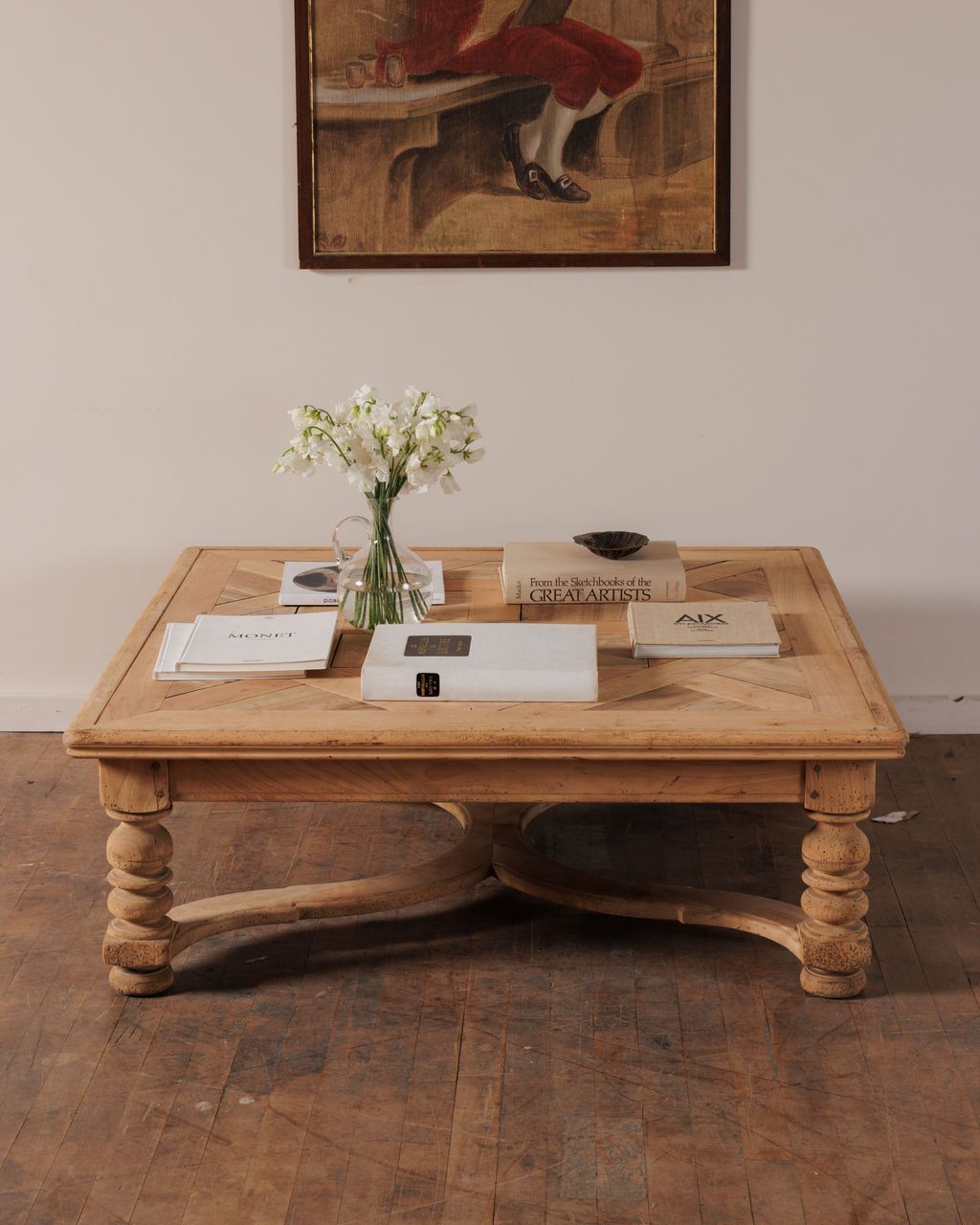 Found in Béziers and dating to the mid century, this beautiful oak coffee table pairs a large square top with the geometry of a parquet layout and a curved stretcher base that softens the structure. Sylvie loves it styled with magazines to a proper spread of cheeses and a bottle you’ve been saving.