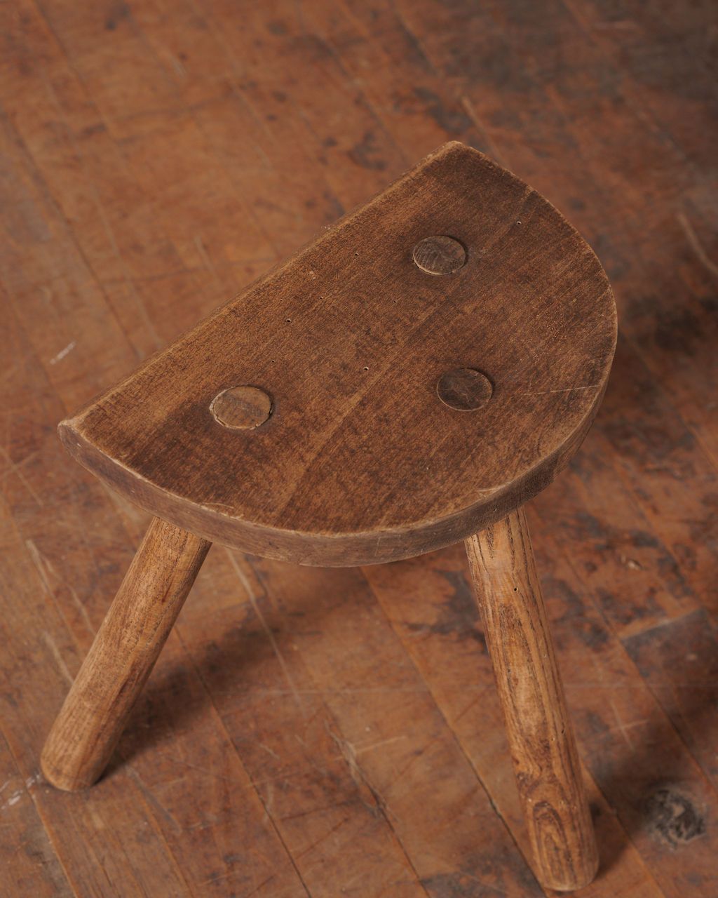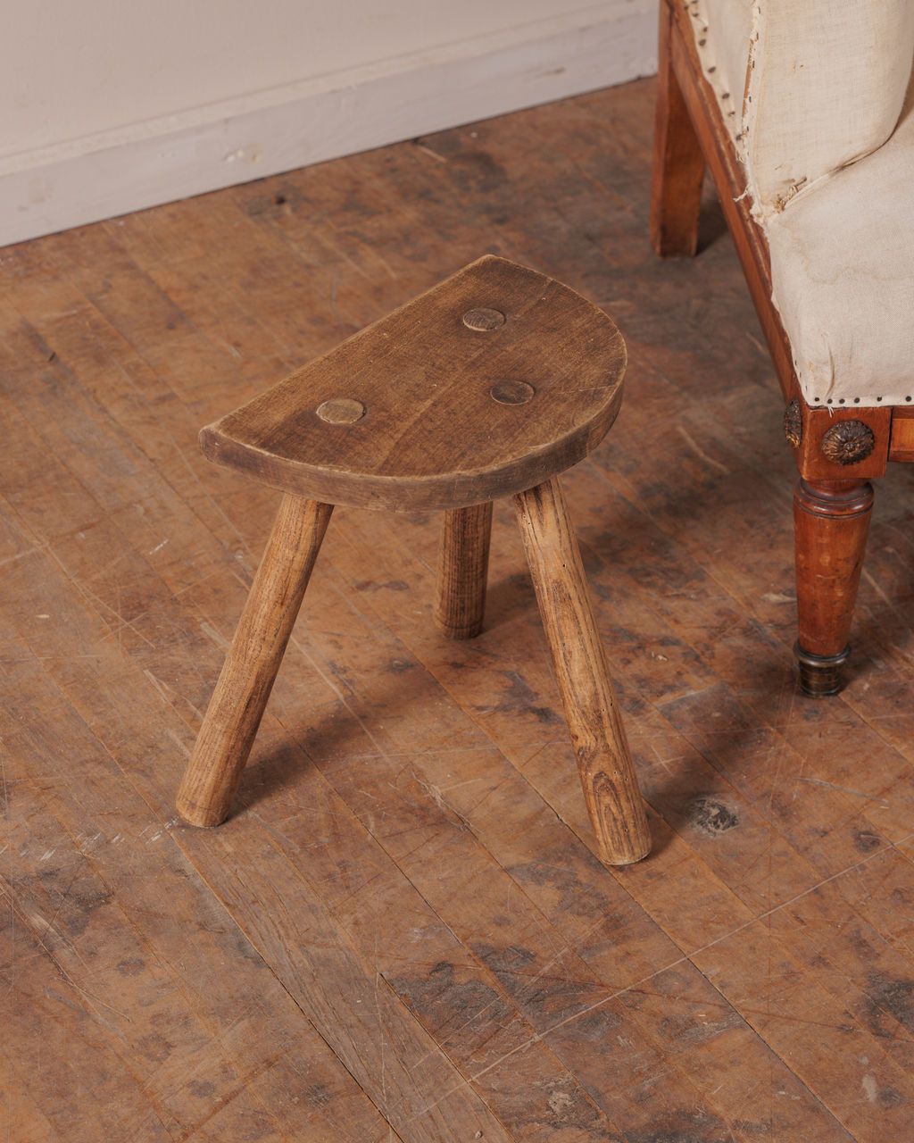 This little half-moon stool was originally built for milking, its three splayed legs keeping it steady on uneven barn floors. Found in France and carved from solid hardwood, it now moonlights as extra seating or the most charming petite side table. Sylvie keeps one beside the bath for a book and a glass, and another in the living room as a low perch for whatever she’s currently obsessed with.