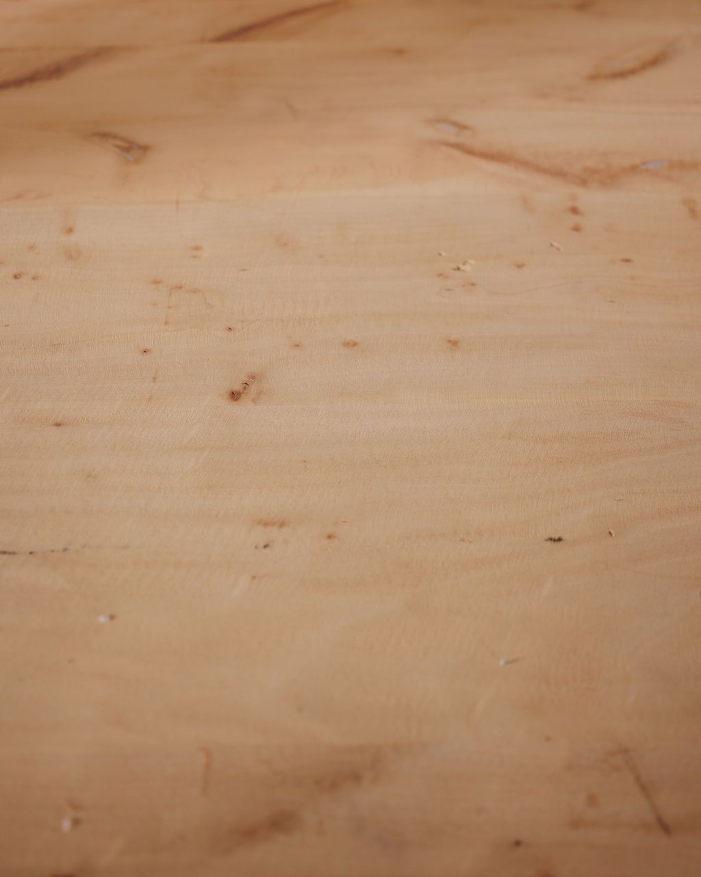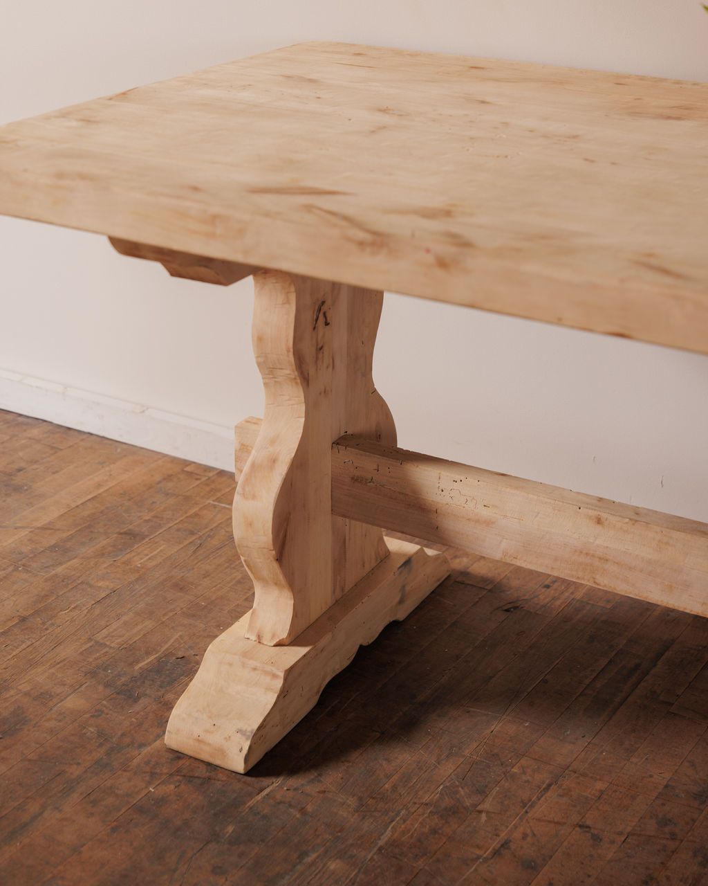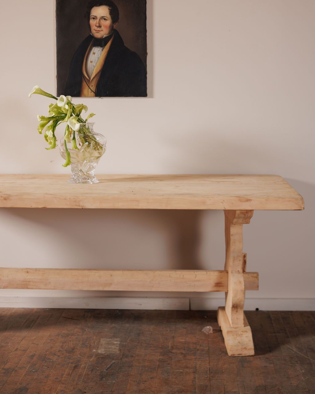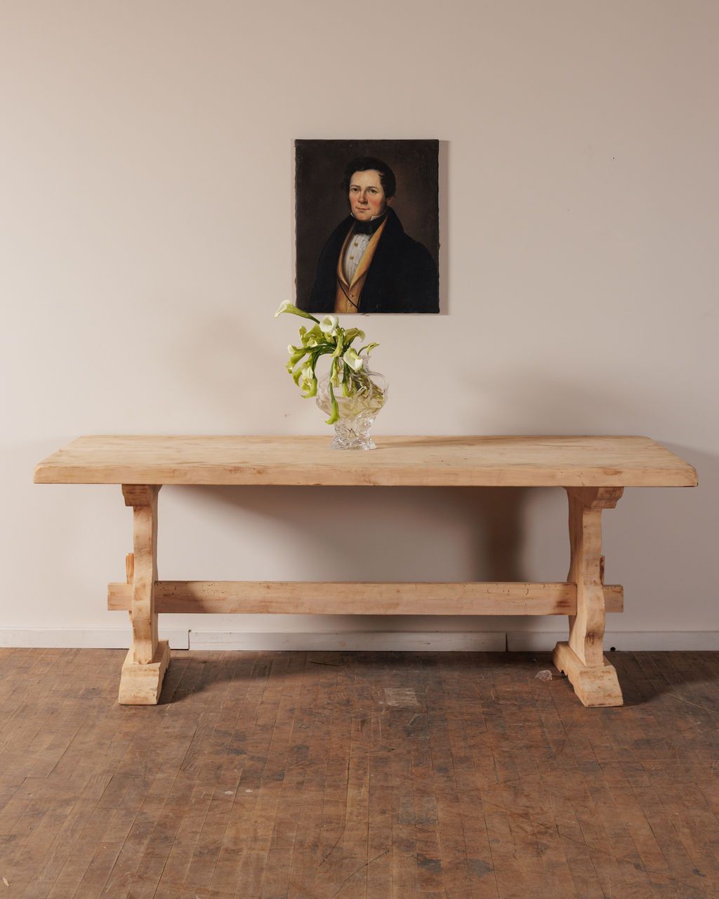 Found in Béziers and sanded back completely to a pale raw finish, it shows off the solid wood beneath, along with a few deep surface gouges that tell you it earned its keep. The trestle construction comes apart into legs, stretcher, and pins, and the legs are securely bolted to the top in the traditional way. Sylvie loves this table for its scale and simplicity, the kind that anchors a dining room, holds court at the center of a kitchen, or becomes the ultimate project table for a creative household.