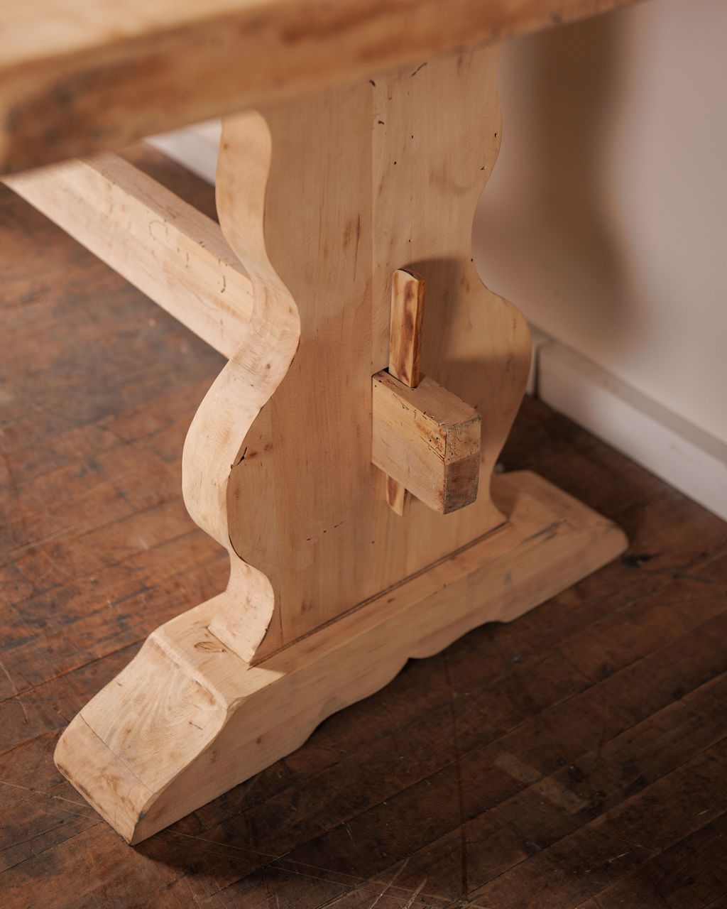 This style of table, a trestle table, comes apart into legs, stringer, top and pins. The surface has been completely sanded to a raw wood with tool marks evident. As with many antiques, this piece may show gentle repairs, cracks, scratches, holes, years worth of patina, and stains - just the way we like it.