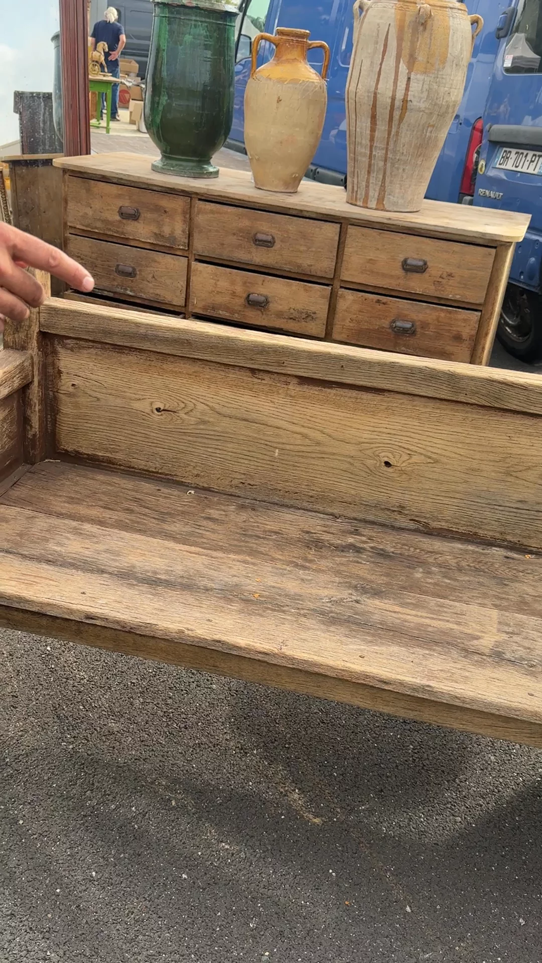 This bench has already done its job for a long time - and it’s ready to keep going. Originally from Portugal made from solid oak, it was built with a single wide plank seat, a tall back, and straightforward pegged construction meant to hold real weight, day after day. The proportions are generous, the arms thick and worn smooth where people naturally reached for them. The surface shows exactly what you want to see: softened edges, old tool marks, small splits in the top board, and one early pinned repair that’s been holding firm ever since. Sylvie loves it in an entry where boots get kicked off or along a wall as a low bench that anchors any room.