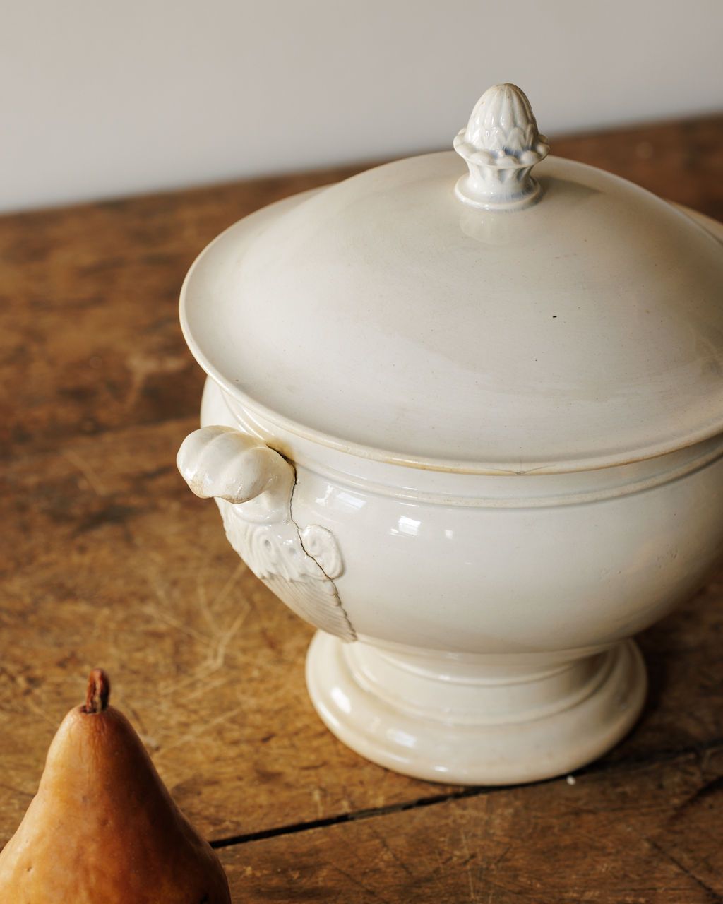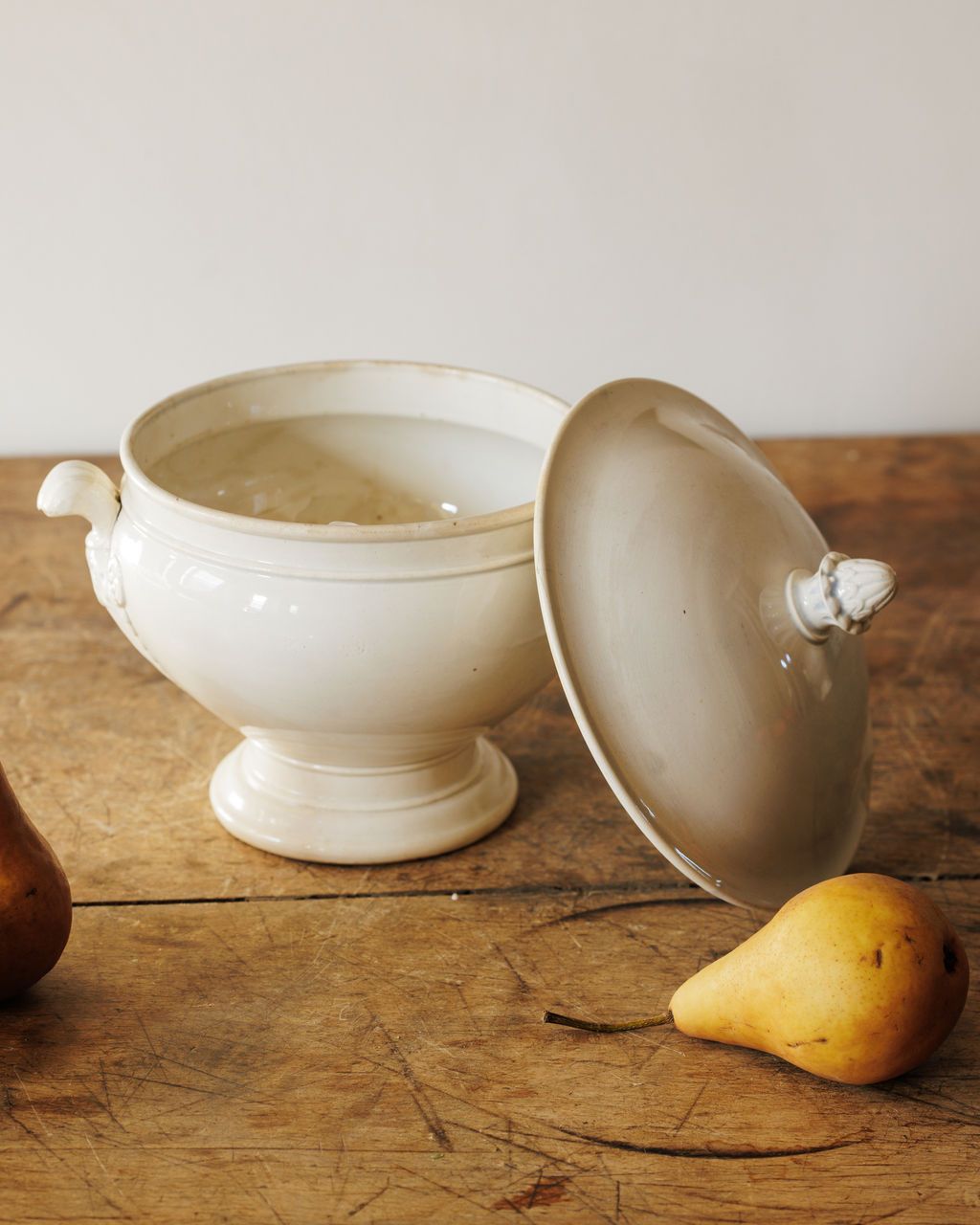 A tureen like this one feels straight out of a French country kitchen where broths simmered slowly and were carried to the table in vessels built for real family meals. Originally used to serve soups and stews in generous portions, its rounded pedestal base and sturdy side handles made it easy to lift and pass around without fuss. Sylvie loves it now for serving a family sized pot of soup or for anchoring the center of a table with something warm and homey.