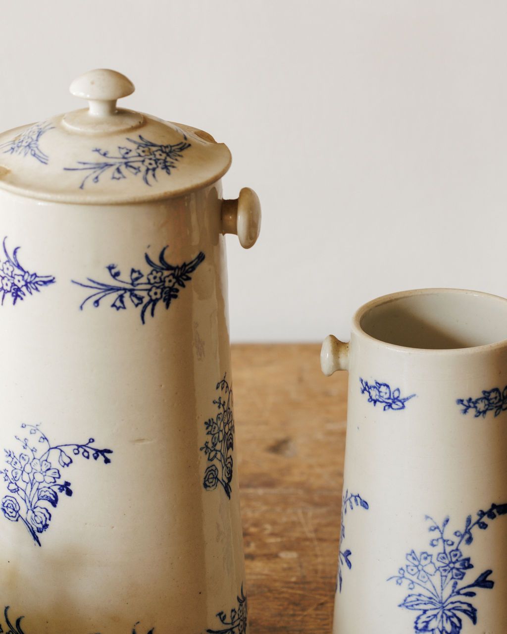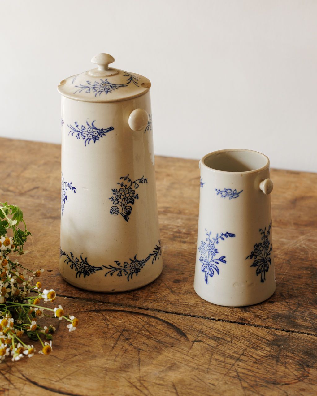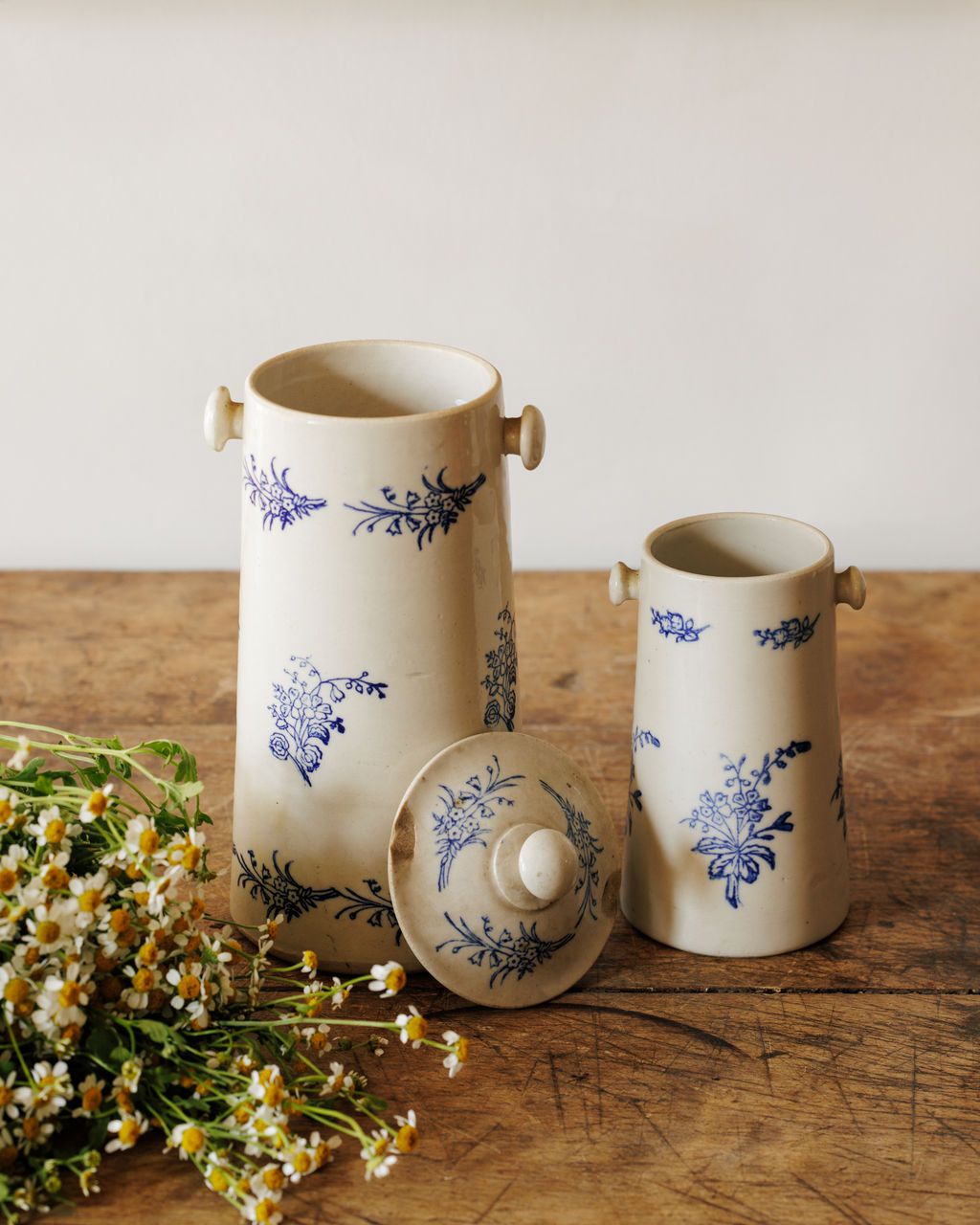 These Saint-Uze pots show off the classic white-and-blue palette that made the Drôme region’s pottery so recognizable in the 19th century. Two available and sold separately, one tall with a lid and one shorter without, each with a gentle taper from wide to narrow and a pair of small knob handles. Saint-Uze workshops were known for their durable stoneware and delicate cobalt decoration, a combination that made their pieces staples in French kitchens for well over a century. Sylvie loves them as utensil crocks, vases, or sculptural pieces on open shelving.