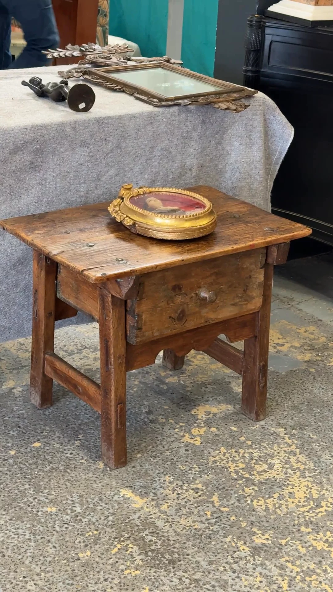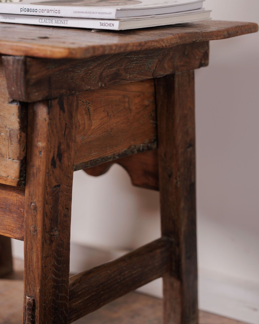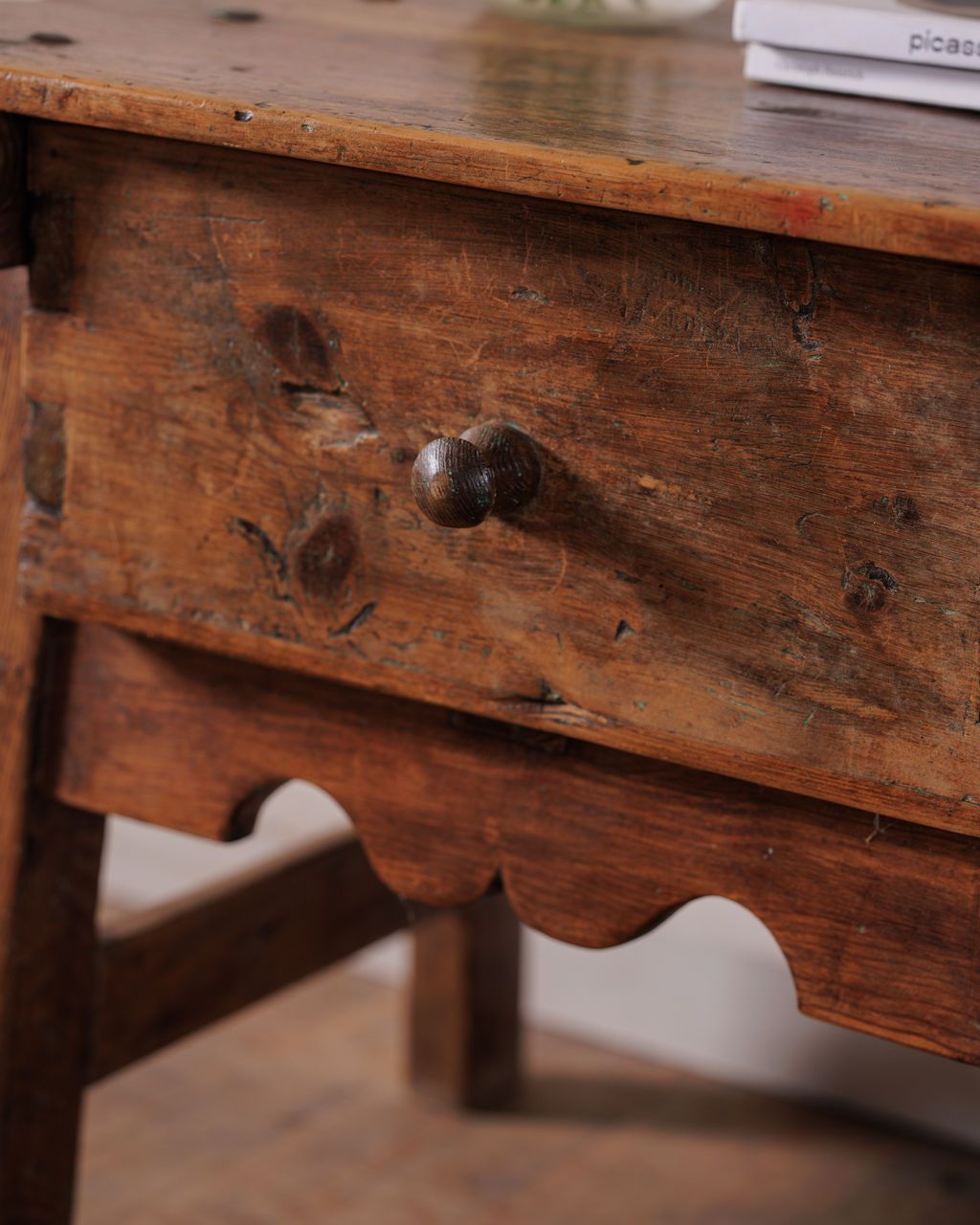 This small table has one job to do, and it does it well. Found in Avignon and dating to the 19th century, this Spanish side table was originally made as a utilitarian household piece, hand built with thick planks, visible joinery, and a single drawer for storing everyday necessities close at hand. The slightly tapered legs, scalloped apron, and irregular surface marks all speak to its hand carved construction and working life rather than decorative excess, with wear concentrated where hands would have reached for the drawer day after day. Today, this works beautifully beside a couch or chair as a compact side table, or as a bedside table where its drawer keeps essentials within easy reach.