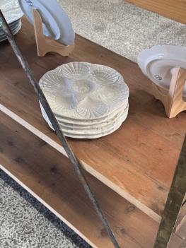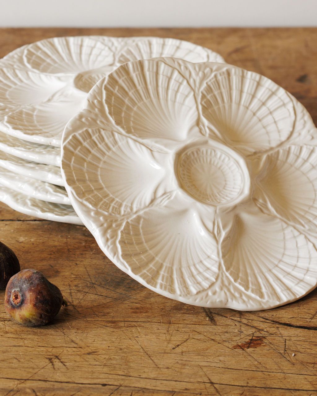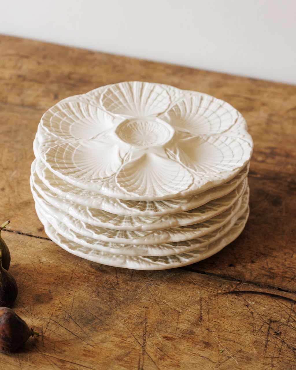 Oyster night just got more French. These large white oyster plates, found in Avignon, feature deep sculpted wells and a raised center perfect for lemon wedges or a salty little sauce. Six available and sold individually, each one has that glossy, slightly decadent look that makes even a casual seafood night feel like an event.