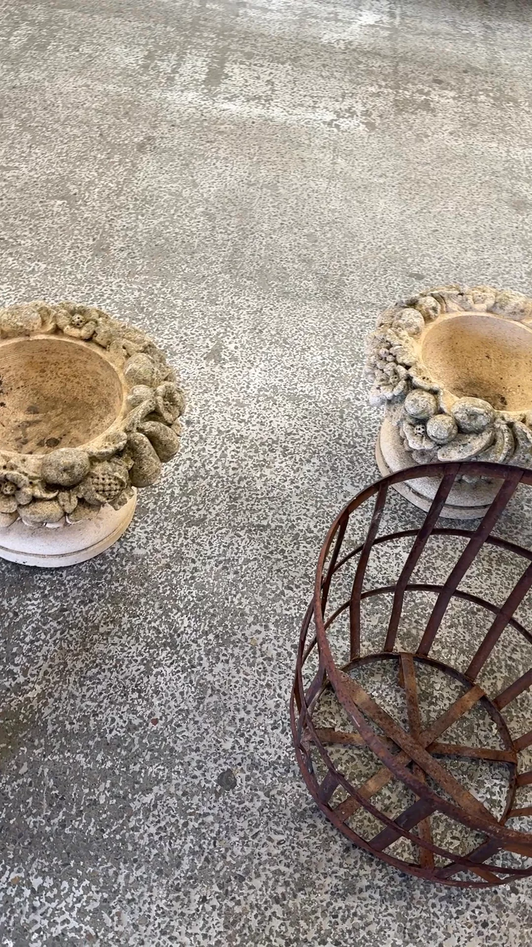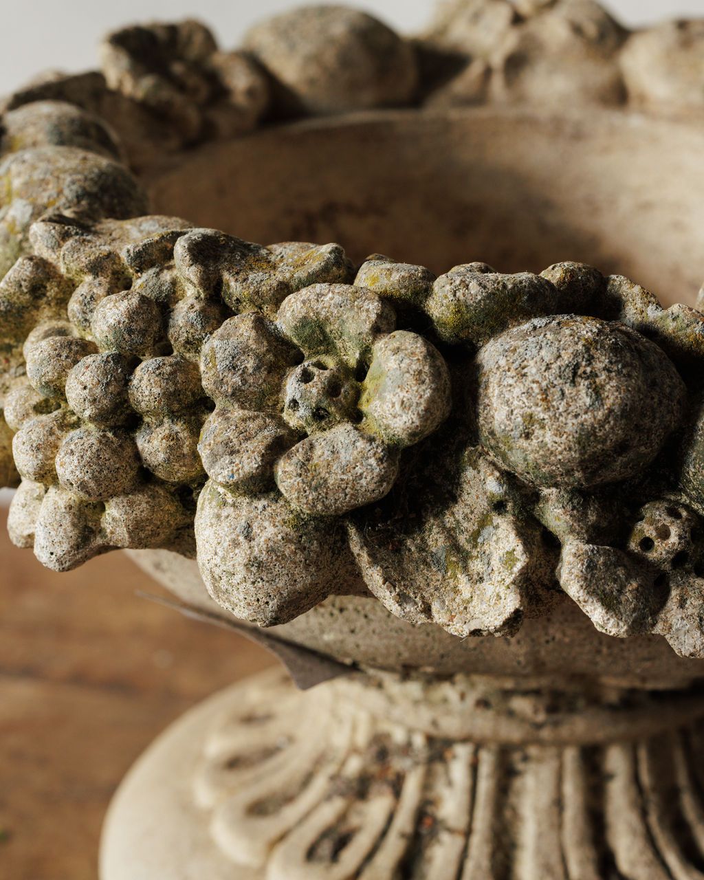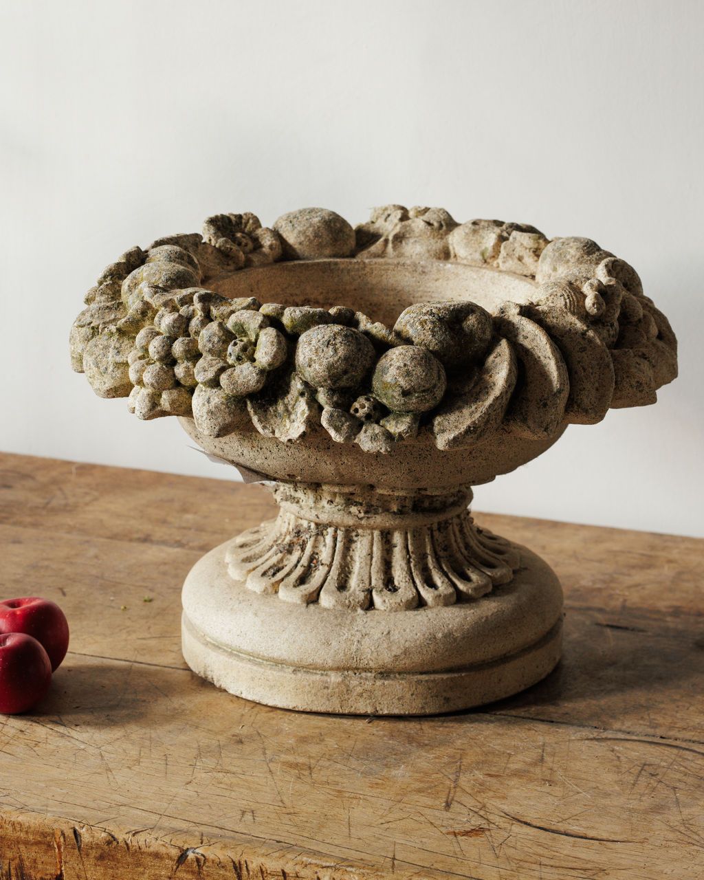 Found in France, this carved stone planter dates to the early 20th century and still has its full wreath of fruit and leaves intact - apples, grapes, figs, and curled foliage carved in deep relief around the rim. The stone has a pale, chalky surface with weathered edges that make the details feel even richer up close. The bowl stands on a fluted pedestal base, cut from the same block, giving it a solid, architectural feel. Sylvie likes it as a statement at an entry or on a console, where the carved fruit becomes the moment.