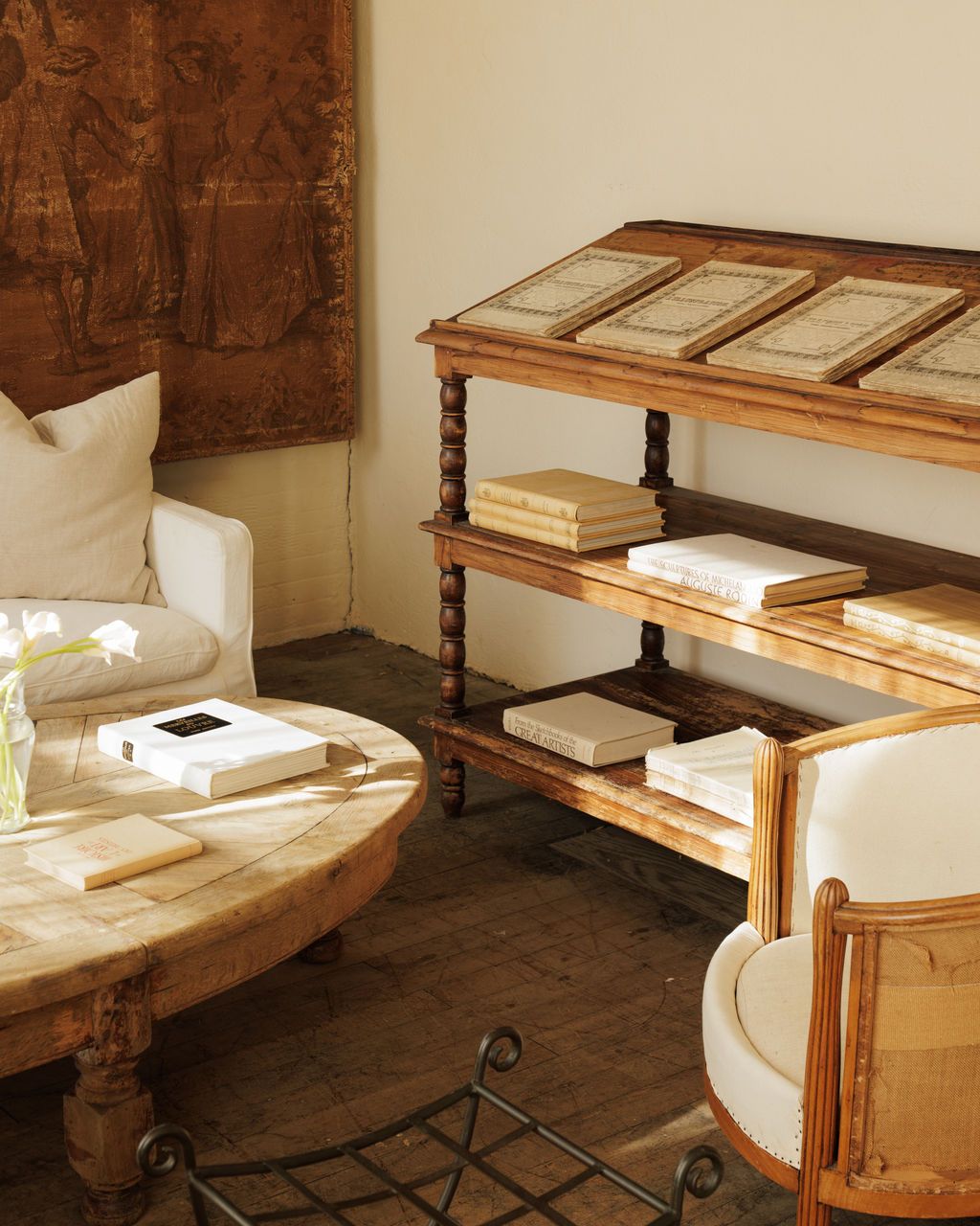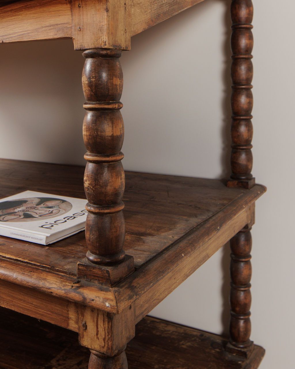 The kind of piece that makes you want to rearrange your whole room just to give it a proper moment. This Italian oak grocery stand, found in Avignon but originally from Northern Italy, was once used to display produce and provisions, which explains the angled top shelf and the wonderfully worn surfaces from years of constant handling. Sylvie loves it now for books, artwork, or a rotating display of treasures that deserve to be seen, not stored.