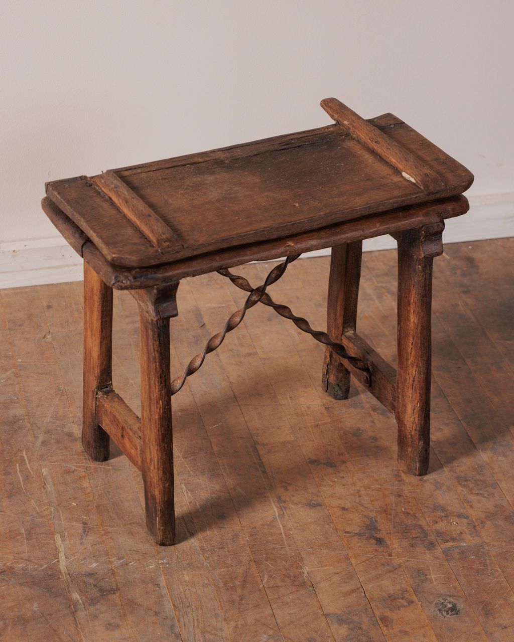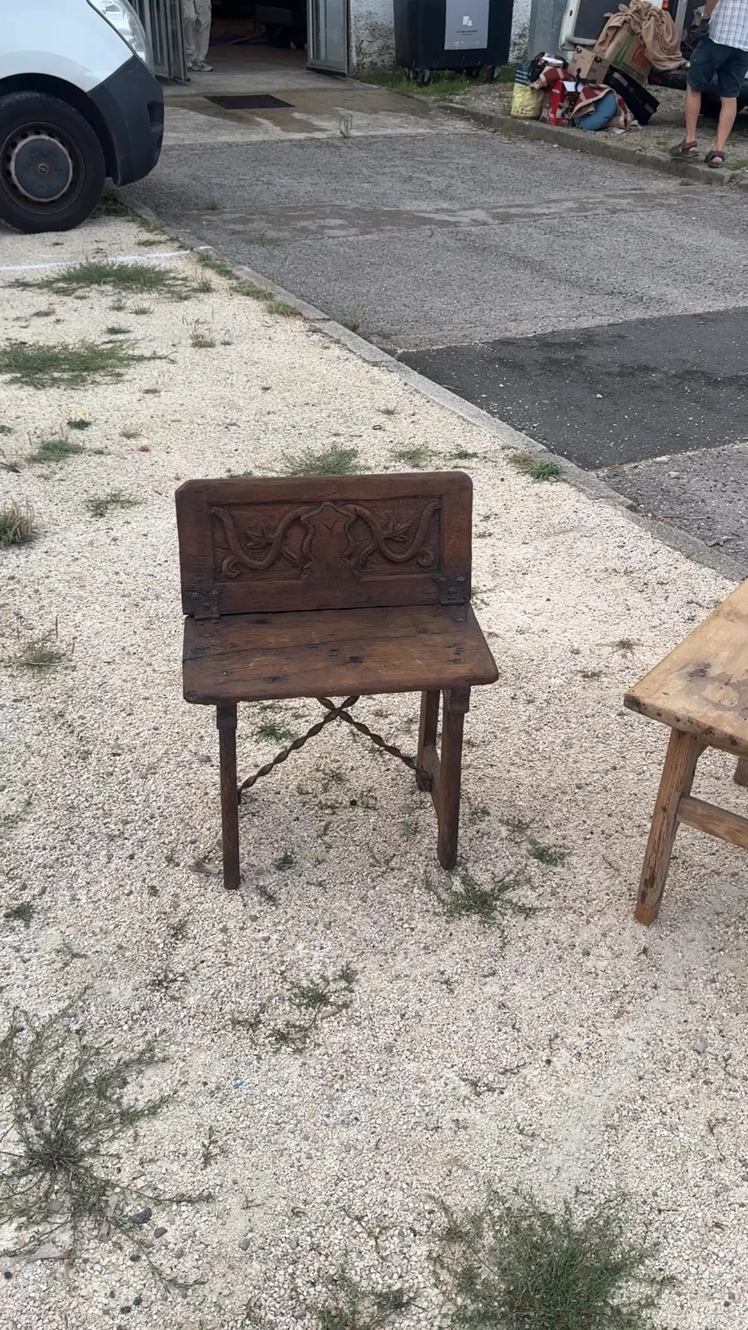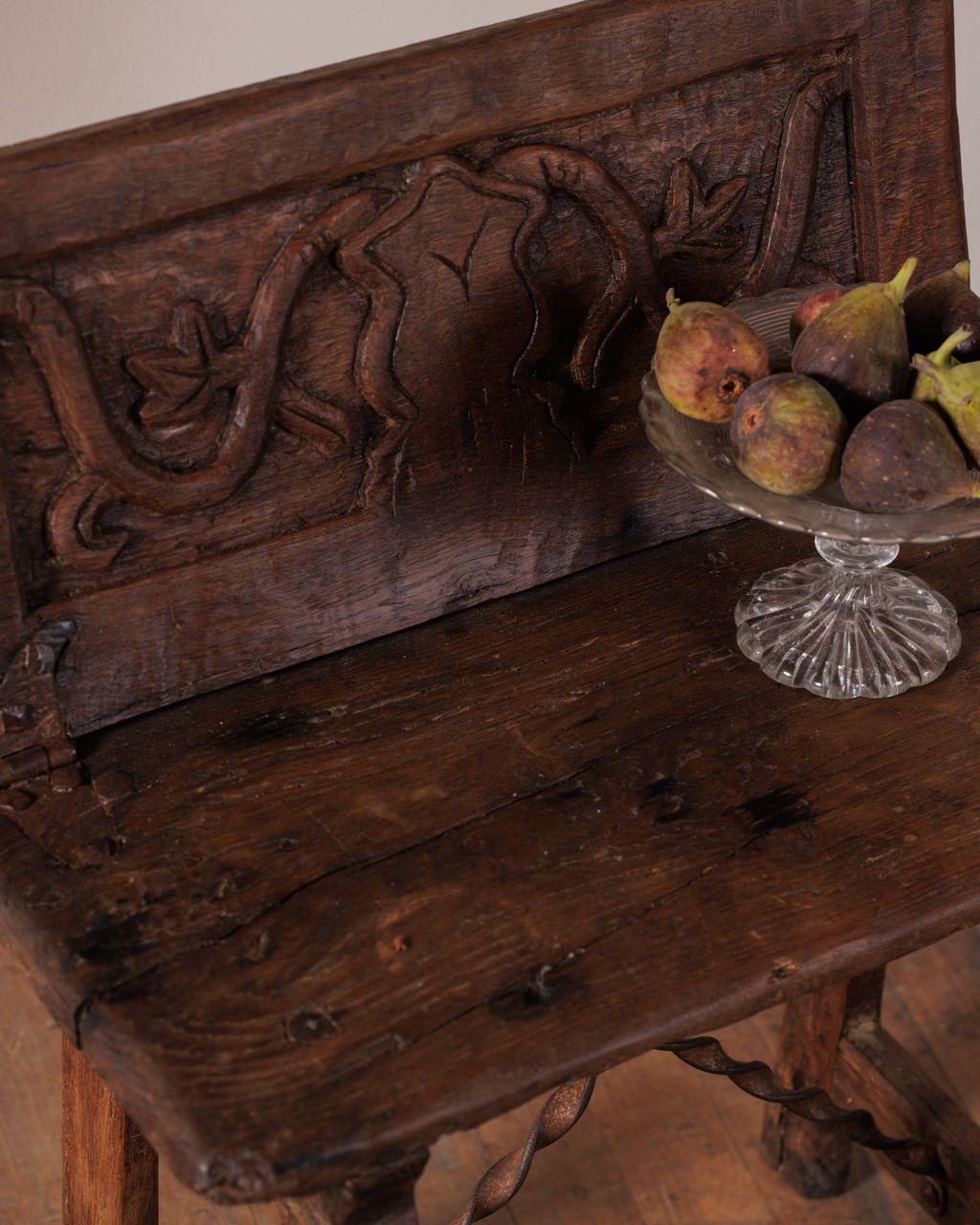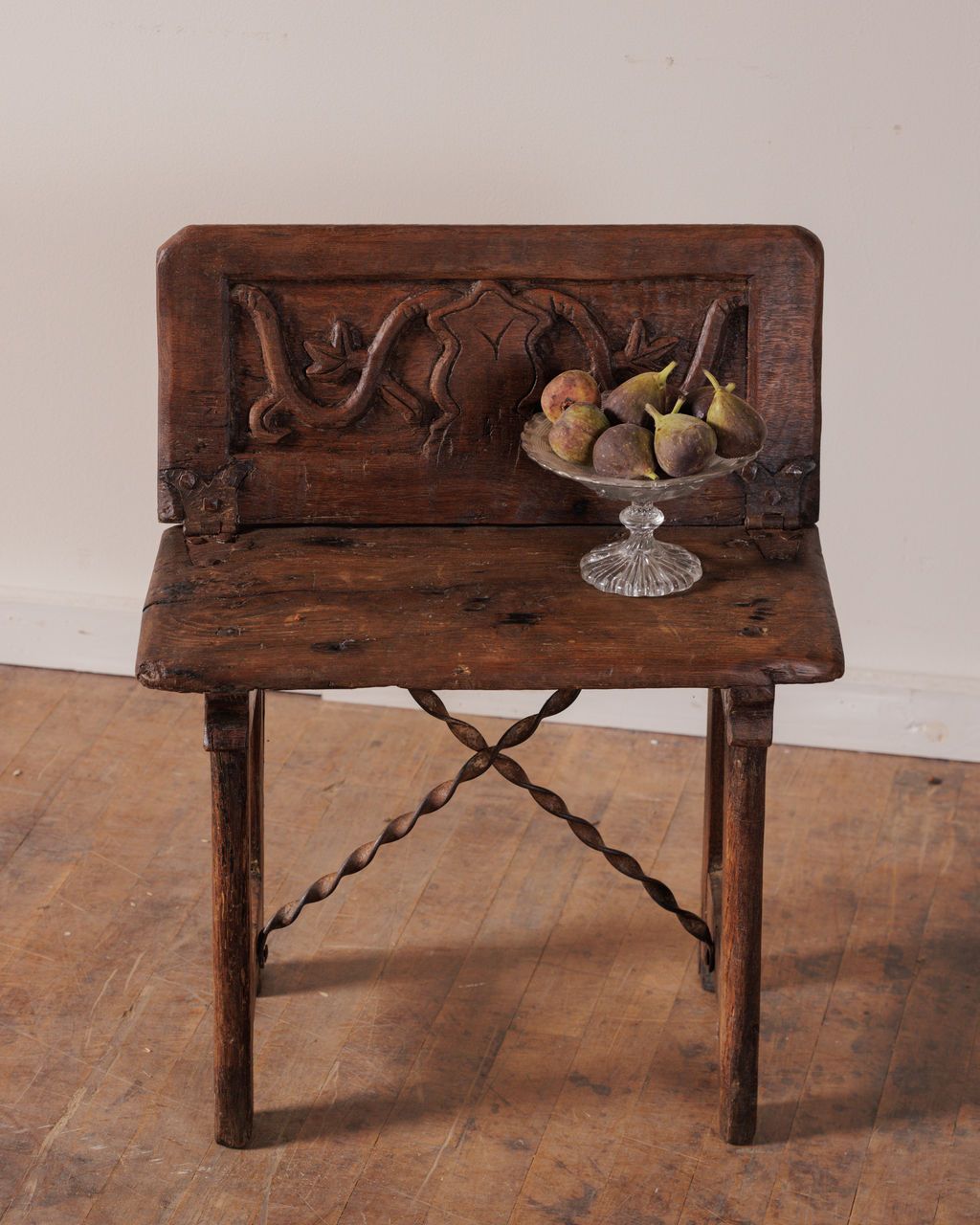 Talk about rare. Sylvie pulled this 17th-century Spanish stool out of a masia in Catalonia, the kind of piece that’s been orbiting family life since the 1600s. The carved backrest is hinged, cut by hand with bold geometric motifs, and the seat is a thick slab of wood held by an iron stretcher that still shows its original twist. Sylvie loves it as an accent chair or hallway perch, adding sculptural presence without taking up much space.