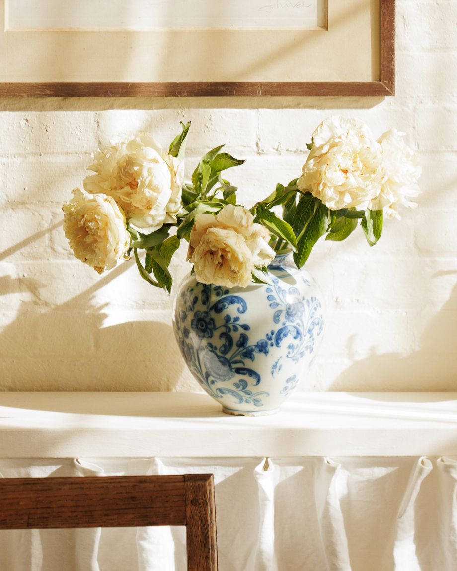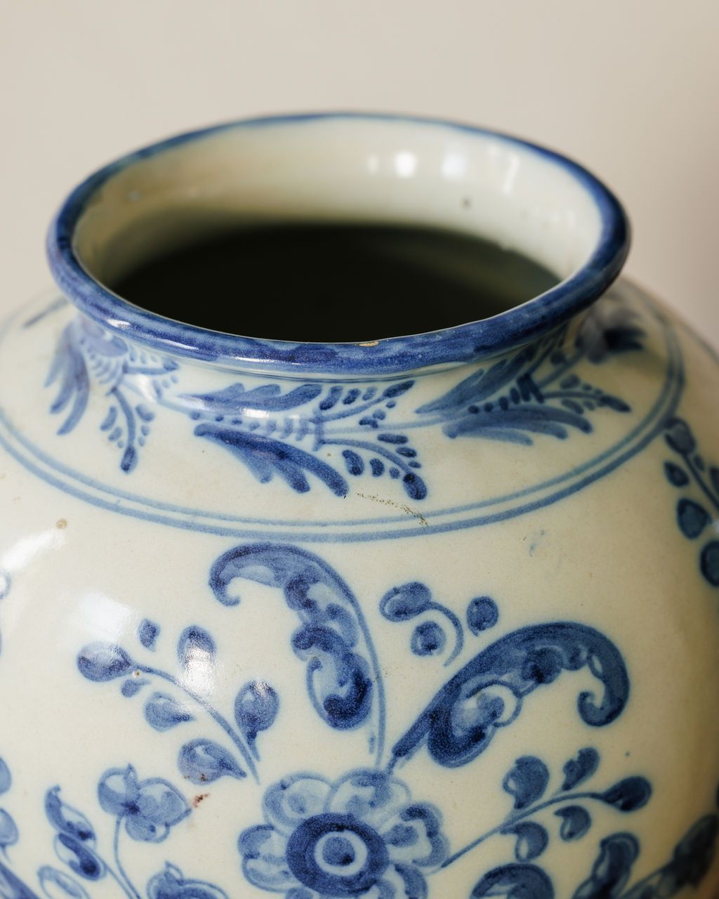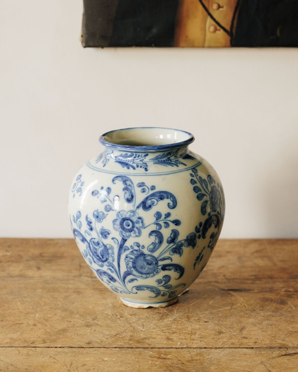 This rare Spanish pot has the kind of rounded blue and white form collectors hunt for. Found just outside of Montpelier, it shows off traditional hand-painted motifs and a generous belly that gives it real presence on a shelf or table. Sylvie loves it on its own as a sculptural moment or fill it with branches or flowers when you want something more dramatic.