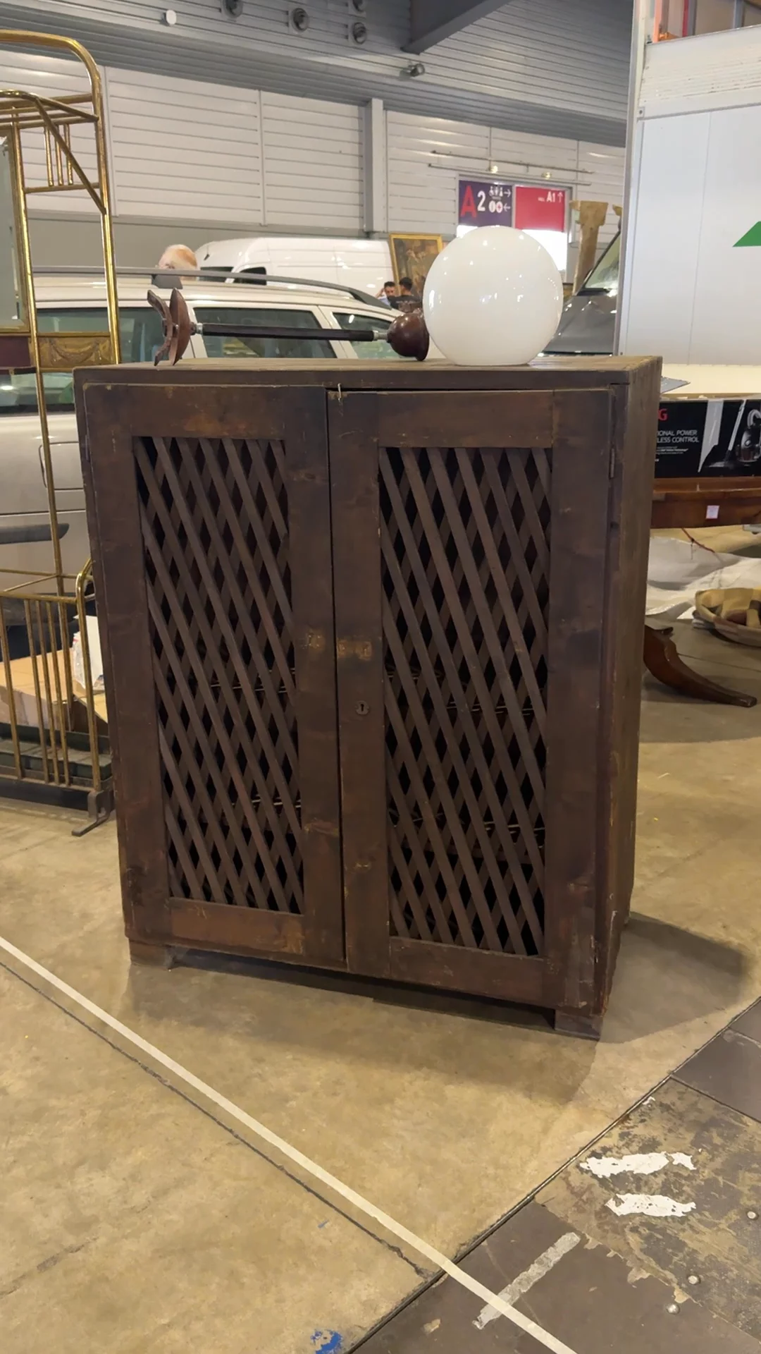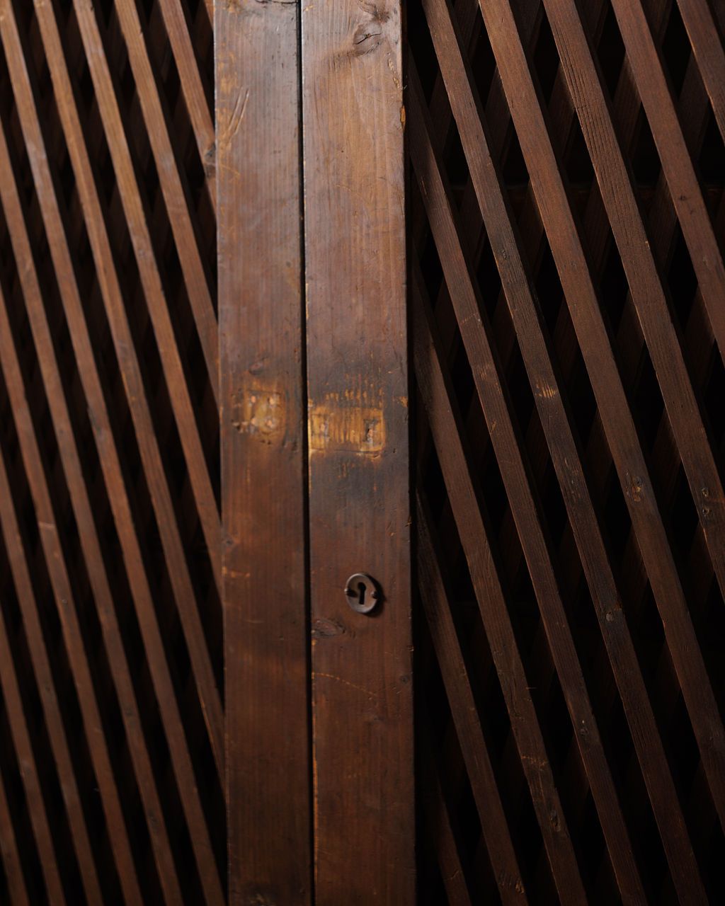 This Tuscan pine cupboard, found on its way from Italy with a life already lived, shows off beautifully cut dovetail joints and diagonally latticed doors that secure with a simple metal pin at the top. The open latticework was originally designed to allow air circulation around stored food, which kept produce, cheeses, and breads from spoiling in warm kitchens before refrigeration. Inside are two sturdy shelves. It still stands solid and still brings all the usefulness and character that made her stop in her tracks.