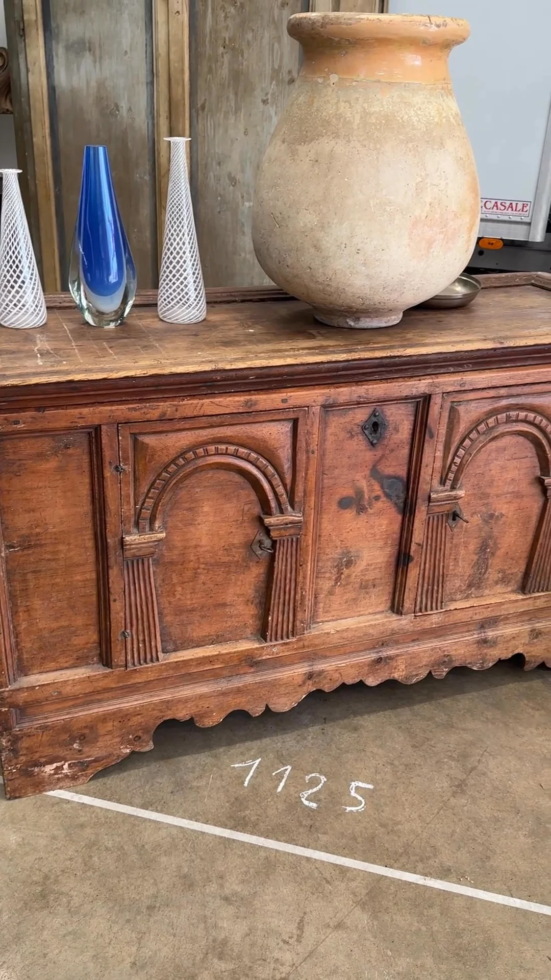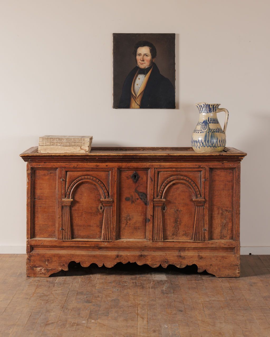 If you’ve ever wanted a sideboard that looks like it came straight out of an 18th century French dining room, this is the one. Found in Montpelier, it’s built from wide planks with those beautiful carved arch panels across the front, a deep overhanging top, and a scalloped base that gives it a little je ne sais quoi. Originally, pieces like this were used to store serving linens, platters, and the good silver, and this one still has that generous, wide-open interior (no shelves) plus two original keys that actually come with it. Use it now as a dining room sideboard for table linens and extra serveware, or in an entry as a serious storage piece that still looks elegant while doing the work.