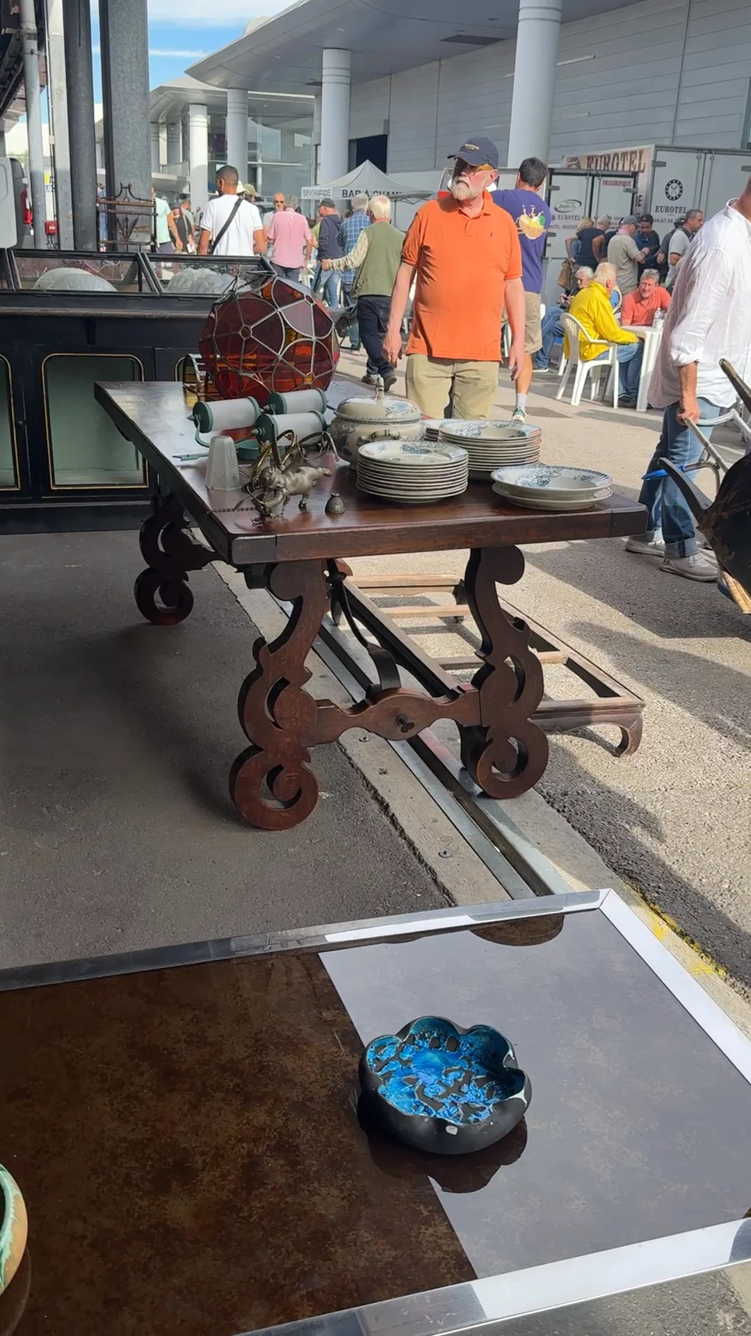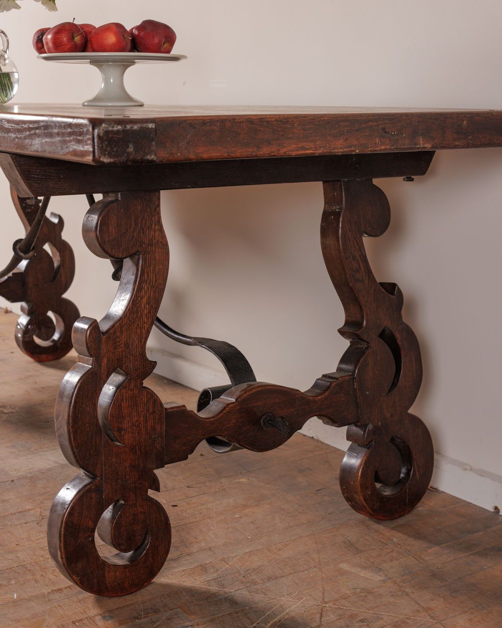 This Spanish dining table carries the unmistakable silhouette of Iberian craftsmanship, with a thick plank top, outward-angled legs, and the sweeping wrought-iron stretchers that tie everything together perfectly. Tables like this appeared throughout central and northern Spain in the 18th and 19th centuries, built heavy and wide so they could serve as both dining surfaces and household work tables in stone farmhouses and rural masías. The ironwork is more than decoration; these forged arcs provided critical stability for long trestle bases, a hallmark of Spanish vernacular furniture.Sylvie brings pieces like this into the modern home as a centerpiece for everyday life, pairing its old-world presence with blue and white ceramics, generous linen, and easygoing meals that stretch long into the night.