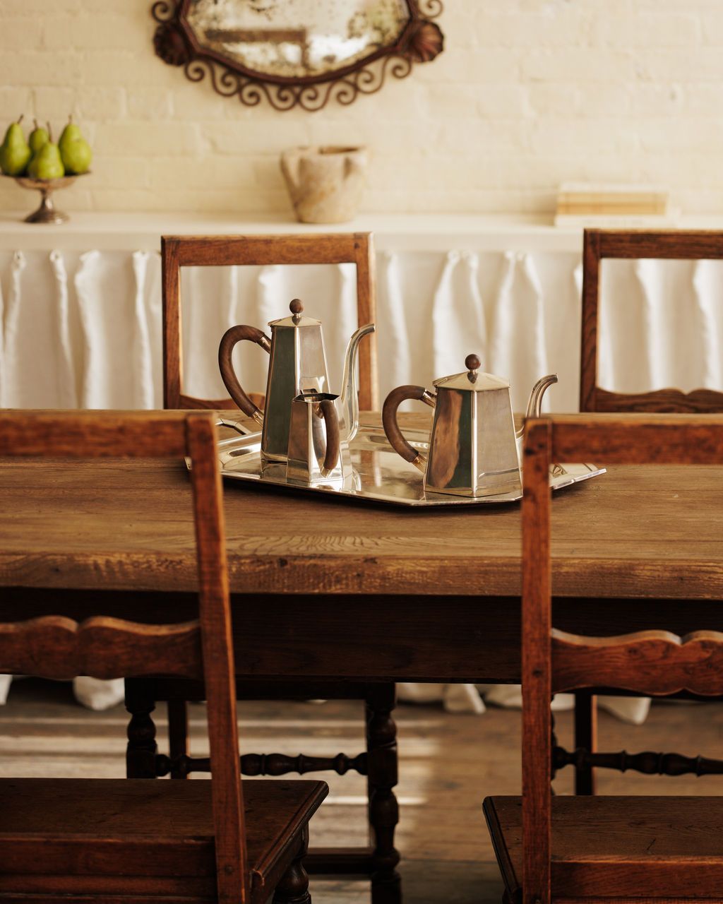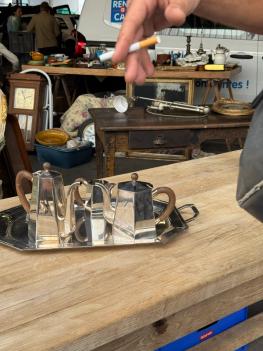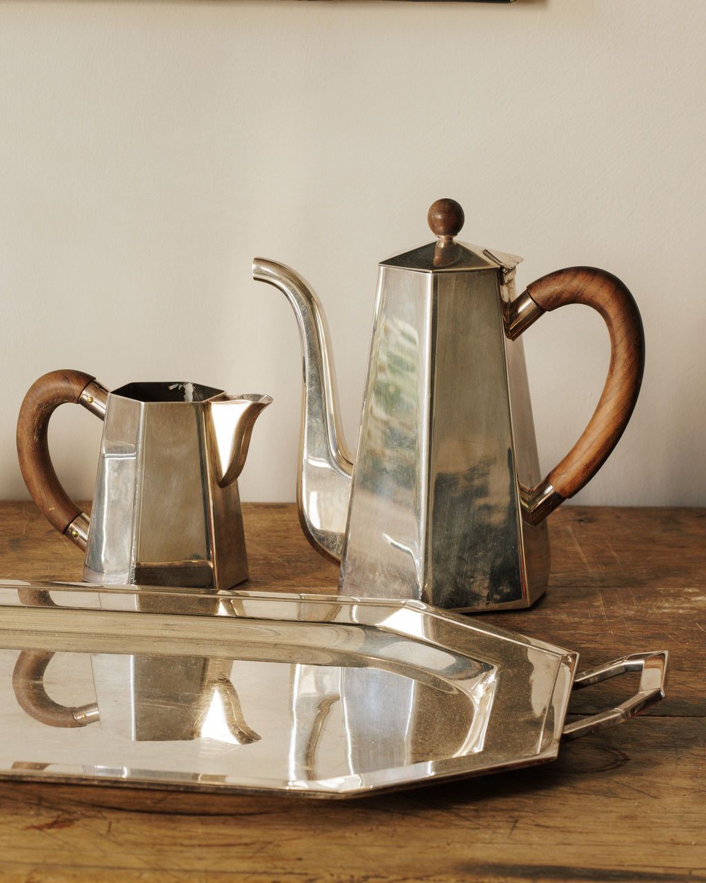 Ooh la la! Found in France and dating to the 1940s, this Art Deco coffee service is a five-piece set that feels extremely elegant. Most likely made from silver plate, the faceted silhouettes are unmistakably of the period - softened by warm wooden handles that sit comfortably in the hand. The set includes a coffee pot, tea pot, sugar bowl with lid, creamer, and an original serving tray that ties everything together. The bottom of each piece is stamped with the manufacturer's stamp 'St James'. Sylvie loves this set displayed as a group - on a sideboard or bar - where it can be appreciated as much for its form as for what it was made to do.