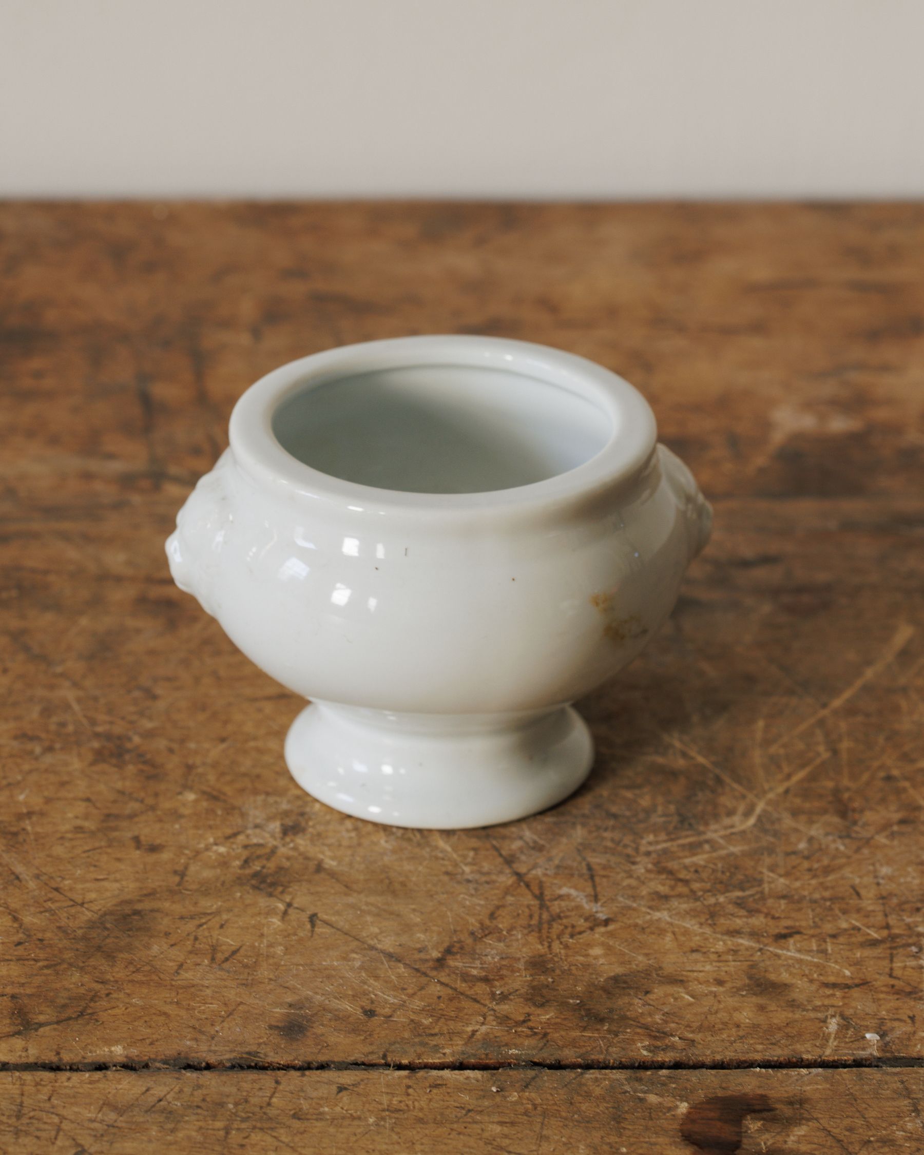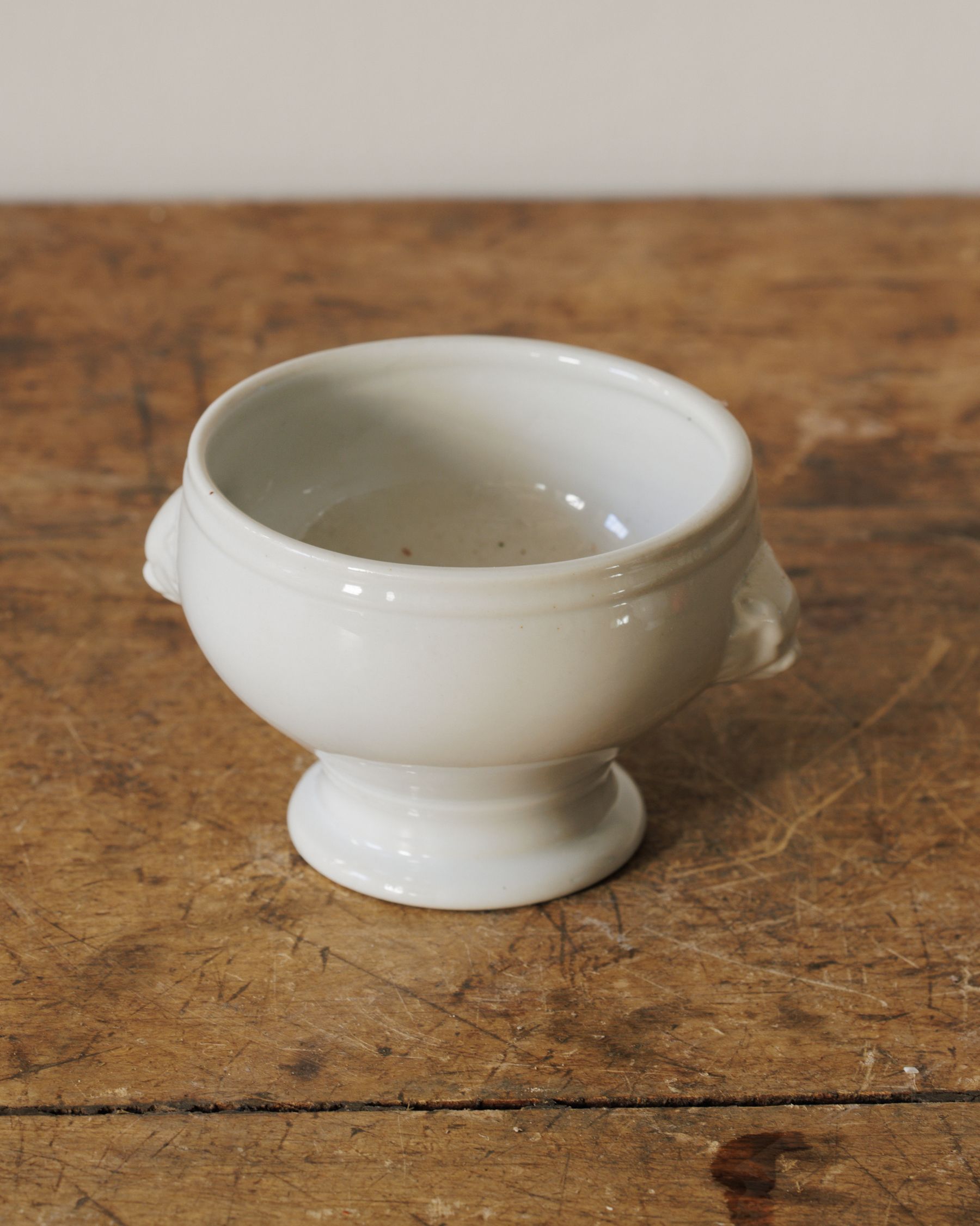 A French lion-head tureen, the miniature kind you spot at old bistros and instantly want to steal. Found in two sizes — small and medium. Made from sturdy porcelain, each bowl has its little pedestal base and those sculpted lion handles that originally cradled individual portions of soupe à l’oignon. Sylvie reaches for them for just-right bowls of soup, a scoop of something sweet, or a handful of olives on an apéro table. Sold individually.