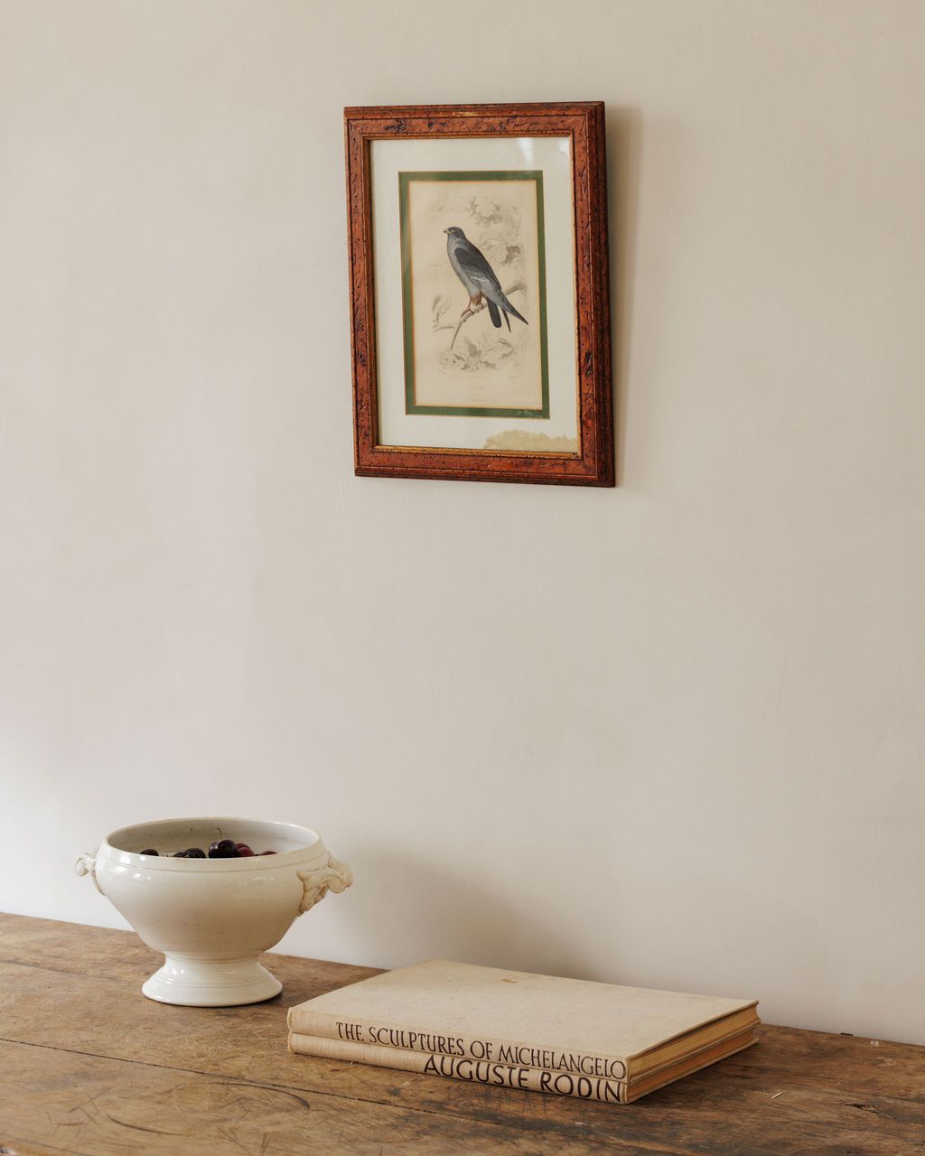 This framed print features a sleek gray bird perched lightly on a branch, illustrated with the fine linework and soft coloration typical of early 1900s natural history studies. The warm wood frame adds structure without overwhelming the delicacy of the artwork, and Sylvie found this piece in Provence, chosen from a private collection after Simon welcomed her into his bastide and let her take her pick from the walls. It works in a hallway, gallery wall, kitchen, or bathroom, adding quiet color and a little feathered attitude.