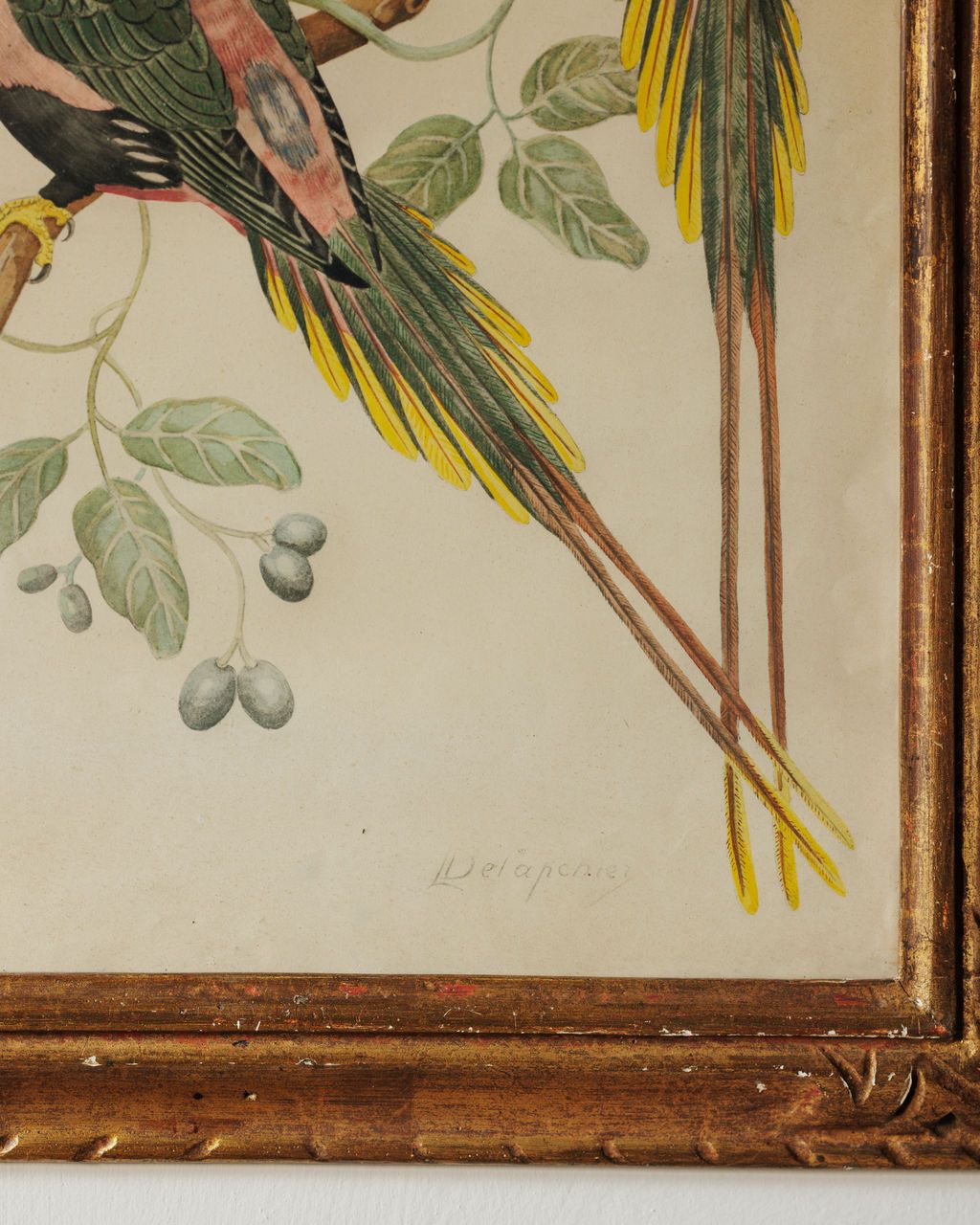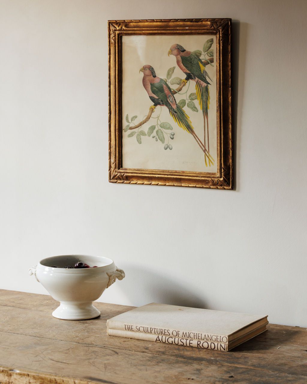 A pair of parrots doing what they do best: stealing the scene. Rendered in the soft colors and fine detailing typical of early 1900s natural history artwork, they sit perched on leafy branches with easy confidence. Sylvie found this piece in Provence, chosen from a private collection after Simon welcomed her into his bastide and let her take her pick from the walls. It works in a hallway, gallery wall, kitchen, or bathroom, adding quiet color and a little feathered attitude.