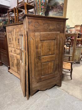 It begins with a marriage. Found in the Cévennes and dating to the late 19th century, this chestnut armoire was made or commissioned as a wedding piece, part of a bride’s trousseau and often one of the most important objects she brought into her new home. In rural France, these cupboards were filled before the wedding day with hand-stitched linens, sheets, and tablecloths prepared over years, then carried into the household as both a practical necessity and a quiet signal of readiness, care, and family standing. The carvings across the crown - simple hearts and rosettes speak to that moment, small symbols tied to union and continuity rather than decoration alone. Built in chestnut, the wood most common to the Cévennes for its strength and resistance, it was made to hold those linens for decades, opened and closed as part of the daily rhythm of the home. Sylvie loves it returned to that role, doors opening onto neatly stacked linens once again, exactly as it was meant to be.