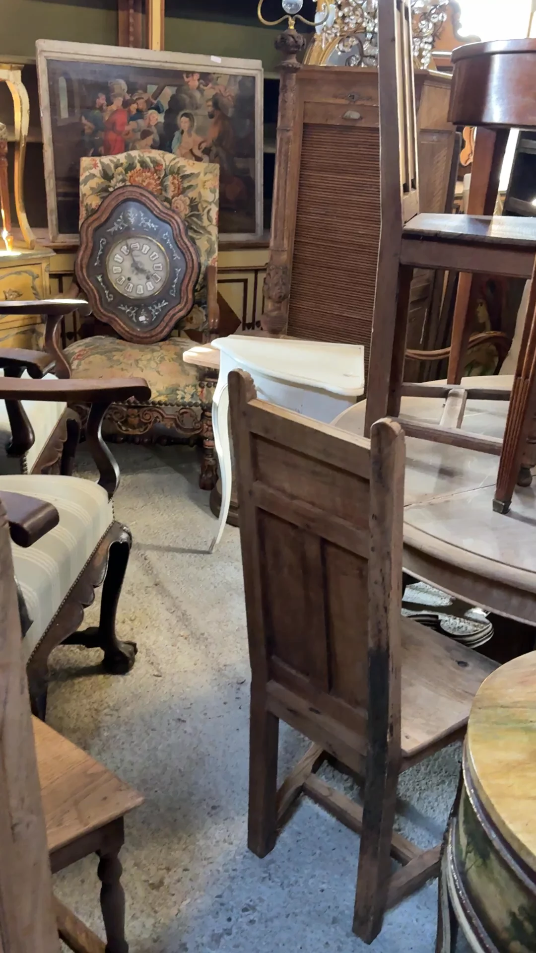 This one leans a little taller than you expect, which is exactly why it works. Found in Avignon and originally from a monastery near Maussane, this 19th-century chair would have been part of a refectory or study room, where seating was built to be durable, upright, and consistent across a space. Monastic furniture was never about decoration, it was about discipline and daily ritual, which is why you see these strong panel backs and straightforward construction. Sylvie loves it pulled up to a table where people actually sit for a while. Six available, sold individually.