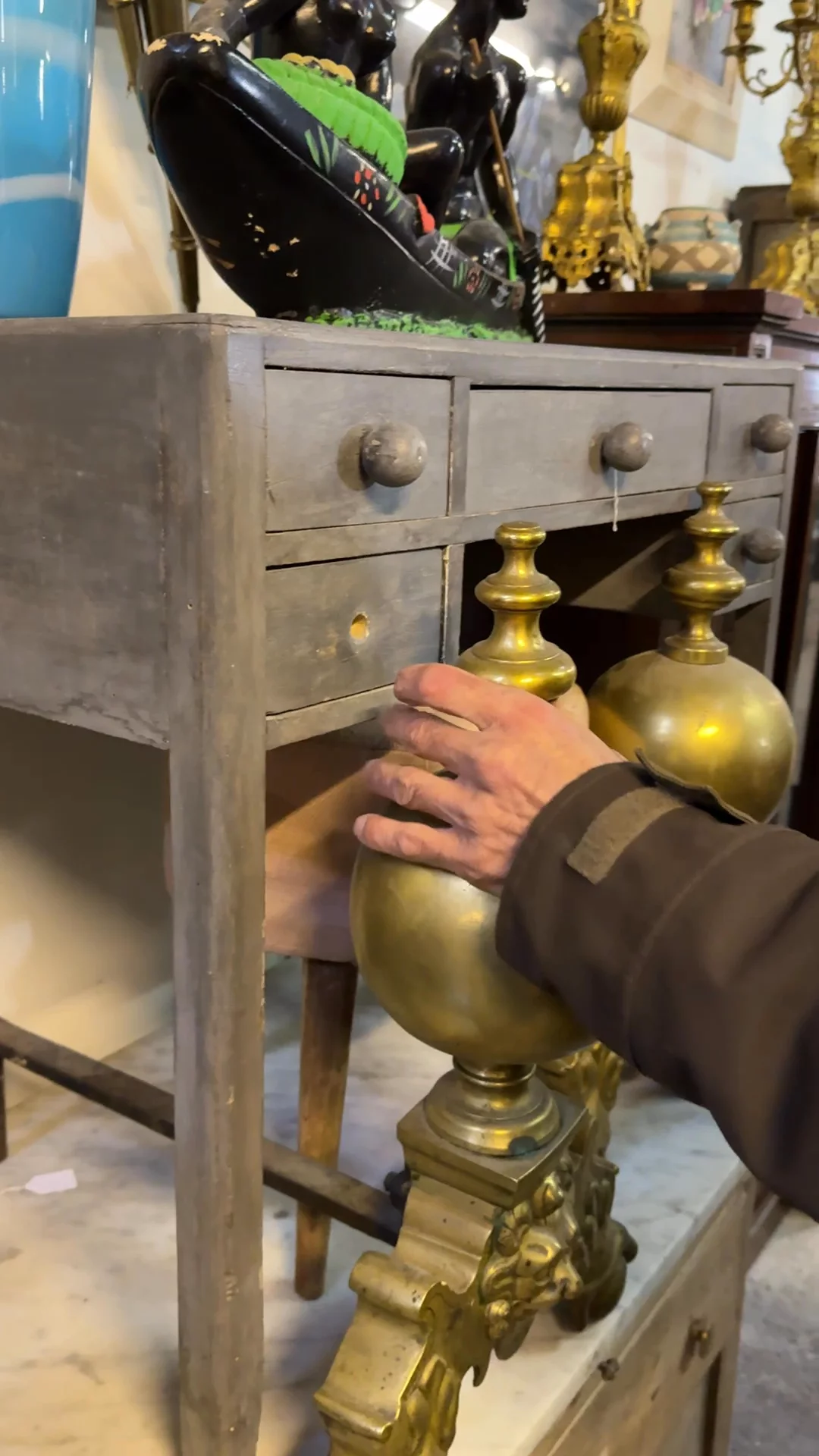A thoughtful little desk with a very practical past. Found in Avignon, this 1930s French piece was likely made for a child, with its compact proportions and five-drawer layout designed to keep everything in its place. The grey-blue painted wood has a softly worn finish, and the clean lines reflect that early Art Deco restraint. One knob is missing, but it doesn’t take away from its charm. Sylvie would use it as a side table or entry way scene, styled with freshly foraged flowers.